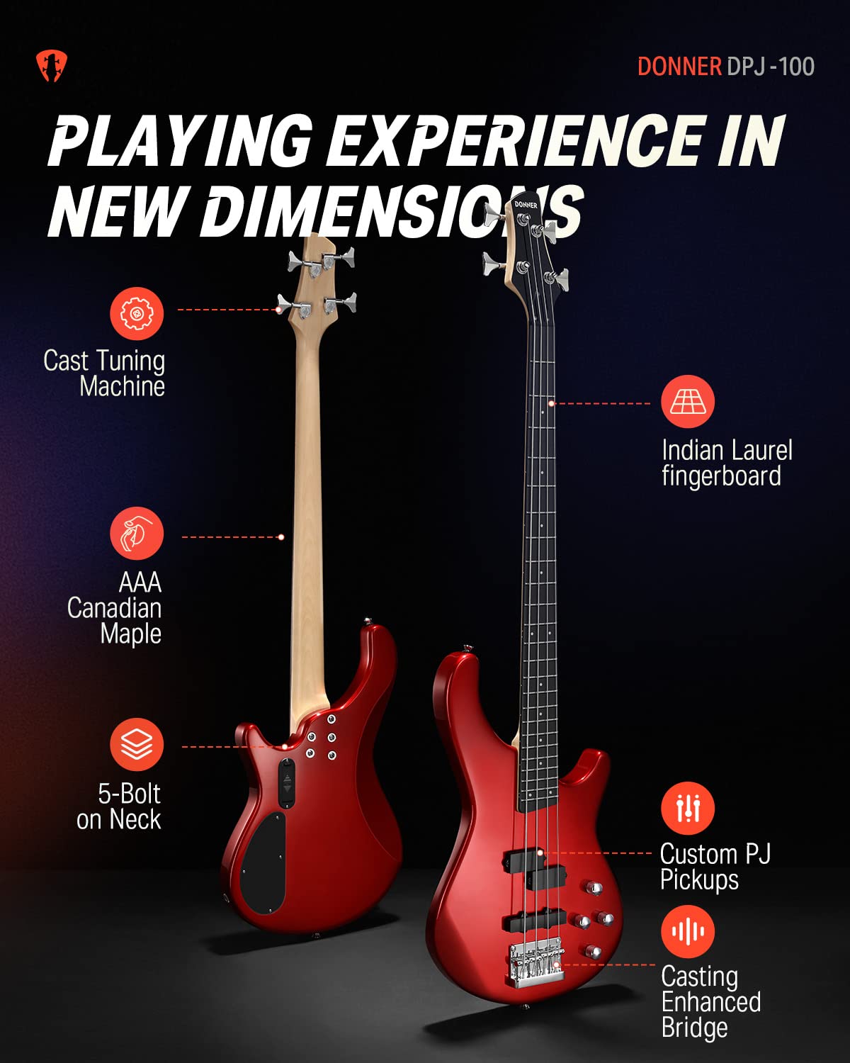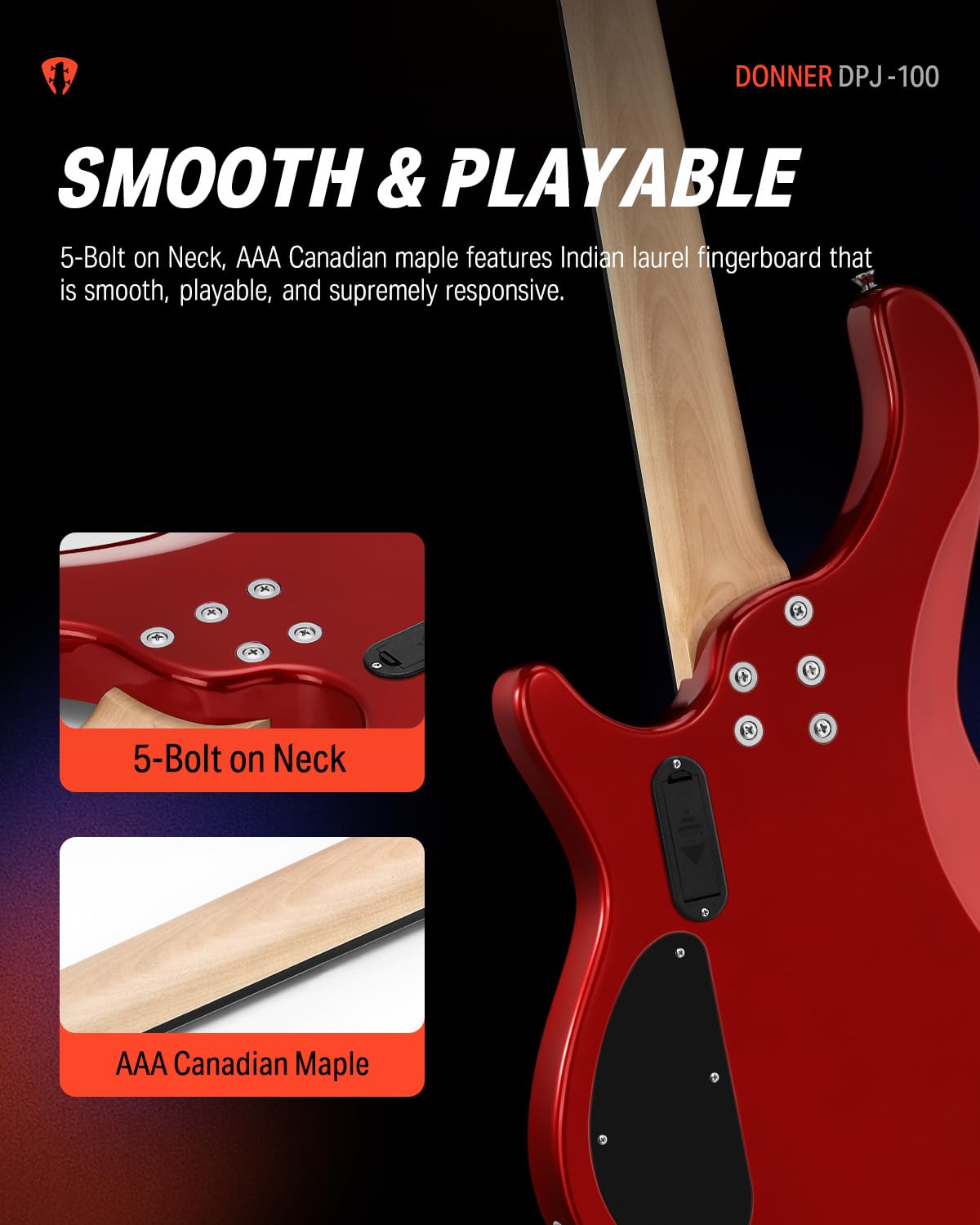 [Premium Bridge]: Donner DPJ-100 electric bass guitar Casting Enhanced Bridge enhances articulation and sustain, each saddle allowing energy to transfer efficiently between the string and the body