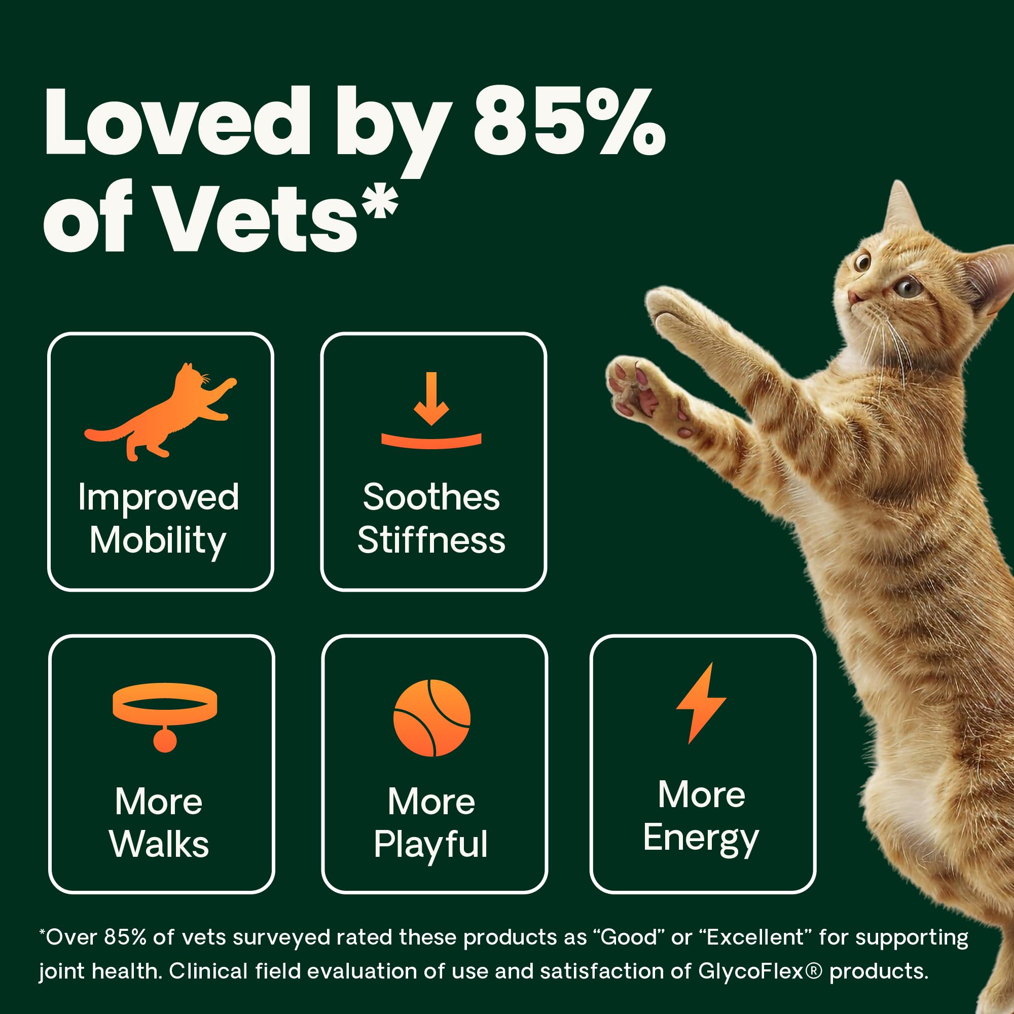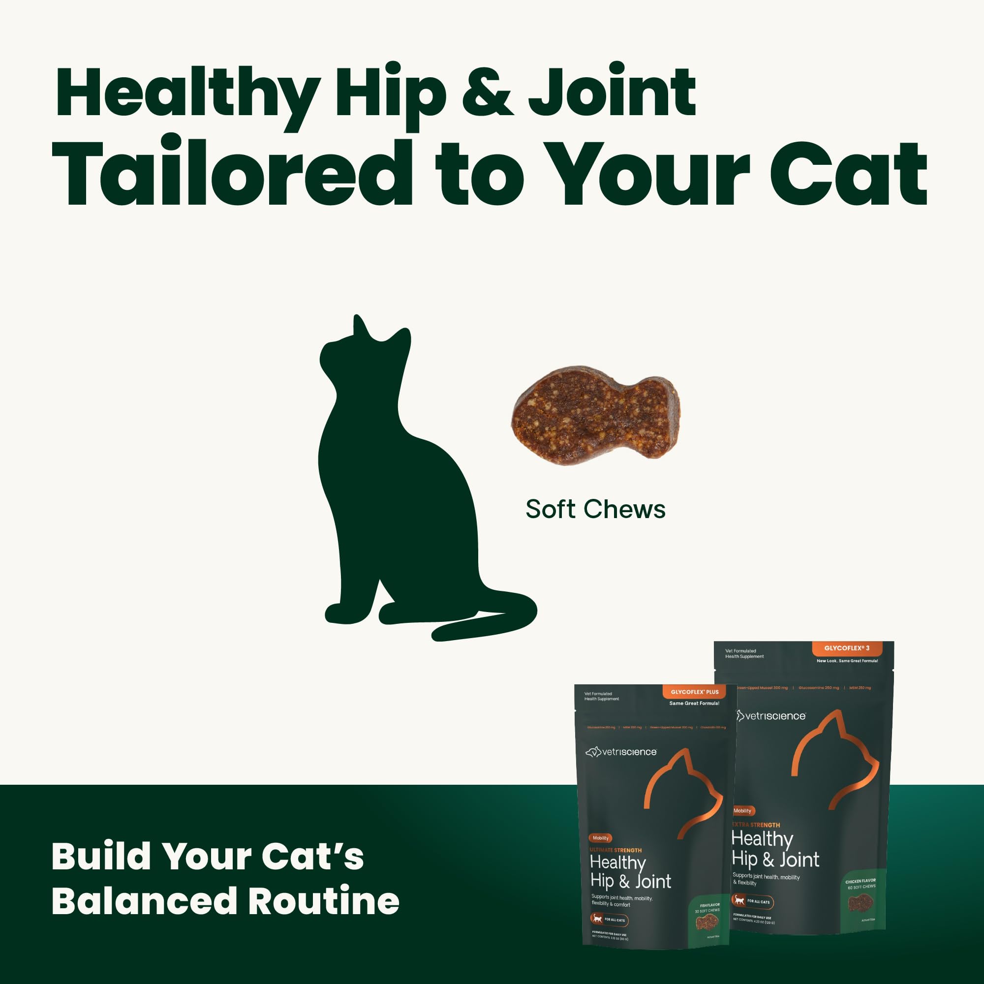 Glucosamine for Cats: Extra Strength Healthy Hip & Joint (previously GlycoFlex Stage 3) is our advanced-strength hip and joint supplement for cats, with powerful levels of active ingredients that work together to help maintain mobility, lubricate joints, and support flexibility