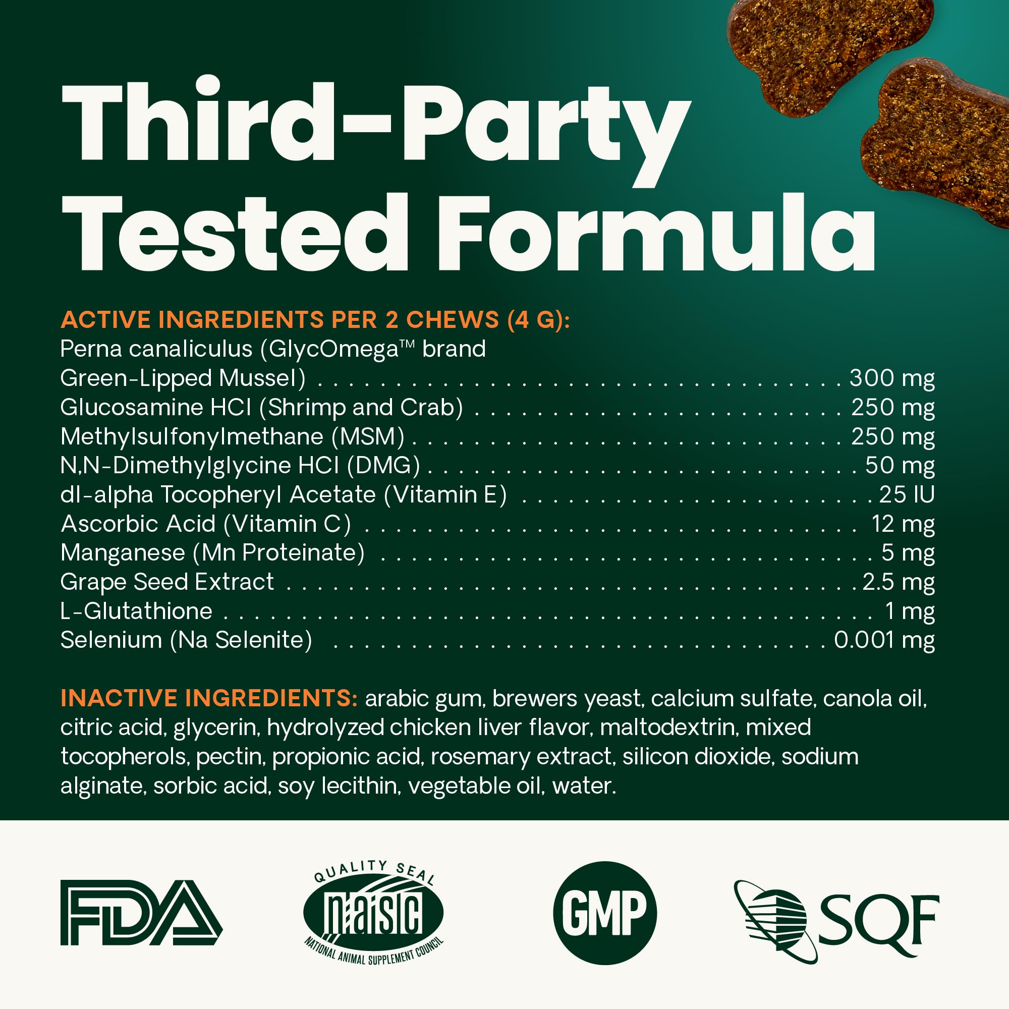 High-Quality Ingredients: Our vet-formulated cat joint supplements are certified by the National Animal Supplement Council (NASC), routinely undergo third-party testing, and contain no hidden ingredients, artificial flavors, or synthetic colors