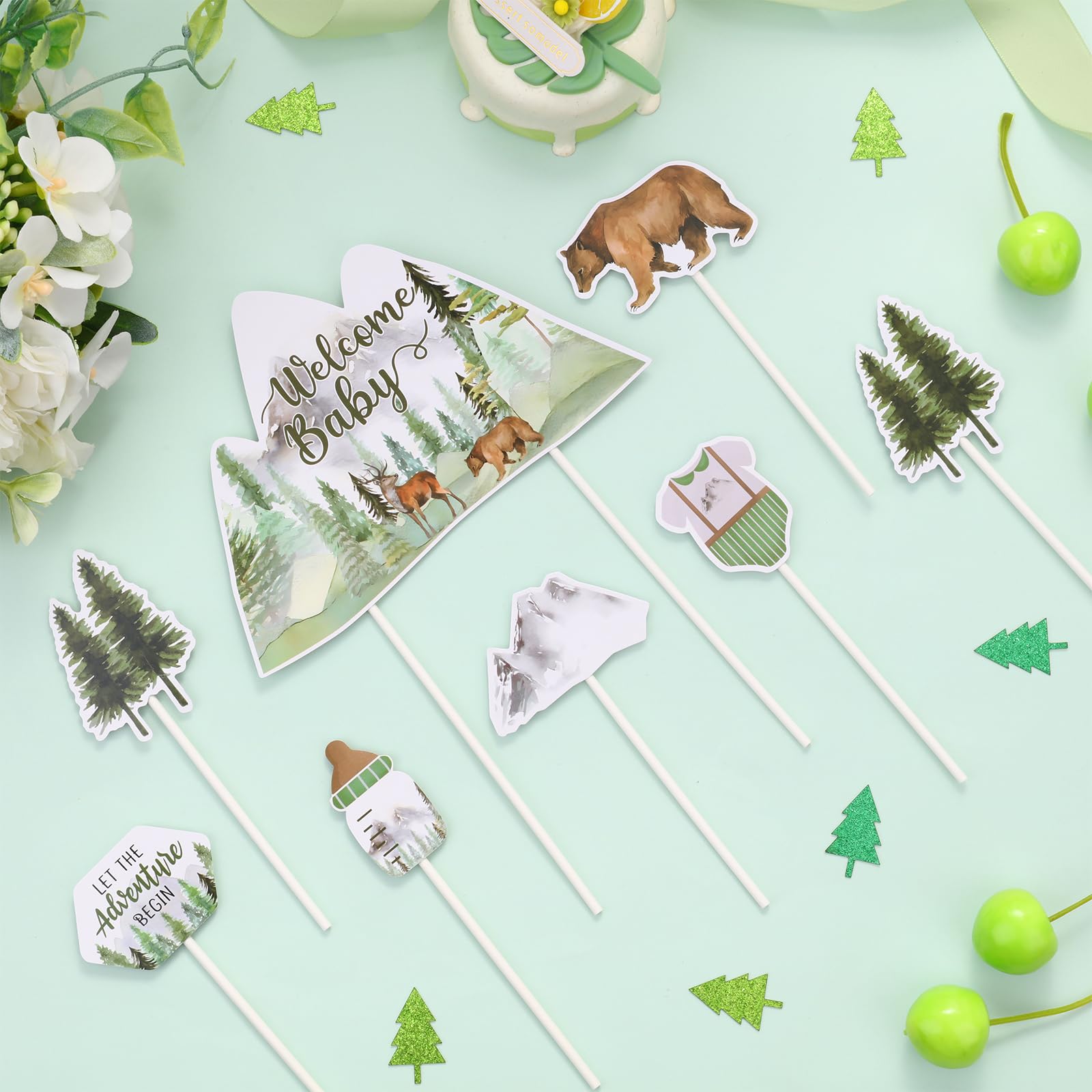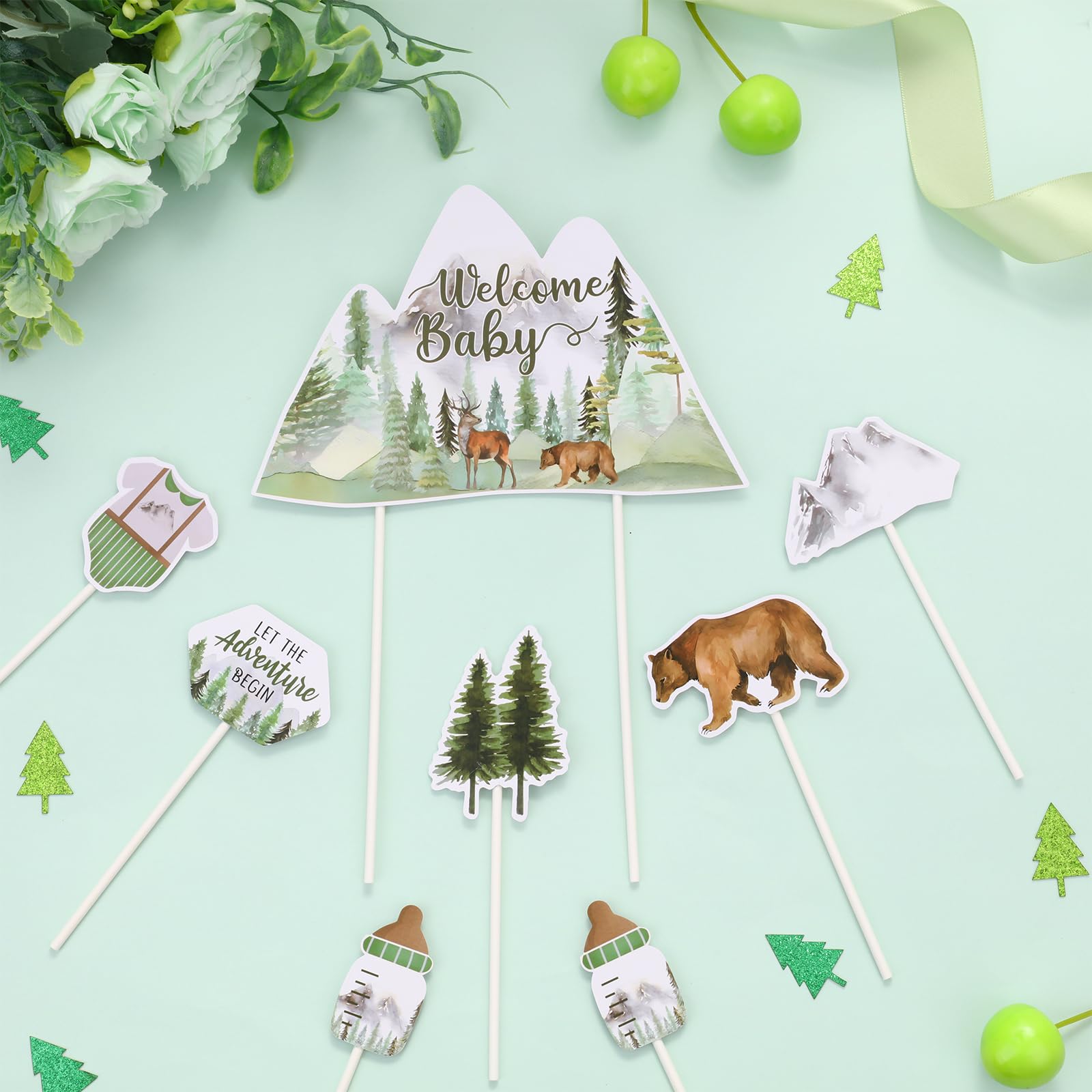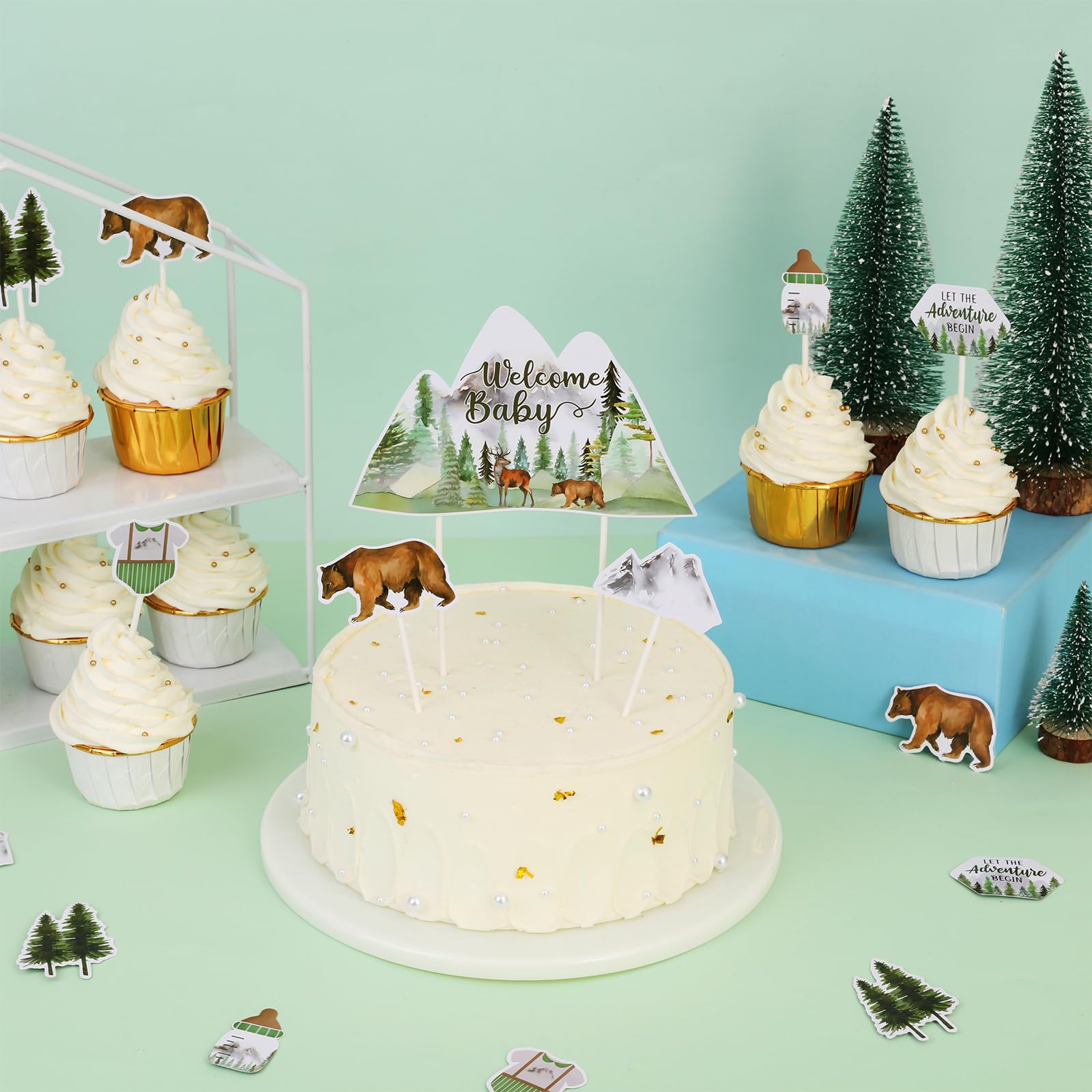 Adventure Camping Baby Shower: Our Let The Adventure Begin baby shower cake toppers are designed in 7 different styles, like bears, mountains, trees, bottles, baby clothes, etc., combining baby shower and camping, adventure elements, adding a very strong forest-themed atmosphere to your party.