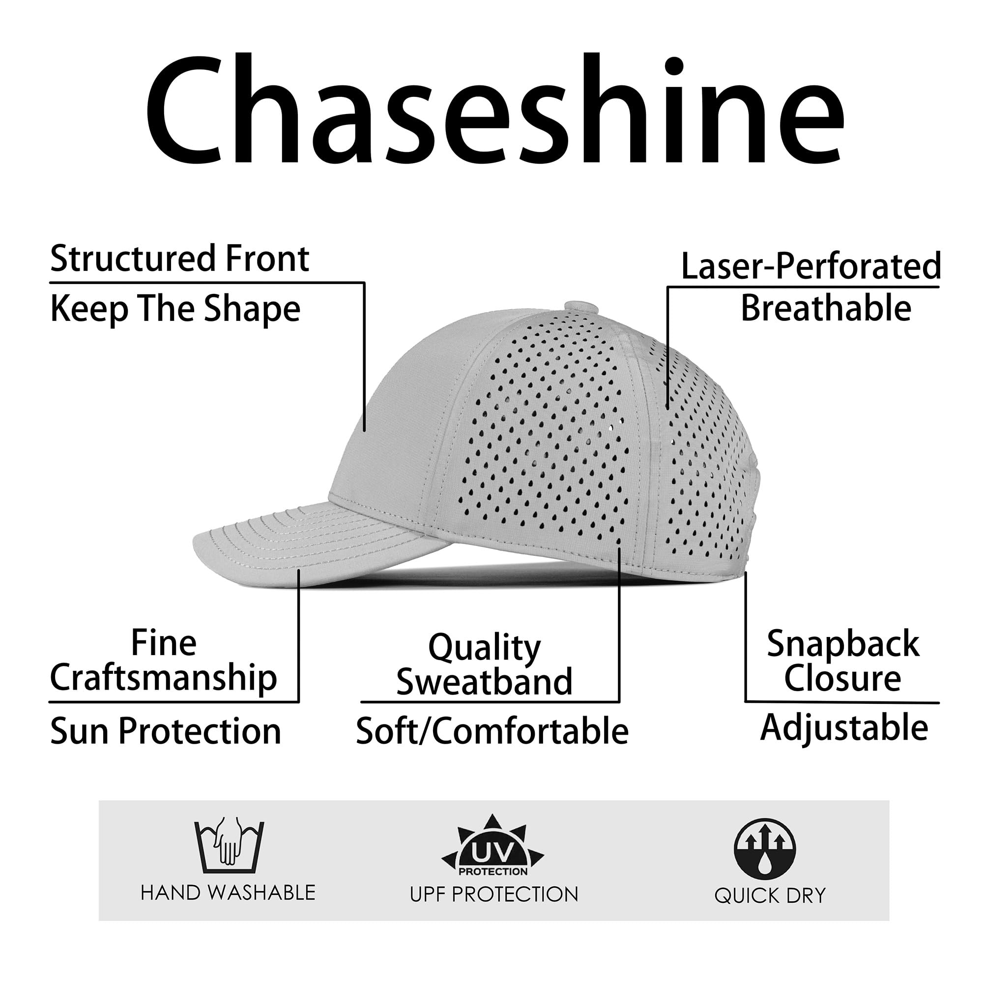 Chaseshine Hat Design: Stylish and functional,structured front panels that maintains shape, 6-panel, curved brim, laser-perforated side & rear panels for breathability, and soft touch adjustable snapback closure