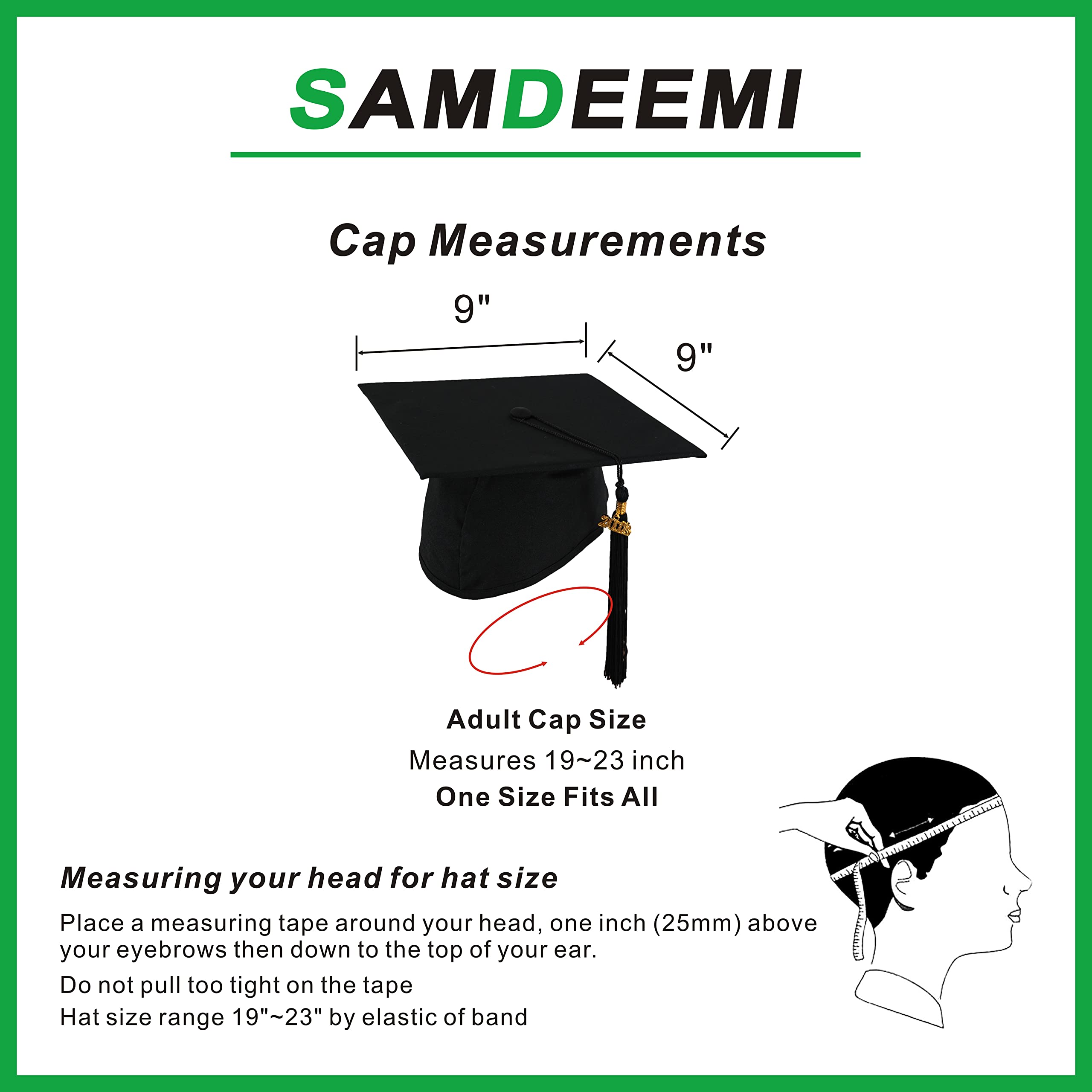 Description In 2003, we established a clothing factory and registered our own brand SAMDEEMI. For more than ten years, SAMDEEMI has been committed to producing high-quality and diversified graduation related products, and providing services for global preschool, high school and college graduates. At present, the company's main products include adult and child graduation hats and gowns, religious robes, cloaks, stoles, shawls, honor cord, accessories, etc. SAMDEEMI hopes our products can bring you surprises. SAMDEEMI Graduation Cap: Graduation Cap: High quality matte polyester and hard board. One size fits all. Board size is 9"x9" (24 x 24cm). The Head circumference of the elastic band is adjustable about 19"~23". Blank design, convenient for DIY, easy to customize. Designing your graduation cap is a perfect way to celebrate new graduation for graduates from high-schoolers to college students. You can get your graduation cap more clever and more impressive with your designs. Tassel + Year Charm: 100% Rayon - Gold Plated Copper Clasp. 9" Tassel Construction 6" Hang Loop Free Moving 2026 Year Charm of Gold Zinc. Note: The cap can not wash. Please be aware that colors might look slightly different in person due to camera quality and monitor settings. Hope you'll enjoy your graduation ceremony with this Graduation Gown Cap set. Best wishes and congratulations to you all.