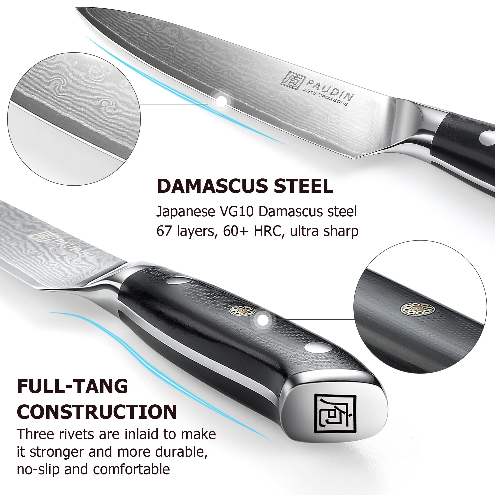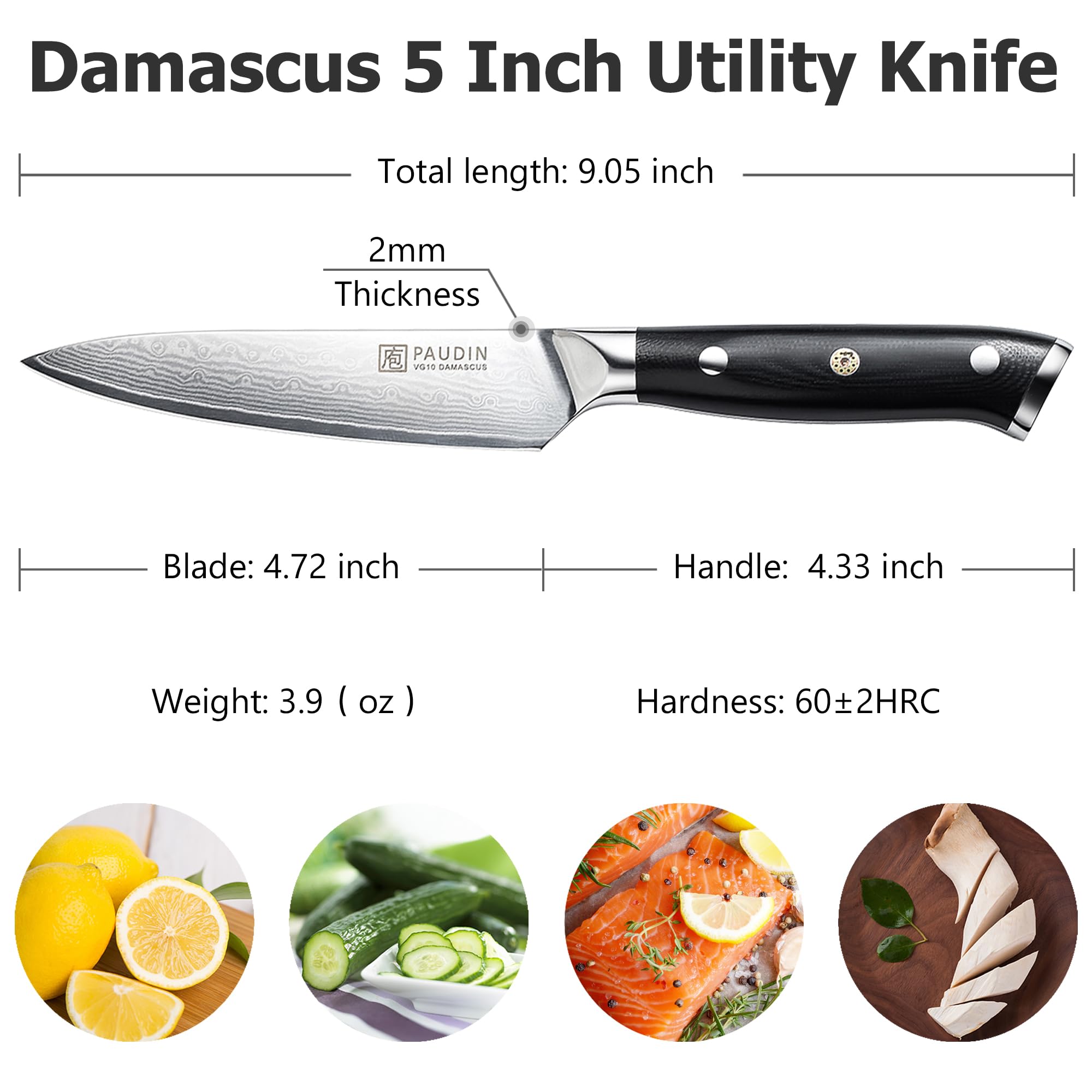 STAINLESS STEEL KITCHEN UTILITY KNIFE: This utility knife is forged from Japanese VG10 Damascus steel to give it an extraordinary hardness (60+ HRC). High-quality steel creates good edge retention and reduces the frequency of sharpening. This knife is the best option in the kitchen because of its long-lasting performance and professional durability, ultra-high hardness and toughness, rust prevention, and corrosion resistance.