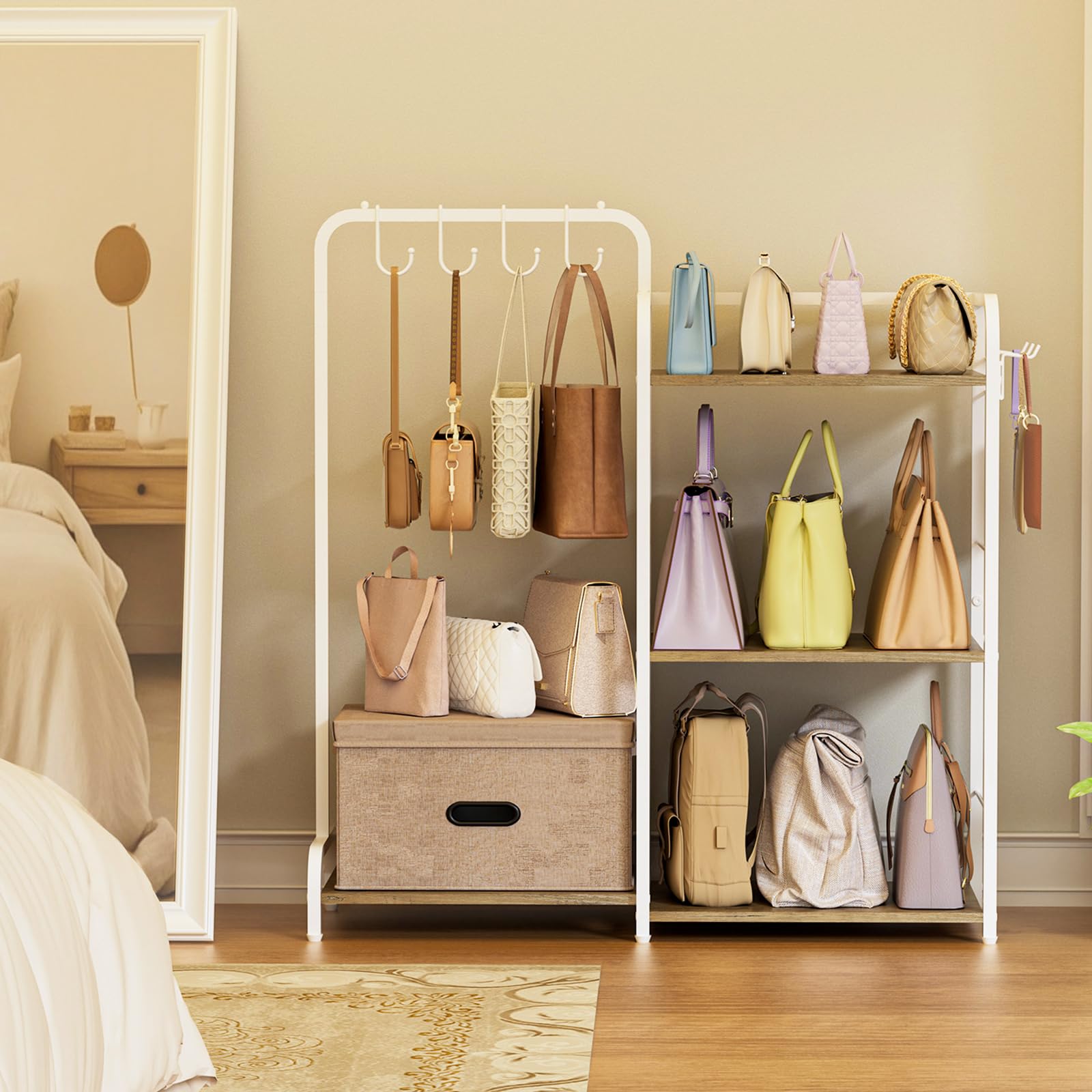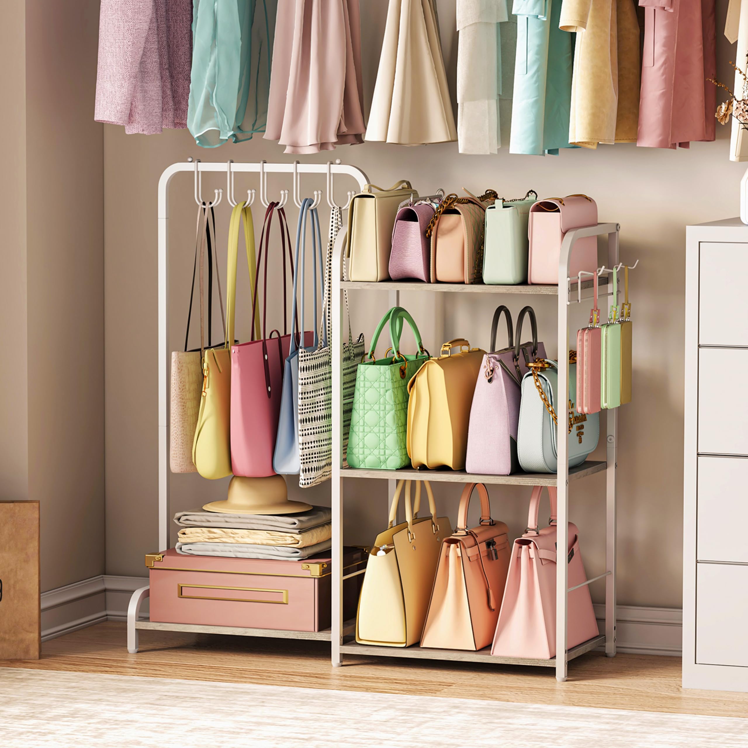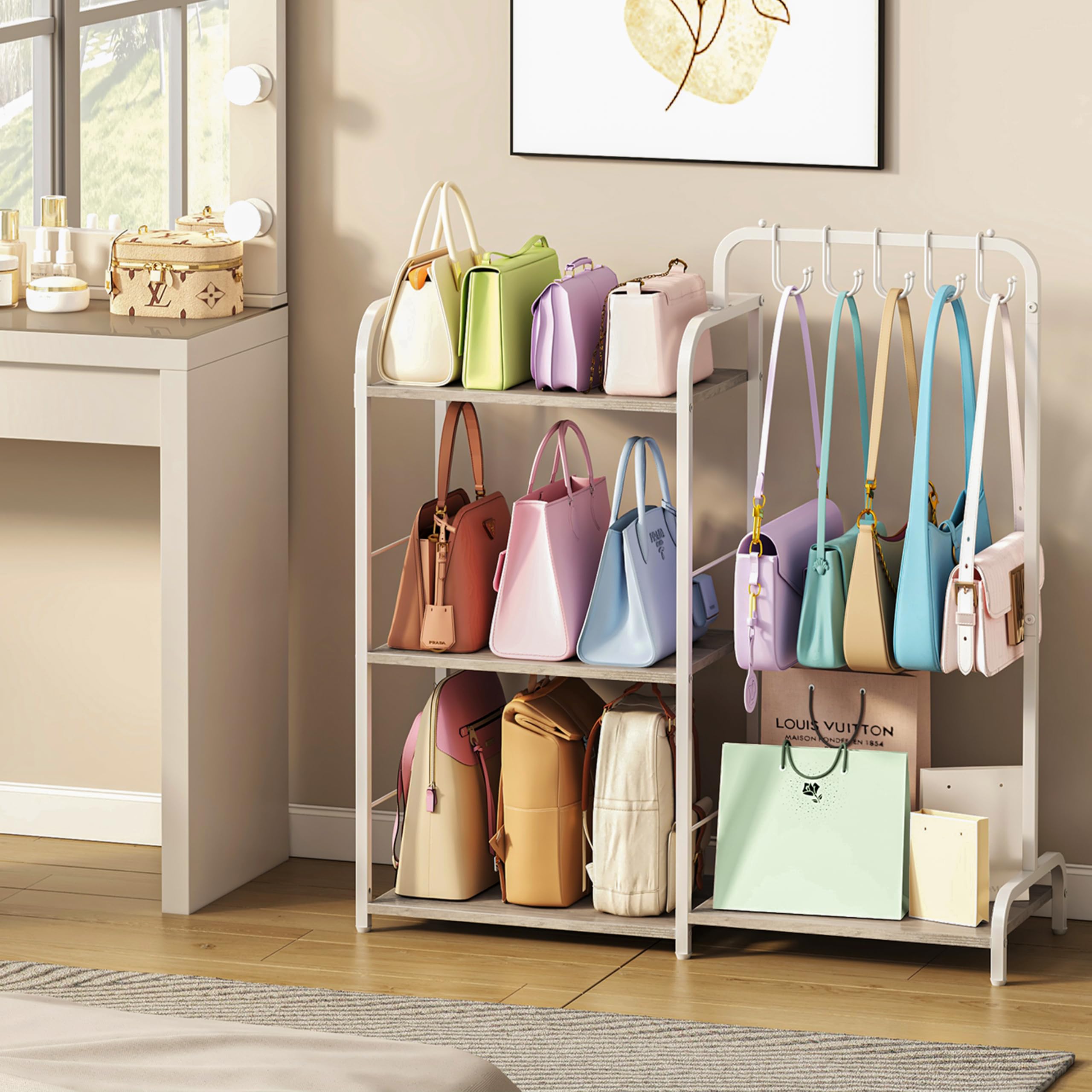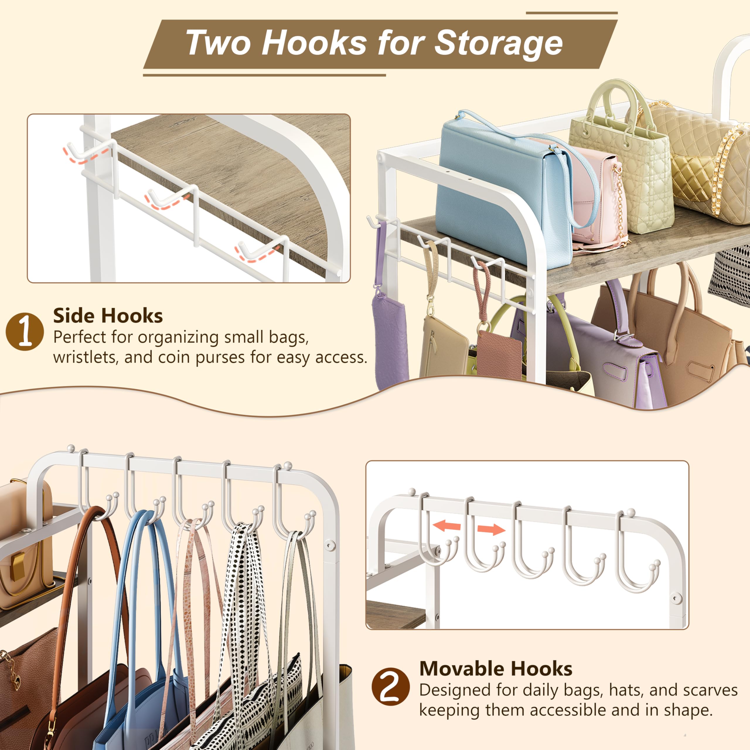 【Flexible Setup to Fit Any Room】 You can arrange the two sides however you like—place the shelves on the left or right to suit your space. With adjustable hooks and roomy tiers, it works perfectly for all bag sizes, from clutches to large totes.