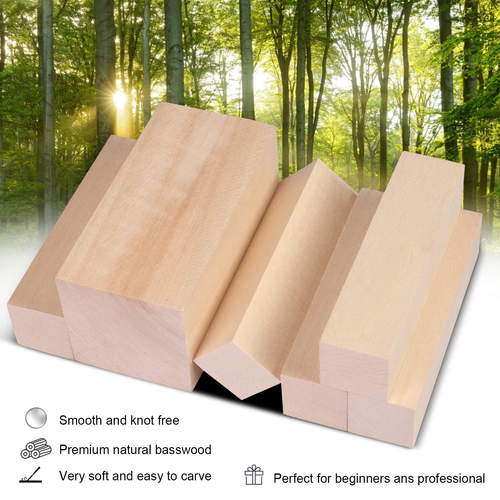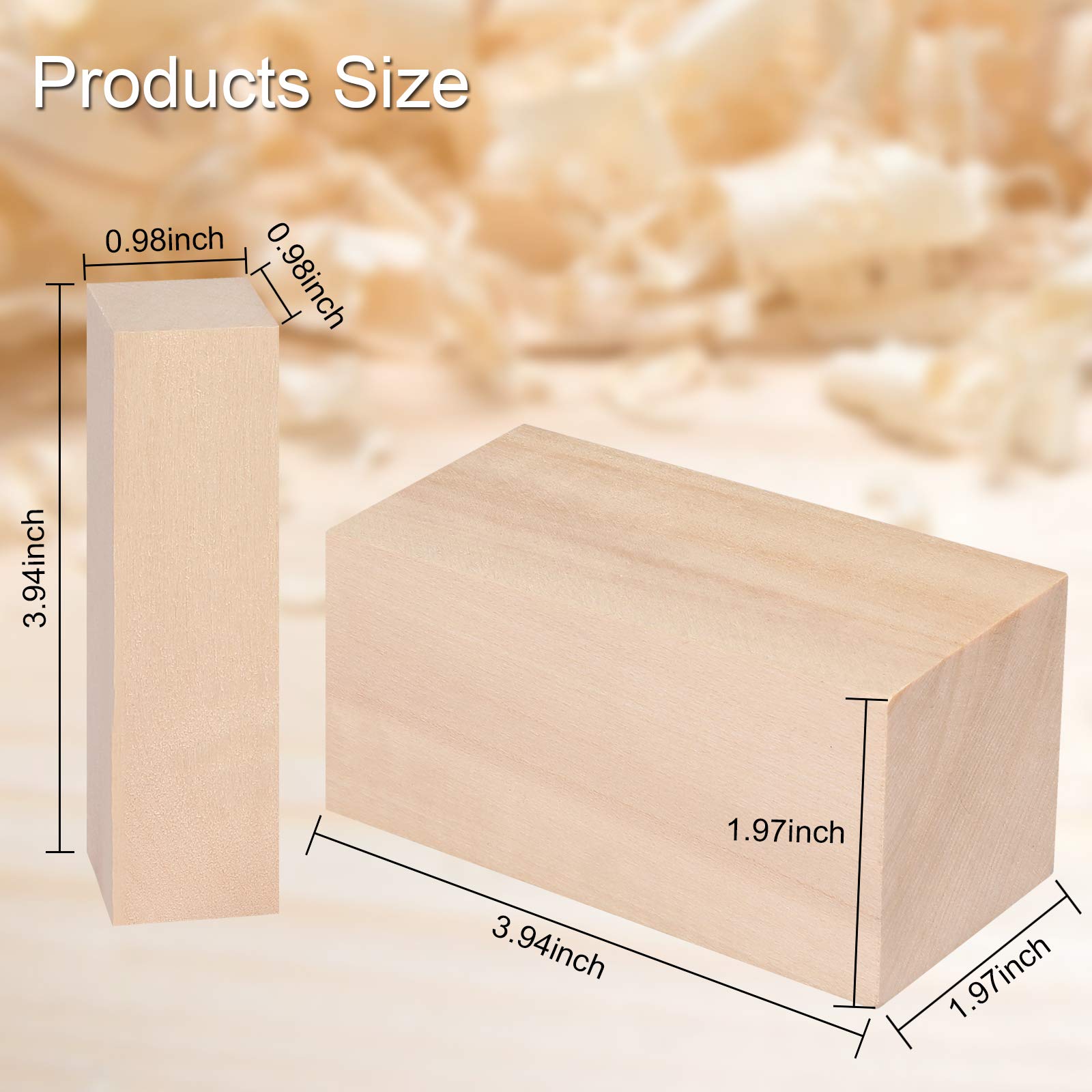 The basswood is very soft and light, can being easy to work, suitable for every art project and can bring many interesting projects to your life Basswood specification: Size: 4*2*2inch and 4*1*1inch Material: Natural basswood Package Include: 7pcs basswood for wood carving Basswood Carving Blocks Set Feature: ☛100% premium natural basswood made, no any chemical additives ✄The soft, delicate and uniform material makes it very easy to carving, whittling and shaping creative wood project, DIY craft and so on ❈Our basswood blocks provide a smooth surface without spots and crack for your whittling projects and great to practice for a beginner ☂This basswood carving wood will never detract from the carved patterns of the finished products ♨Perfect gift for boys and girls (especially those who like craving), or as a fantastic gift for special occasions and holidays, such as birthdays, Christmas, dates, etc Warm Tips: Store in dry conditions Do not close to the fire ☏If our wood blocks for carving has any quality problem, please feel free to contact us to get a full refund or a free replacement