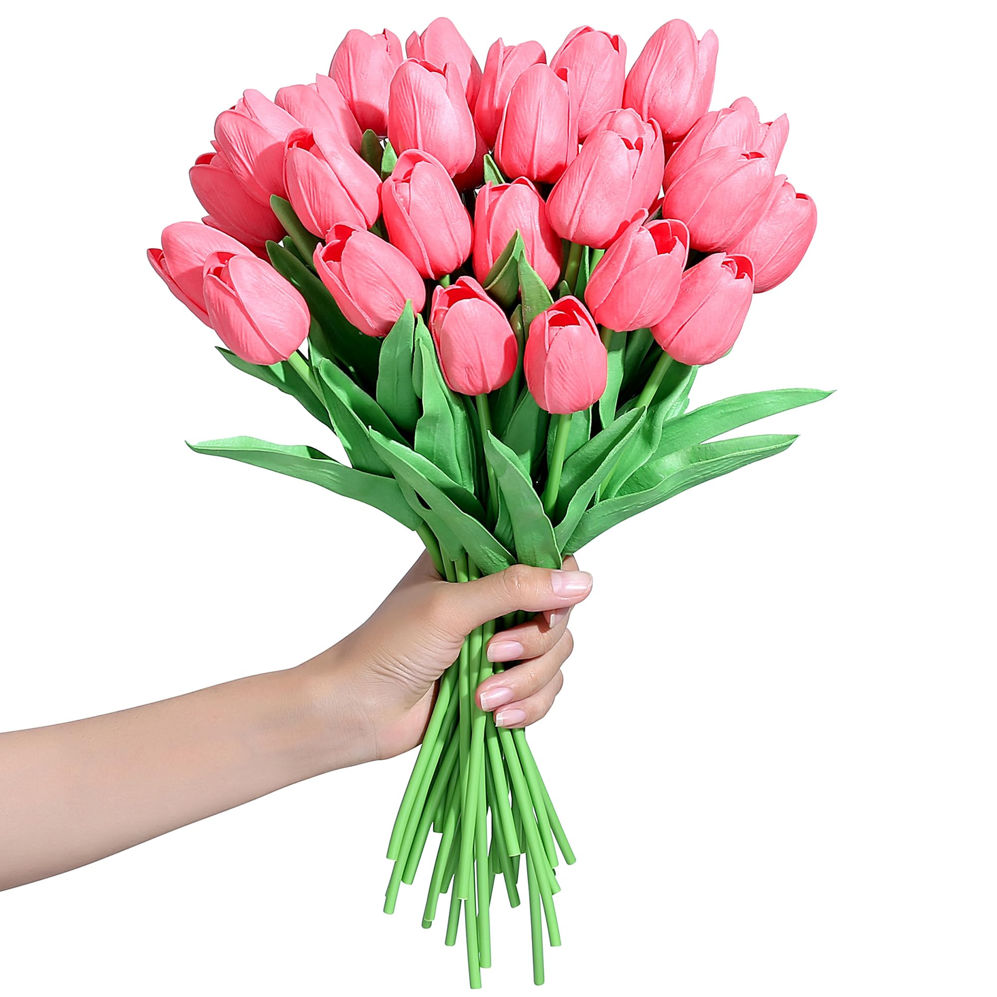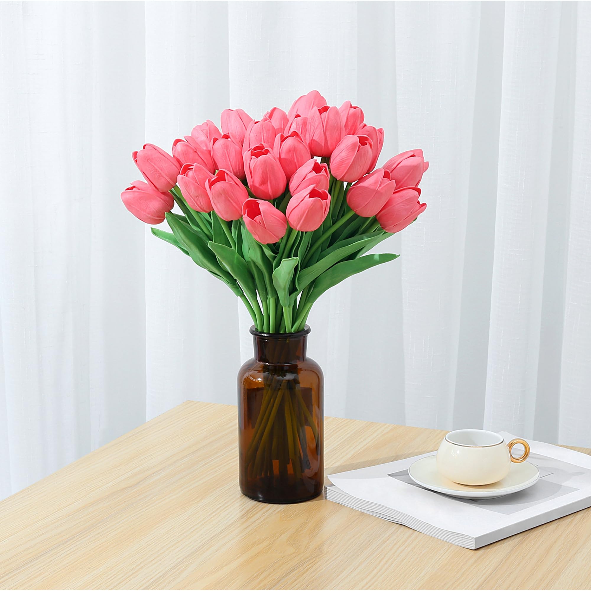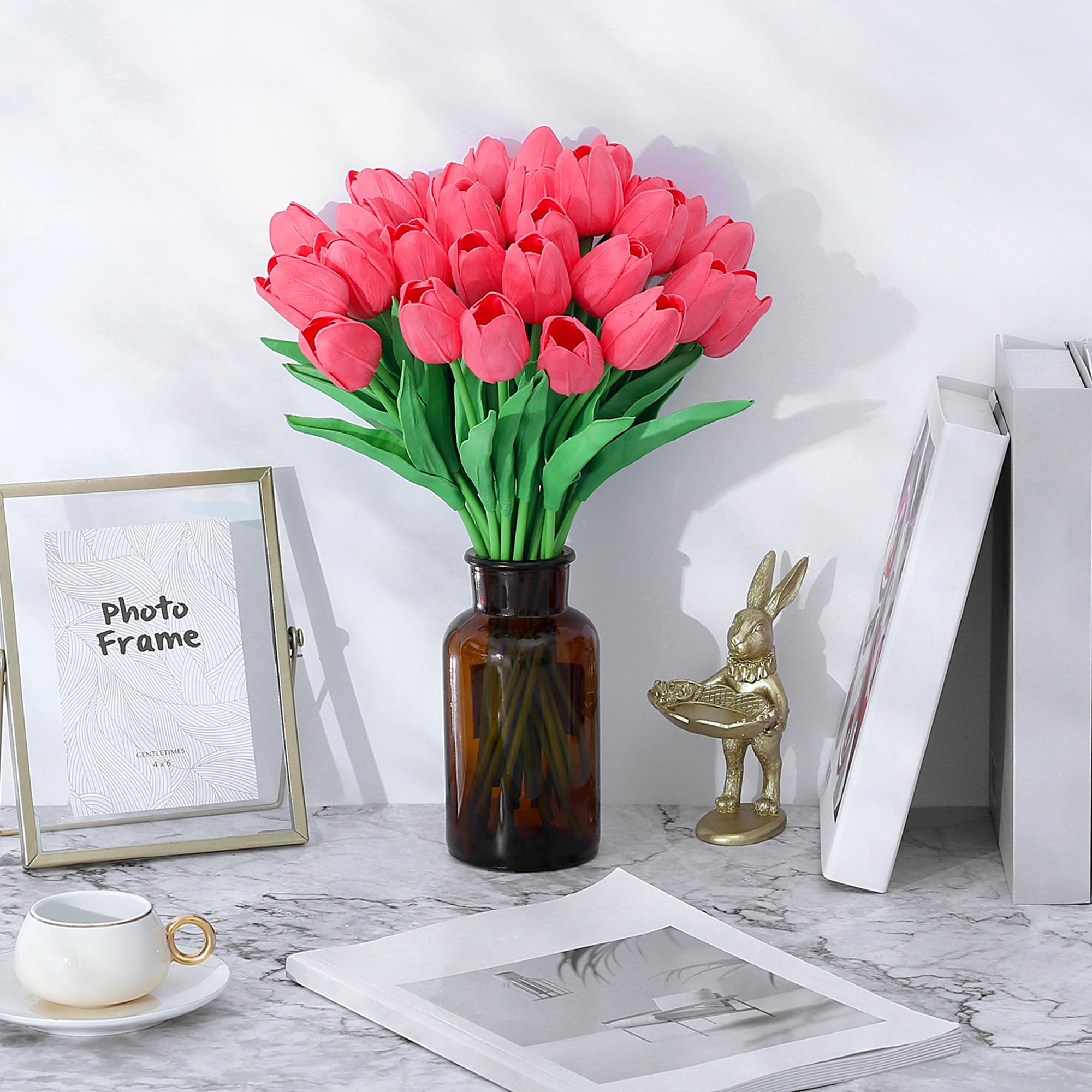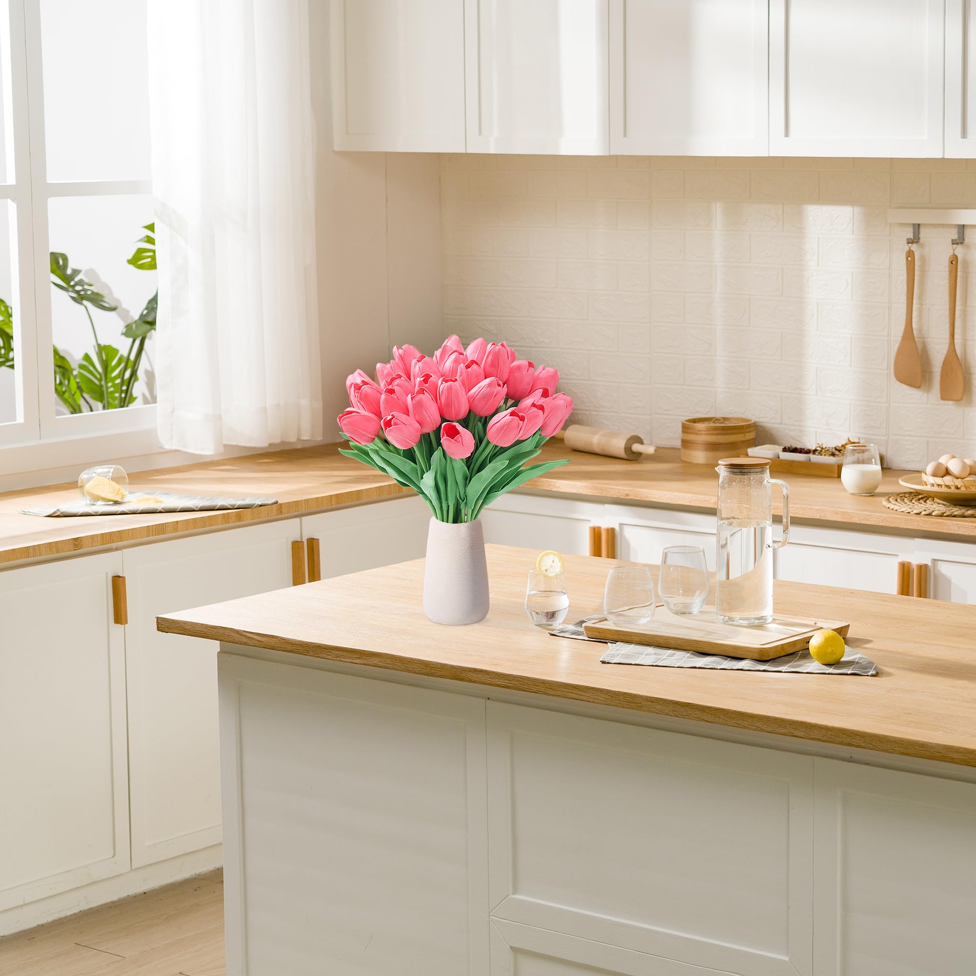 【Size of faux tulips】Faux flowers tulips' size is 14"/35cm.Including 15pcs tulips per pack and vase not included.