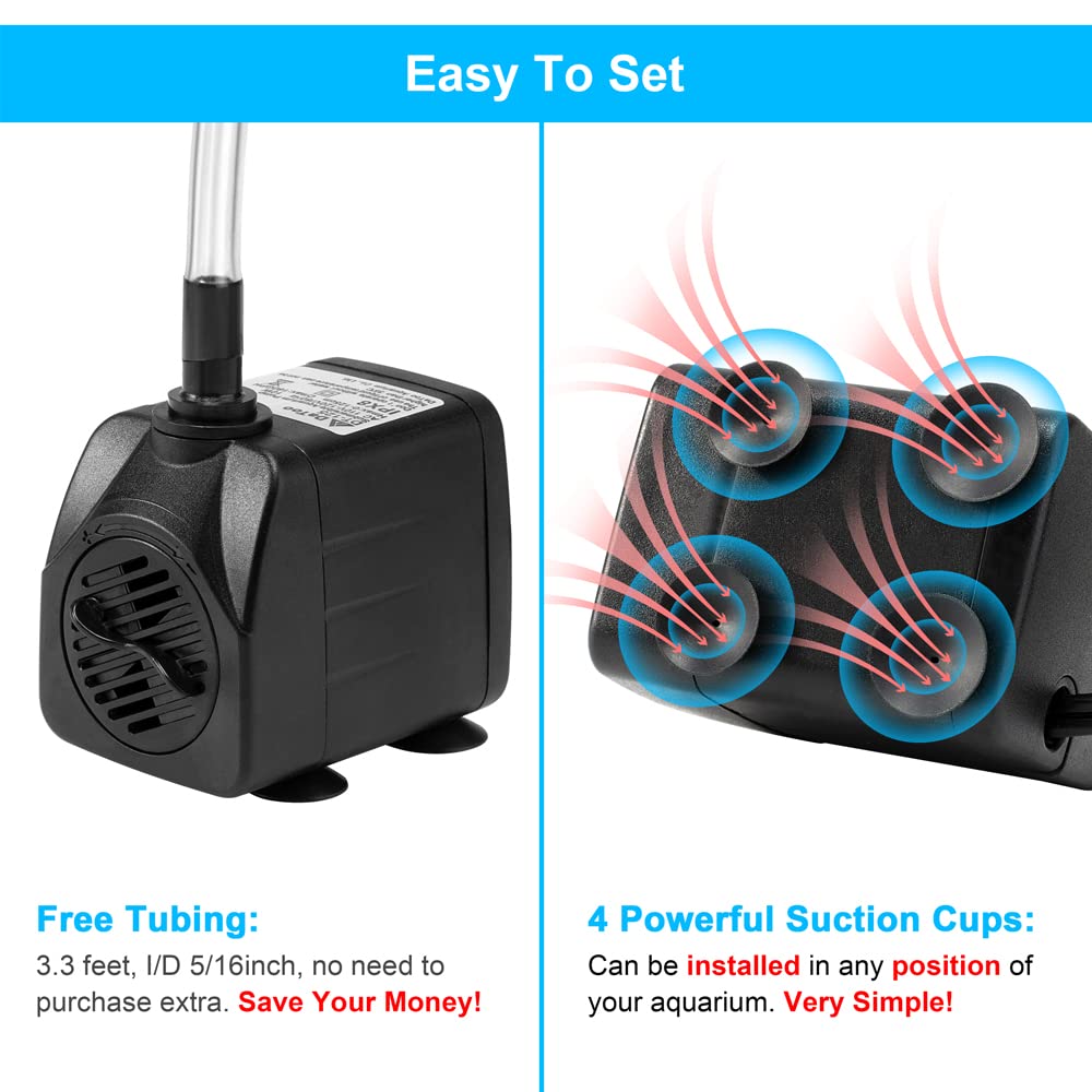 【Easy To Set & One Year Warranty】: DaToo water pump comes with an additional nozzle and 3.3ft free tubing. 4 powerful suction cups, can be installed in any position of your aquarium, very simple! One Year Warranty and 24 Hours Professional Customer Service. Buy DaToo products with confidence. JUST DO IT, Let’t Go!!