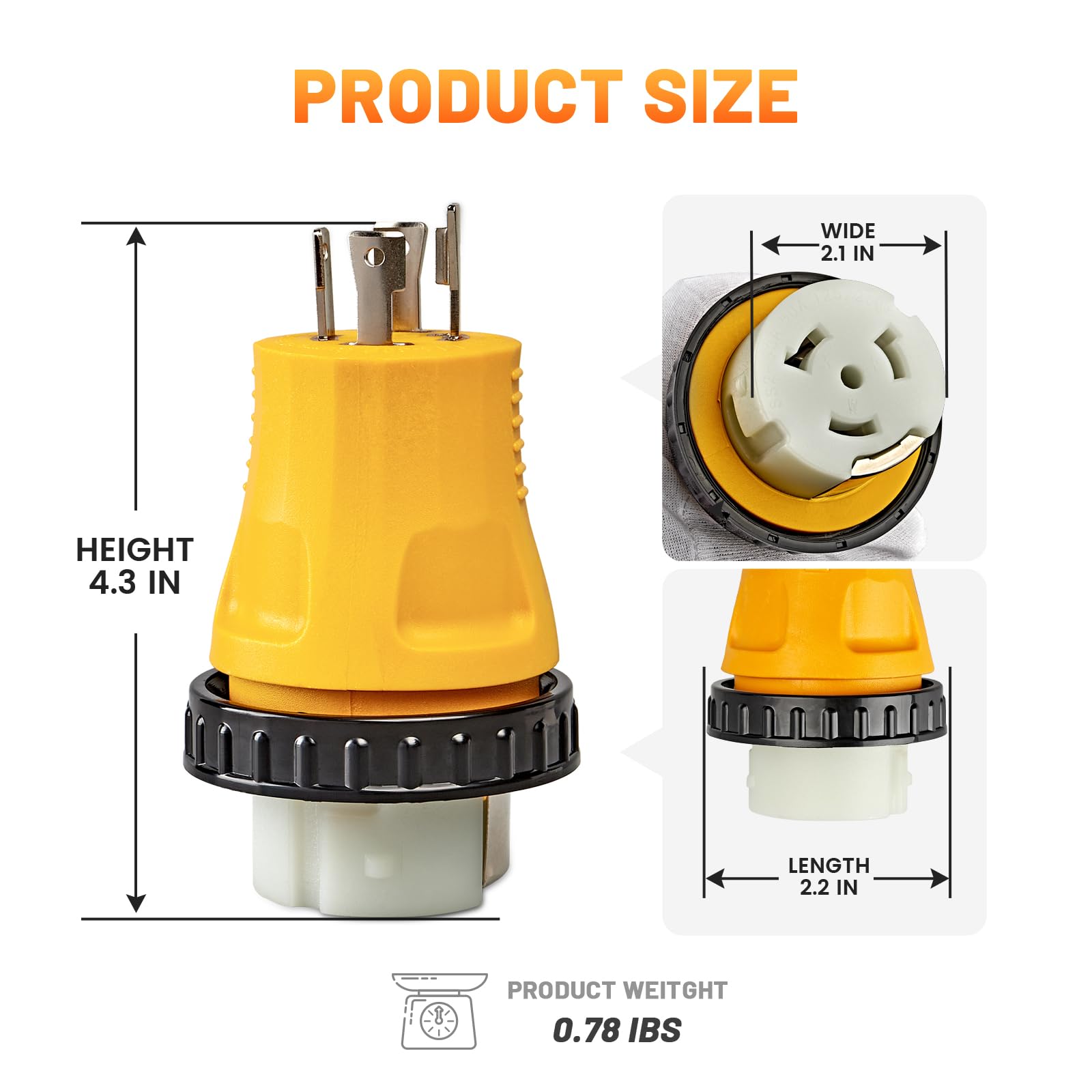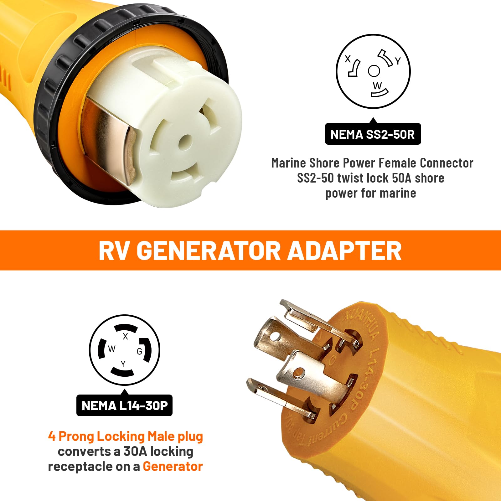 Molded Plug: - Heavy duty generator electric adapter designed to withstand elements like wind, rain, snow, soil, and rocks for long-lasting durability; Female receptacle locking (ss2-50r) feature to ensures safe and leak free power conduction. Perfect for you to connect the generator power to your RV, Motorhome, Trailer or vehicle with built-in SS2-50P inlet