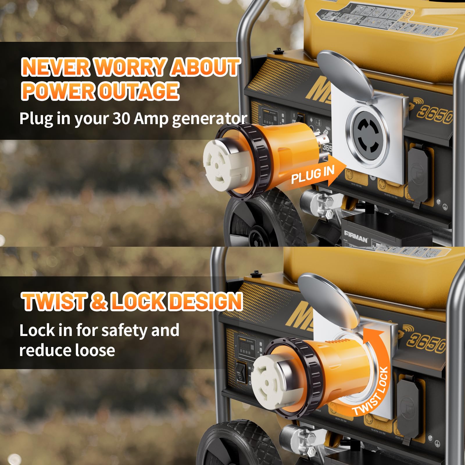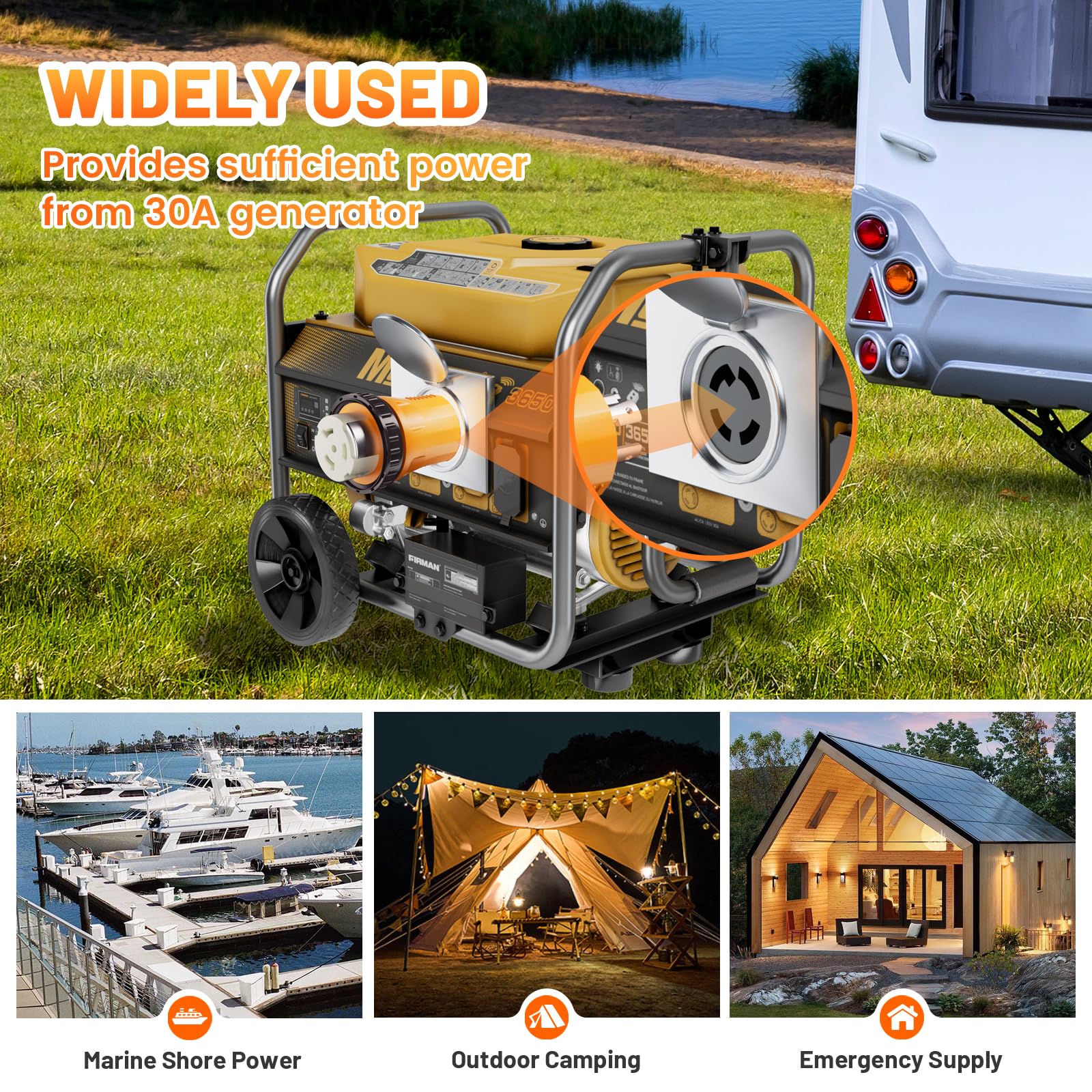 Power RV/Marine/House with 30A Generator: - 30A 4 prong twist generator plug NEMA L14-30P(male) end to your 30A-ready generator output; Or connect twist lock SS2-50R (Female) end to your 50A RV power inlet or house's 50A power inlet box (SS2-50P/CS6375)