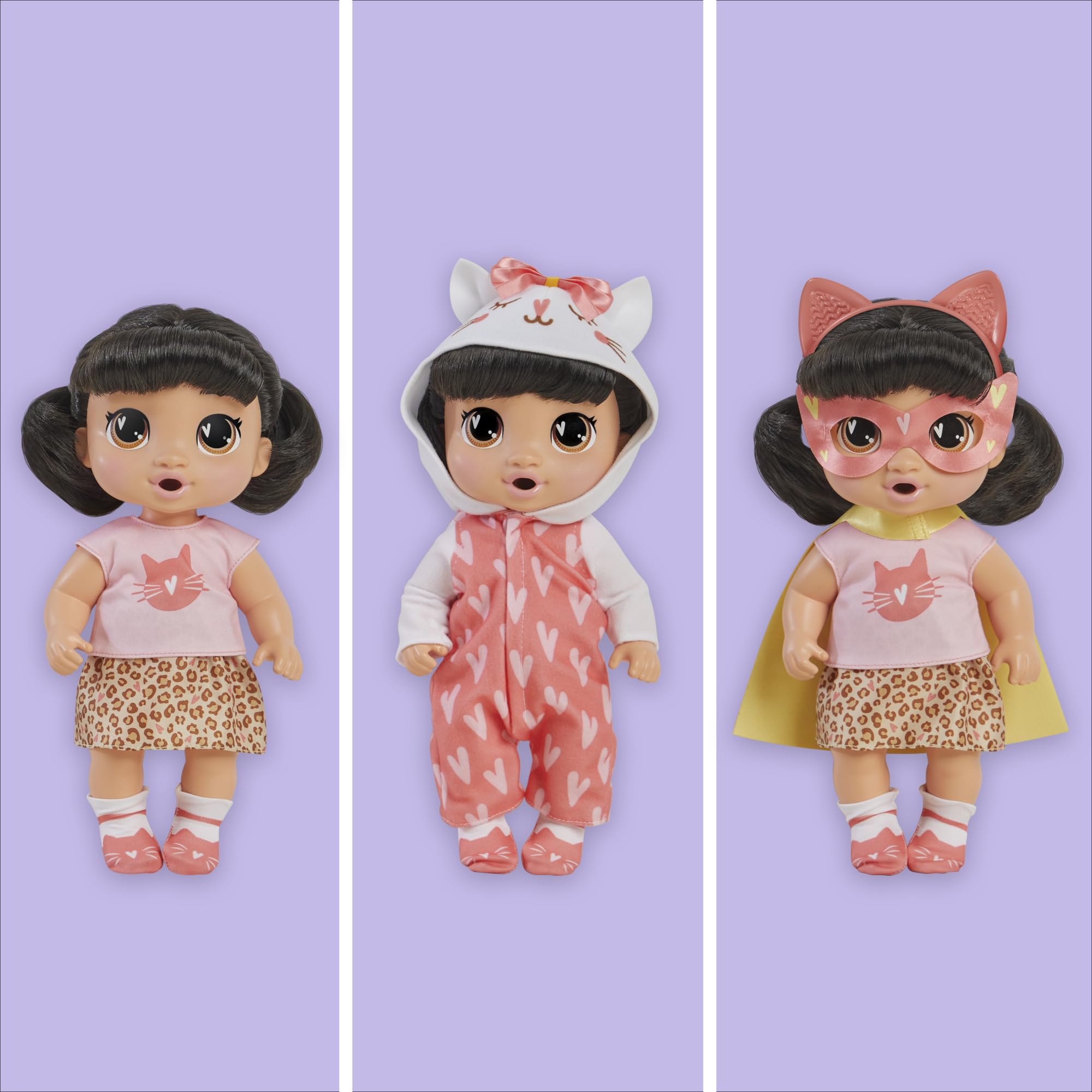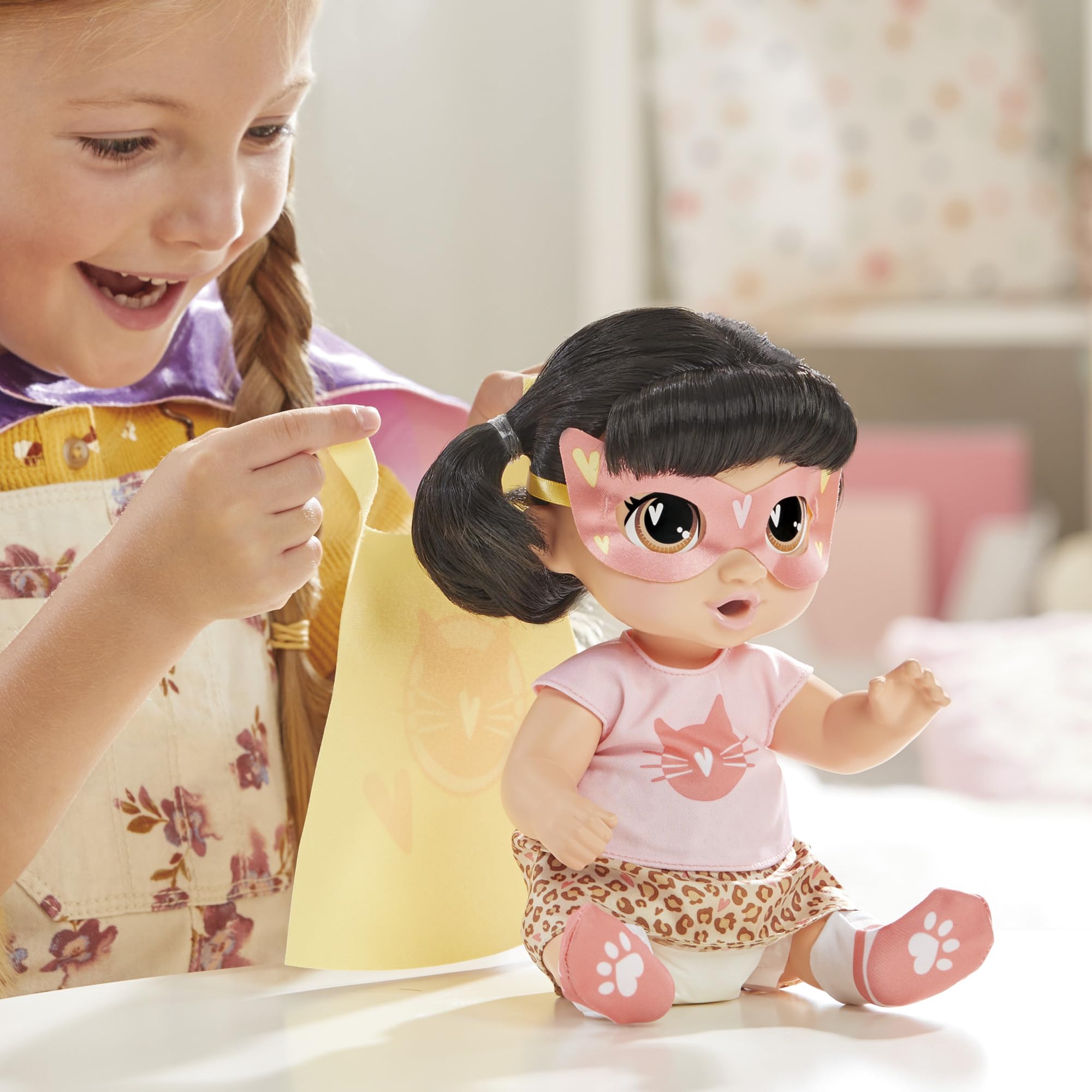 3 SUPER CUTE LOOKS: The Baby Alive doll clothes include her daytime shirt and skirt, superhero mask and cape costume, socks, and cat-themed pajamas for nighttime. Mix and match the pieces for more fun
