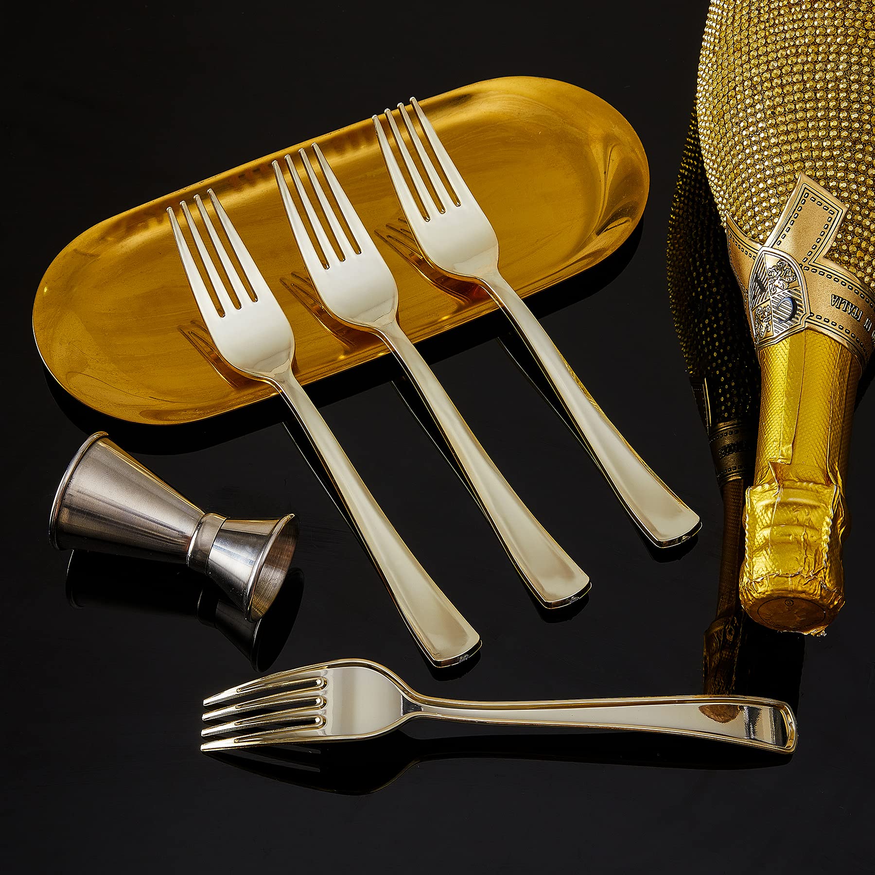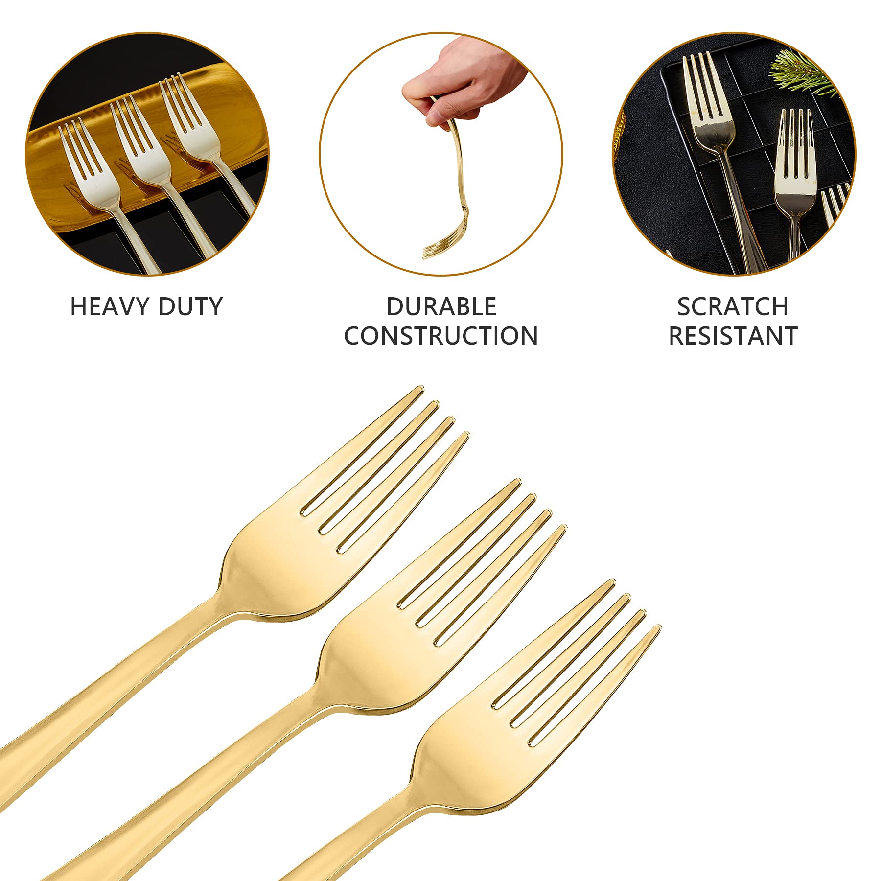 THE FINEST PLASTIC CUTLERY: Feel the quality by the weight of it in your hand. Elevating your table setting with stunning gold plastic forks will complement any party theme. Same as real silverware, these gold disposable forks are not microwaveable