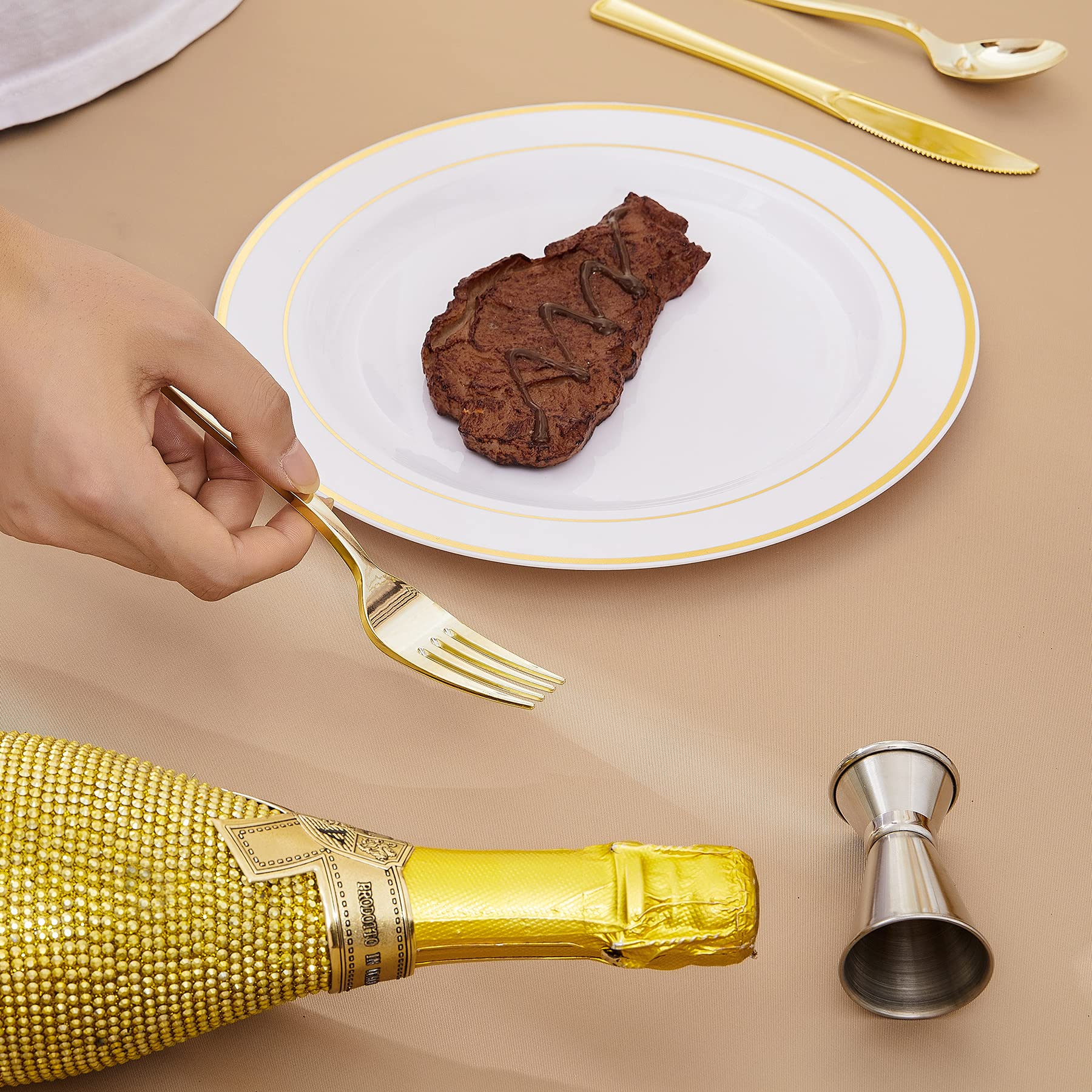 GREAT VALUE: See the close resemblance to real gold silverware in its size proportions and finish. Great value for the price in addition with its heavy weight and durability. They are disposable making the cleaning process less of a hassle