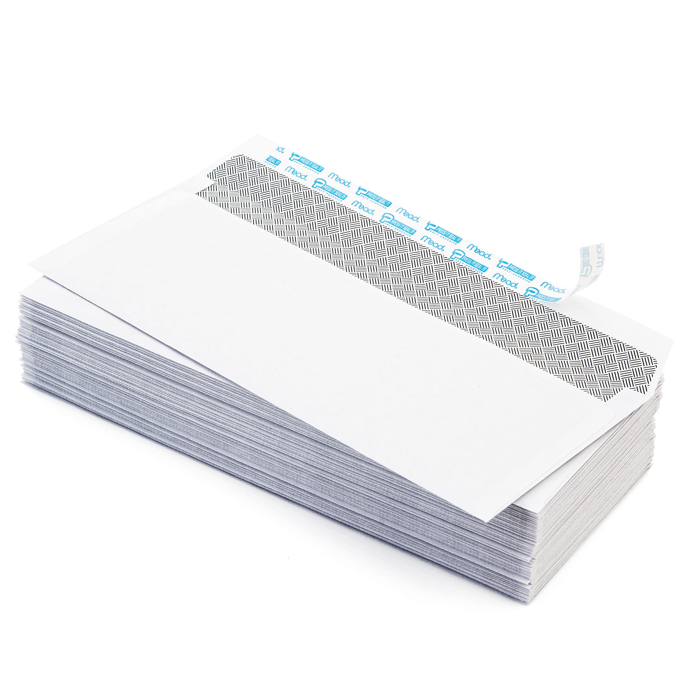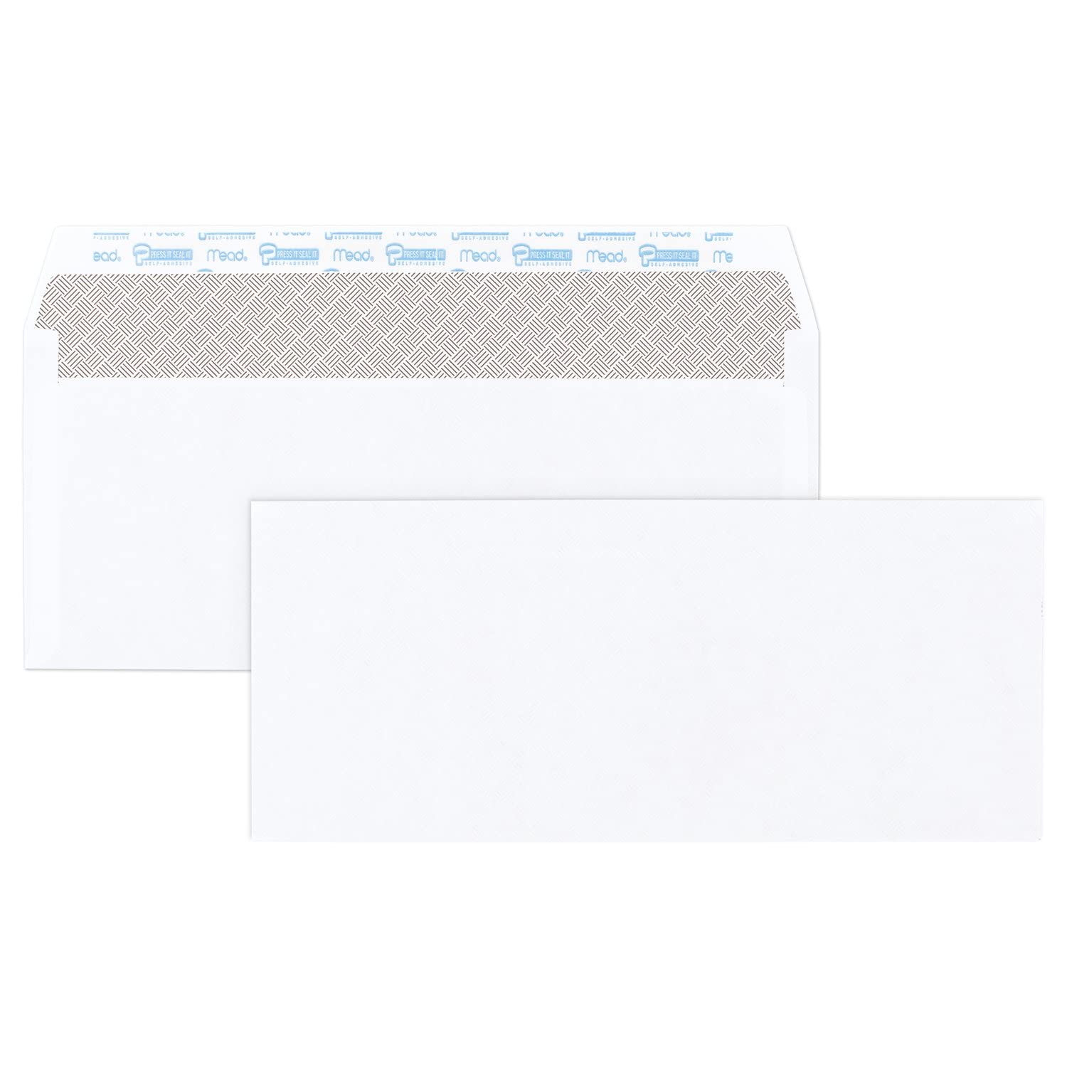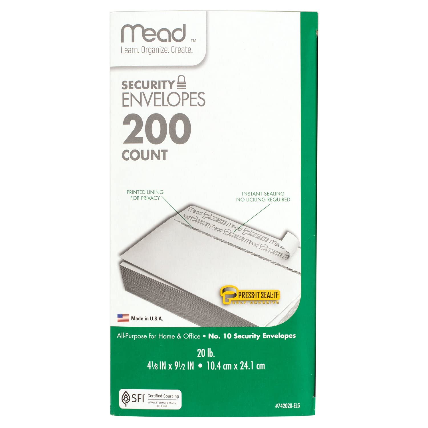 Easily send everyday mail with the Mead #10 Press-It Seal-It Security Envelopes. These #10 size envelopes measure 4-1/8" x 9-1/2" and can hold folded letter-size documents. Quick and simple sealing. Mead Press-It Seal-It envelopes feature a self-adhesive strip to help keep your contents safe and secure. Keep your personal information personal. These envelopes have a security lining to help maintain privacy of documents. All-purpose 20 lb. white envelopes are great for both office and home use. Box contains 200 envelopes. Made in the U.S.A. with SFI certified sourcing.