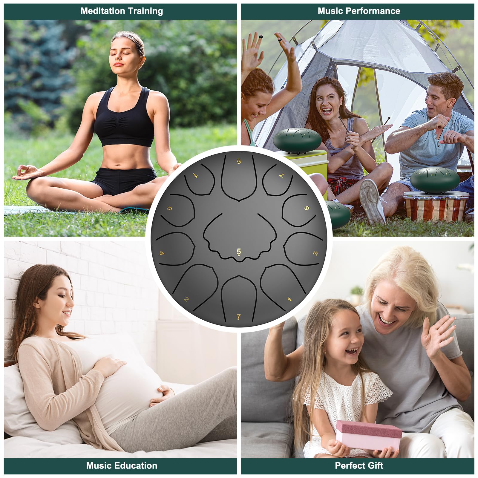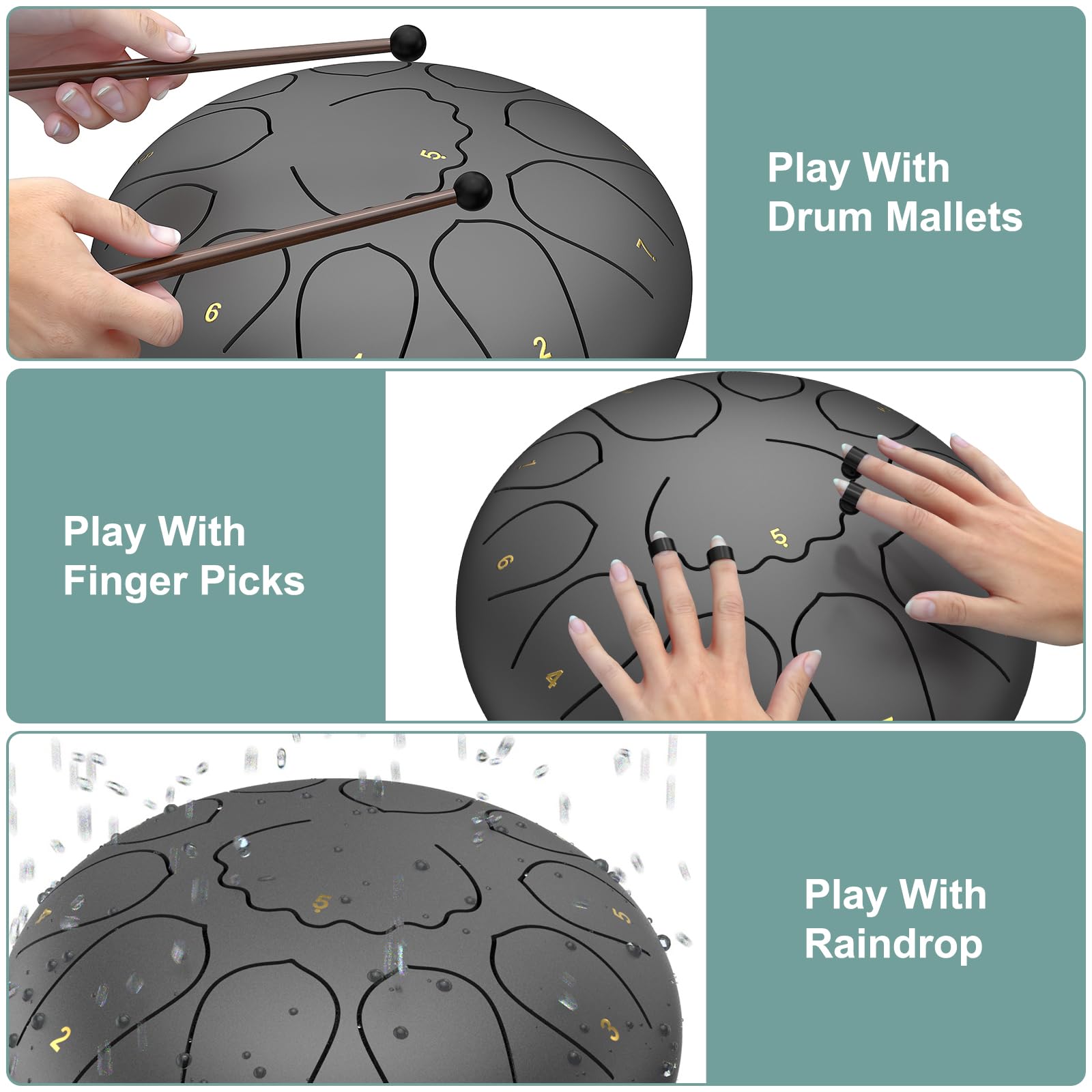 UNIQUE GIFT FOR FRIENDS: The steel rain drum's calming sounds bring clarity and peace of mind, making it a thoughtful gift for loved ones. Easy to play with musical drumsticks or by the natural strike of rain. This tongue rain drum will be a unique present for women, or men, as Christmas, birthdays, get-well wishes, or white elephant exchanges.
