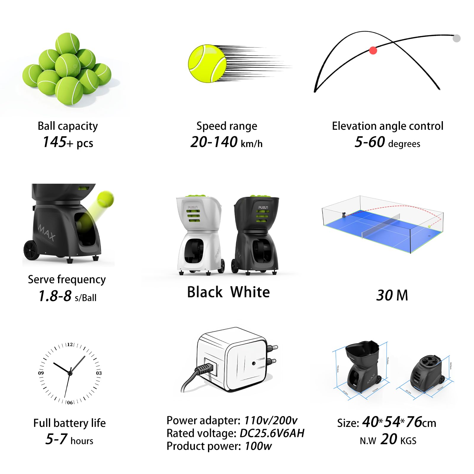 I. Product Parameters Product Title: PUSUN PT-SMART PRO Padel Portable Tennis Ball Machine for Outdoor Sports Brand: PUSUN Model: PT-SMART PRO Padel Battery Life: 5-8 hours of continuous play Control Options: App/Remote Control Serve Frequency: Adjustable between 1.8 – 8 seconds Speed Range: 20 – 120 km/h for versatile practice Serving Distance: Up to 30 meters Elevation Angle: 5° – 45° for varied shot trajectories Keywords: Tennis Ball Machine, Portable Padel Ball Machine II. Product Selling Points Extended Play Time: A robust battery life (5-8 hours) ensures prolonged training sessions without interruptions. Smart Connectivity: Seamlessly control the machine via a dedicated mobile app, remote, or even your , making adjustments quick and hassle-free. Customizable Training: With an adjustable serve frequency (1.8-8 seconds) and speed settings (20-120 km/h), players can tailor sessions to match their skill level and training needs. Versatile Performance: The ability to serve at various distances (up to 30 meters) and elevations (5-45°) replicates real-game conditions, enhancing accuracy and shot control. Portability & Durability: Designed for outdoor sports, this lightweight yet durable machine is perfect for on-the-go practice, whether you’re training at a local club or on a public court. Comprehensive Skill Development: Ideal for beginners, training sessions, club practice, and even professional competitions, offering an all-in-one solution to elevate your game. III. Usage Scenarios Beginner Training: Perfect for players starting out; the adjustable settings allow novices to gradually improve their timing, speed, and shot accuracy. Club & Team Practice: Enhance training routines at clubs or sports facilities with consistent, reliable serves that mimic real match conditions. Pro-Level Preparation: Professionals can fine-tune specific aspects of their game by varying serve speeds and angles, simulating high-pressure scenarios on the court. Outdoor Recreation: Whether in your backyard, at a community court, or during a club event, this portable machine offers convenience and high performance for a wide range of outdoor sports activities. Personal Coaching: A great tool for personal trainers and coaches, enabling customized drills that focus on improving reaction time, agility, and overall technique.