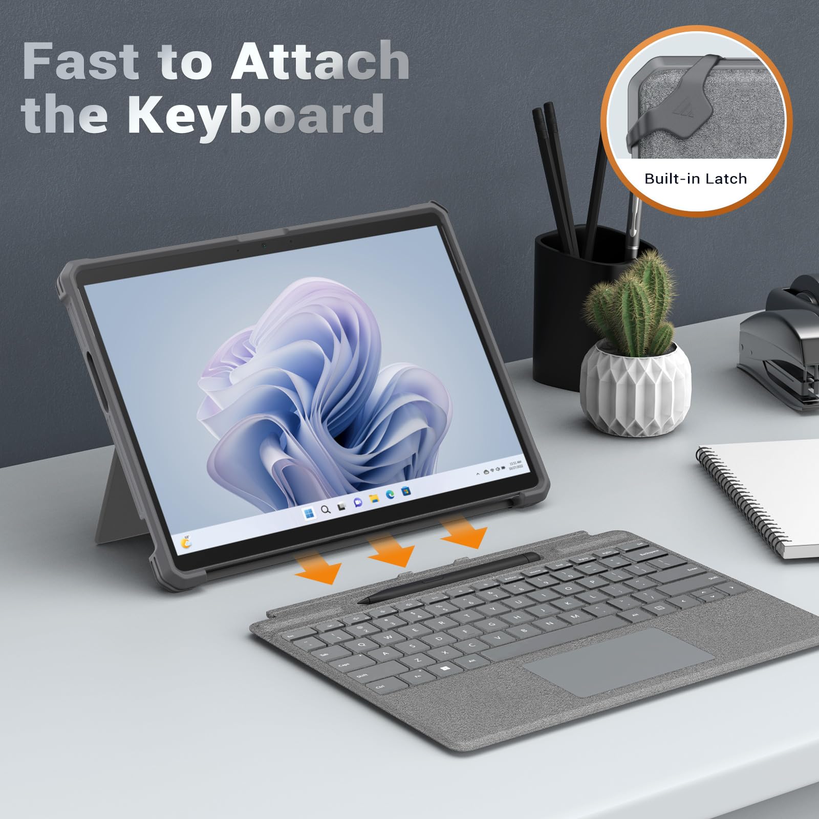 SECURE AND CONSIDERATE DESIGN: This surface pro 9 case and surface pro 10 case has a built-in latch attached for the user to keep the type cover keyboard secured on the tablet on the go, very friendly to people who are on travel or on business.
