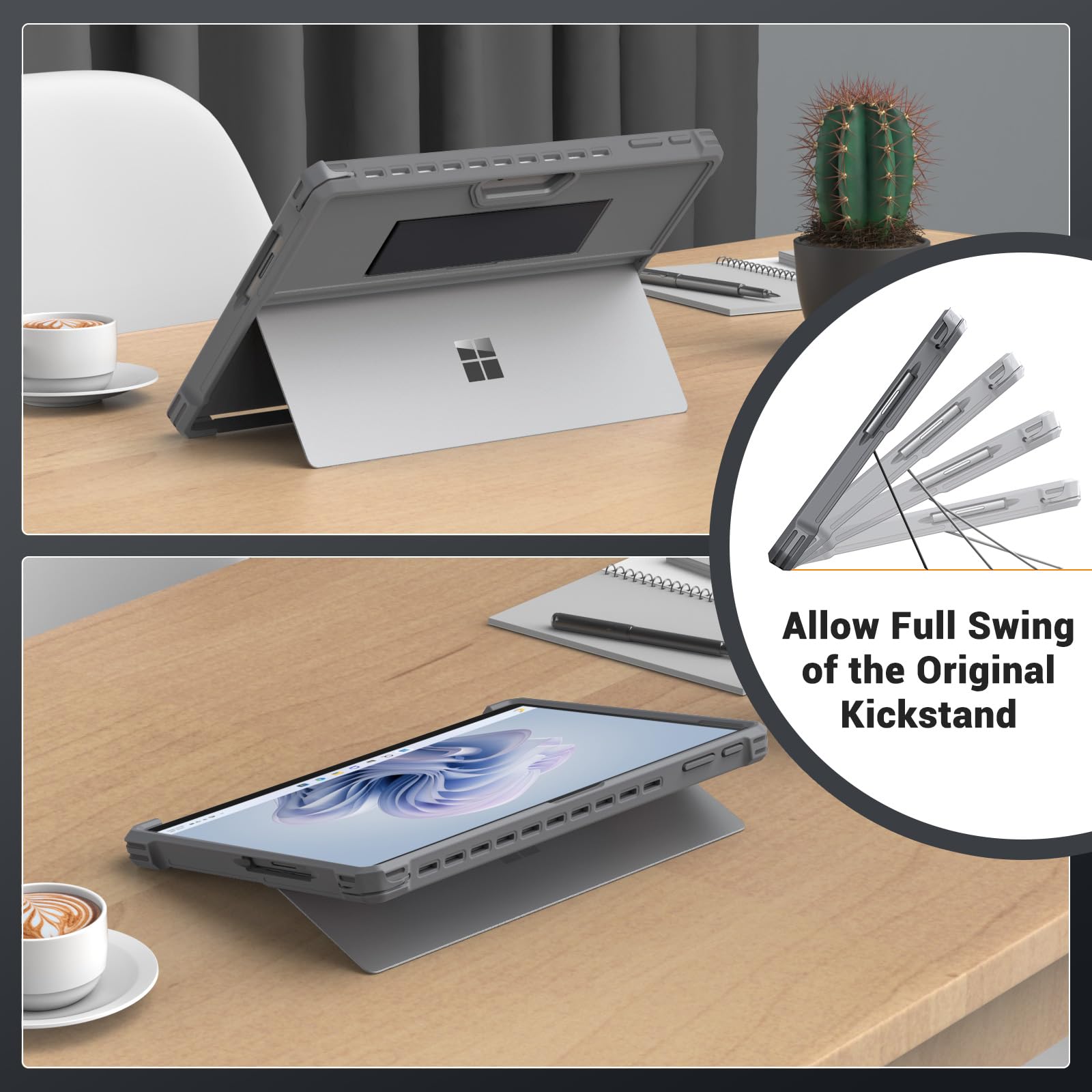 COMFORTABLE WORKING EXPERIENCE: With channel for directly connecting to Microsoft Surface Pro 11, Pro 10, Pro 9 type cover keyboard for an instant so that the user can use it without removing the case. The reserved back cutout allows the user to adjust Microsoft Surface Pro 11, Pro 10, Pro 9 tablet kickstand freely to find the best viewing angle, writing angle or typing angle.