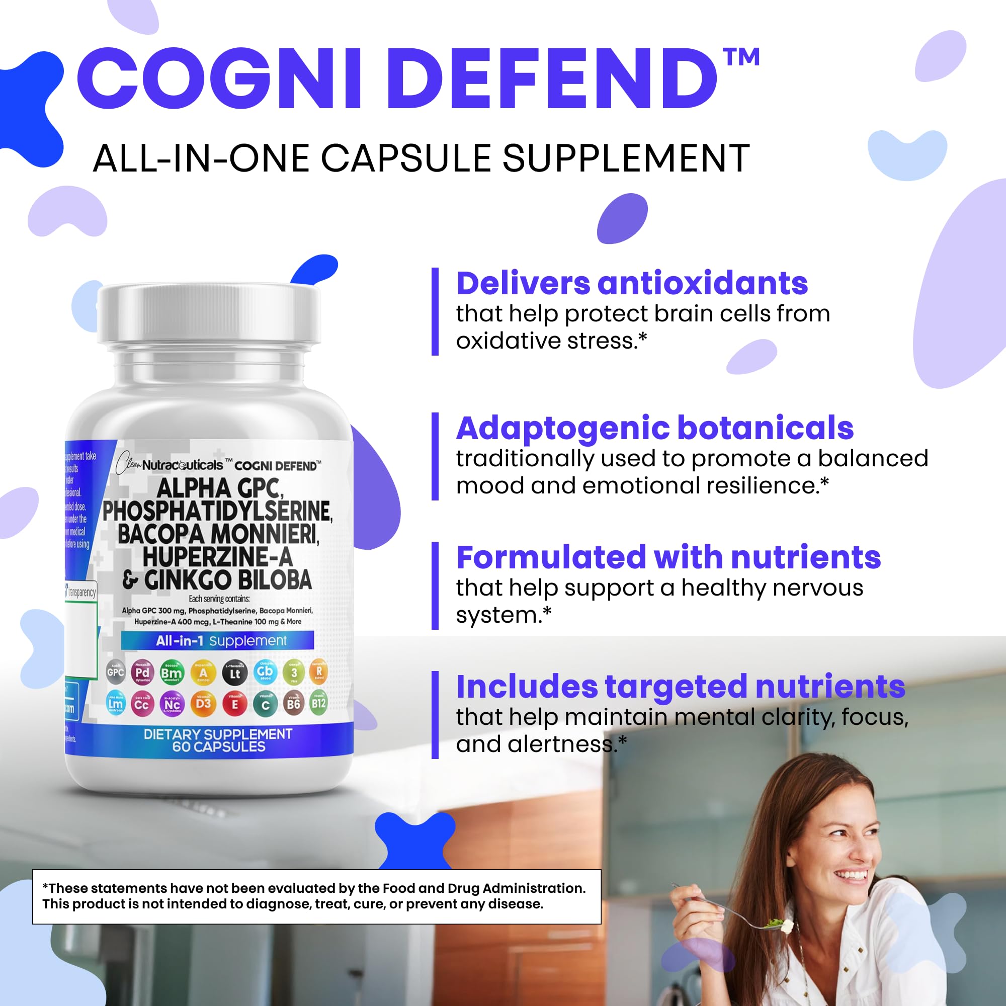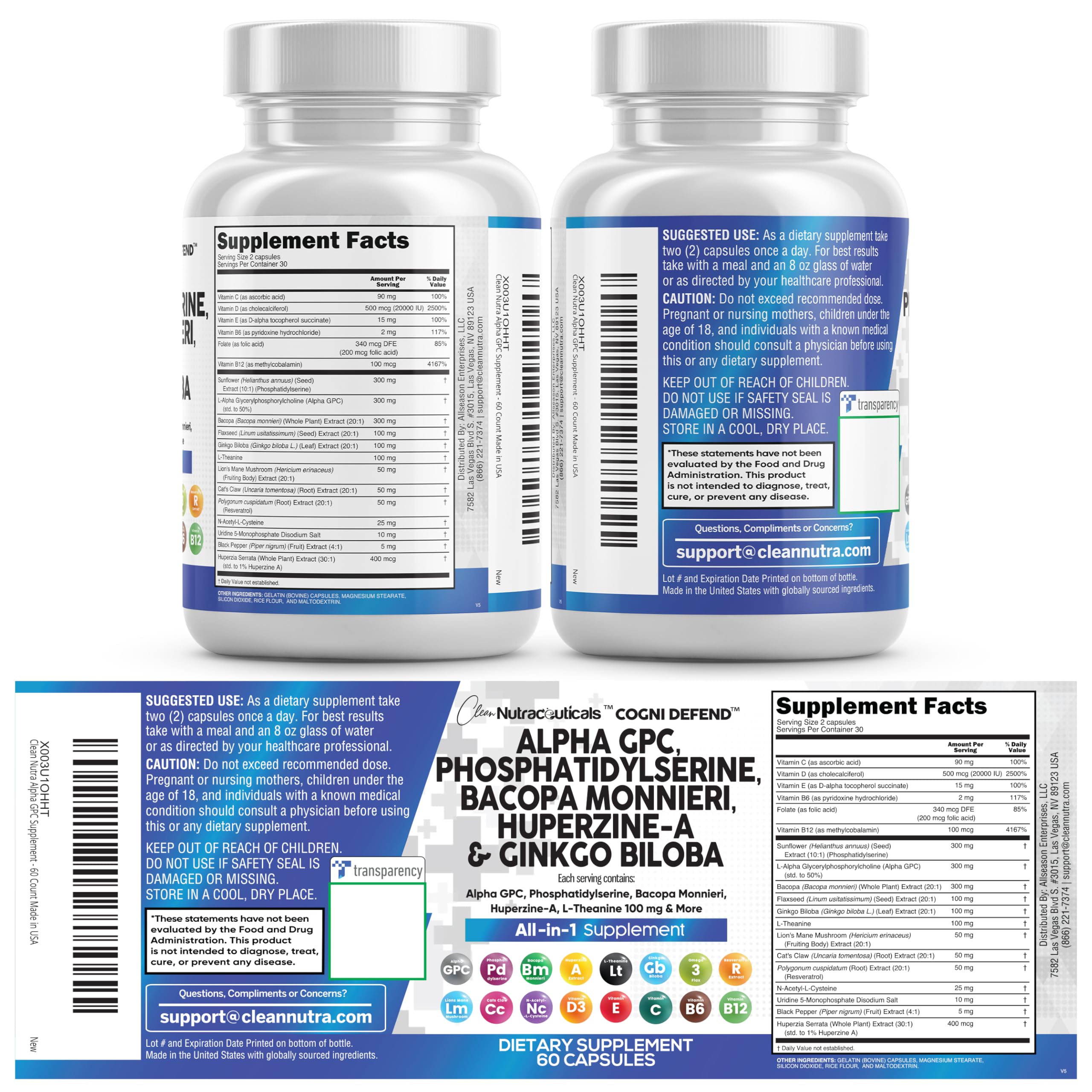Clean Nutraceuticals Alpha GPC Choline Phosphatidylserine Bacopa Monnieri Ginkgo Biloba Huperzine A Supplement with Urdine Lions Mane Cats Claw NAC Vitamin C B D E