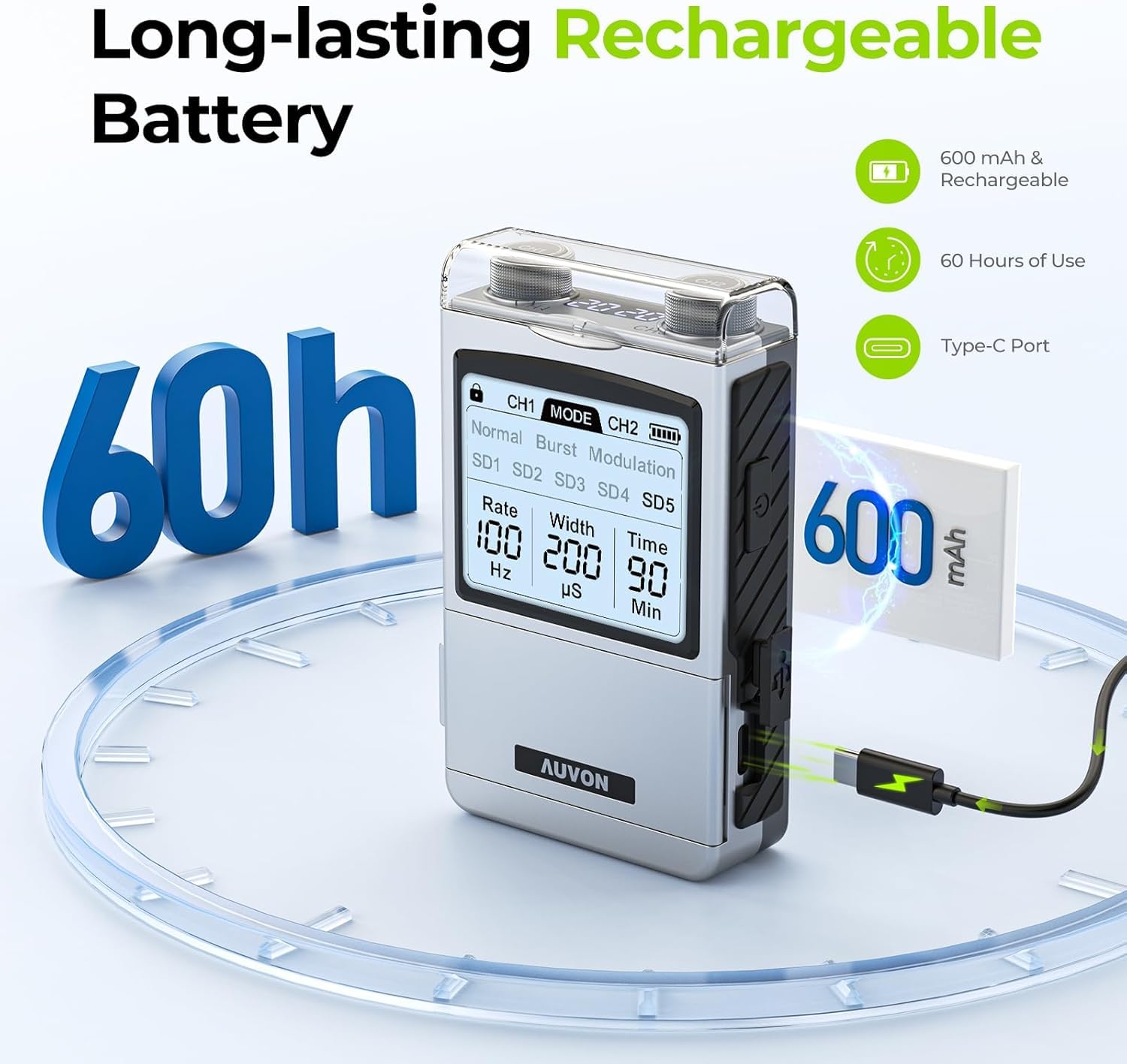 Rechargeable and Powerful Battery for 60h Usage: The TENS machine for pain management is upgraded with a powerful 600 mAh battery for 60 hours of continuous therapy. Included a Type-C cable (no adapter), this electric massager for muscles can be connected to a wall charger, power bank, or laptop USB port for charging. 4 simple buttons make operation more intuitive, and the flip cover can prevent accidental contact