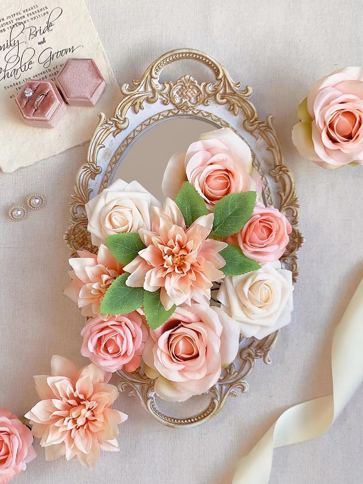 Peach Roses Artificial Flowers Set: A combo box packs a variety of flowers and greeneries as vintage farmhouse or rustic themed wedding. A total of 21 fake flowers and 8 accessories, including mixed silk and foam pink roses artificial flowers with stems