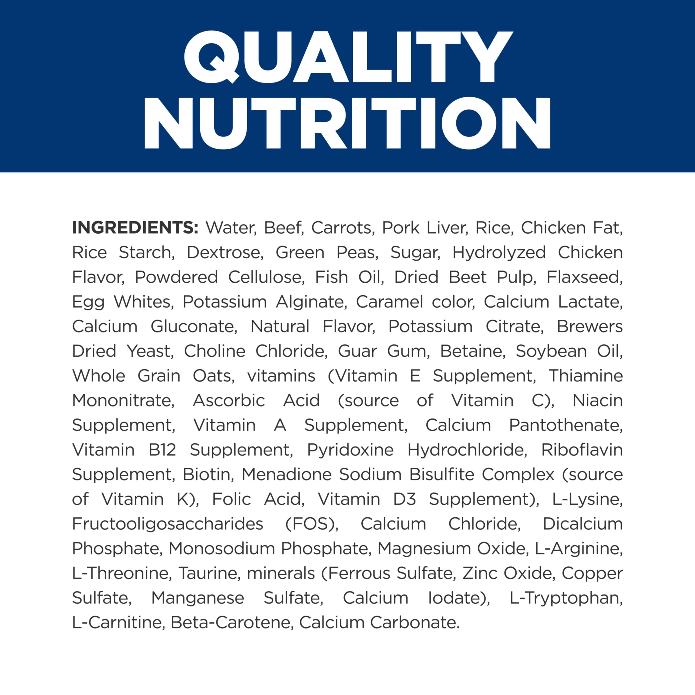 Hill's Prescription Diet k/d Kidney Care Beef & Vegetable Stew Dog Food is clinical nutrition proven to improve and lengthen quality of life in dogs. Formulated with ActivBiome+ Kidney Defense, a proprietary blend of prebiotics shown to activate the gut microbiome to help protect kidney function.It’s made in the USA with global ingredients you can trust, and was developed by Hill’s nutritionists and veterinarians. This food contains high levels of essential amino acids, the building blocks of muscle protein. It is also formulated to promote a urinary environment that reduces the risk of developing struvite and calcium oxalate crystals. Please consult your veterinarian for further information on how Prescription Diet foods can help your dog continue to enjoy a happy and active life.