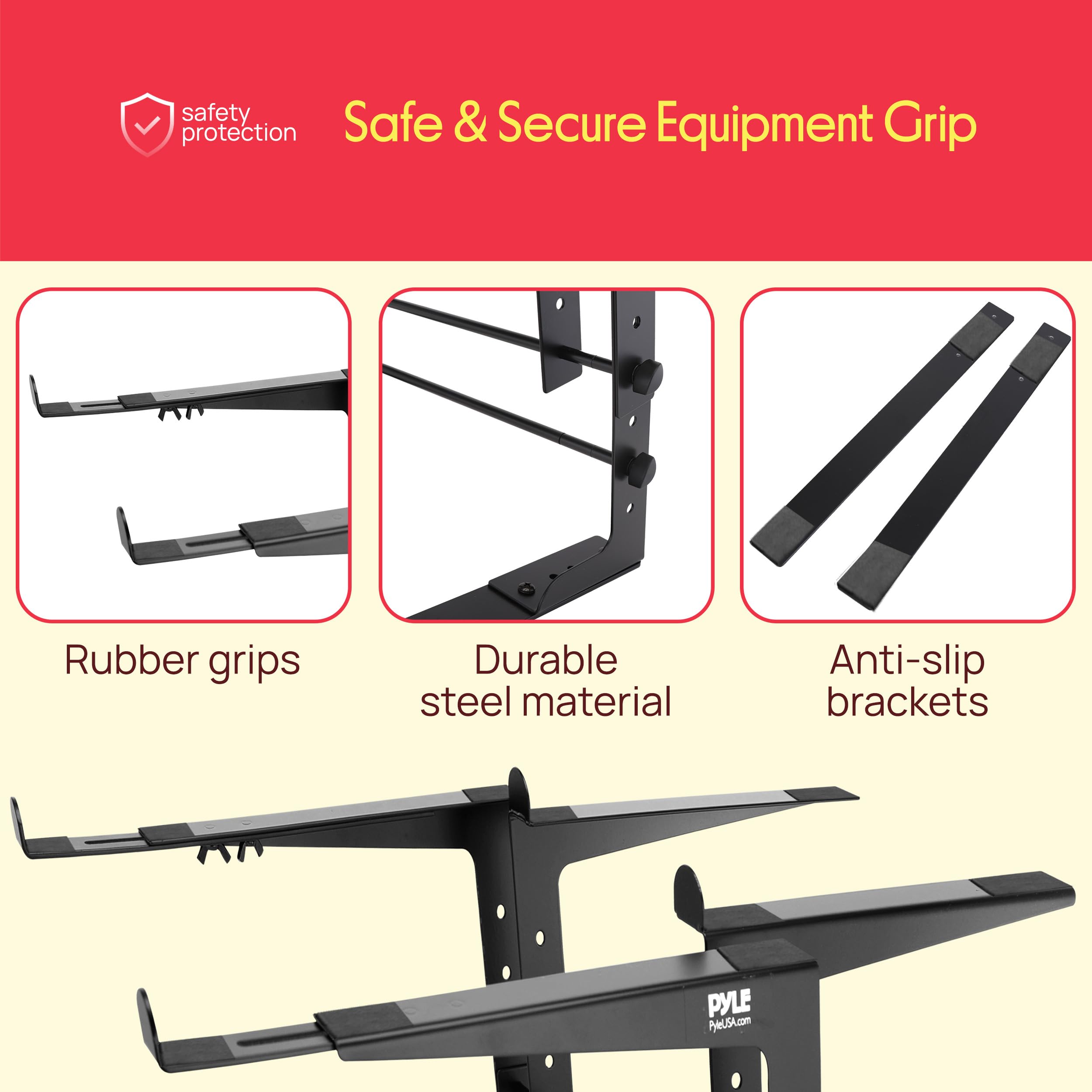 DUAL ERGONOMIC DESIGN: This is a safe and reliable laptop stand due to its secure prongs that form the dual trays. It can be used for laptops, DJ mixer, turntables, and other sound equipment devices. Perfect for home, gaming, school or business use