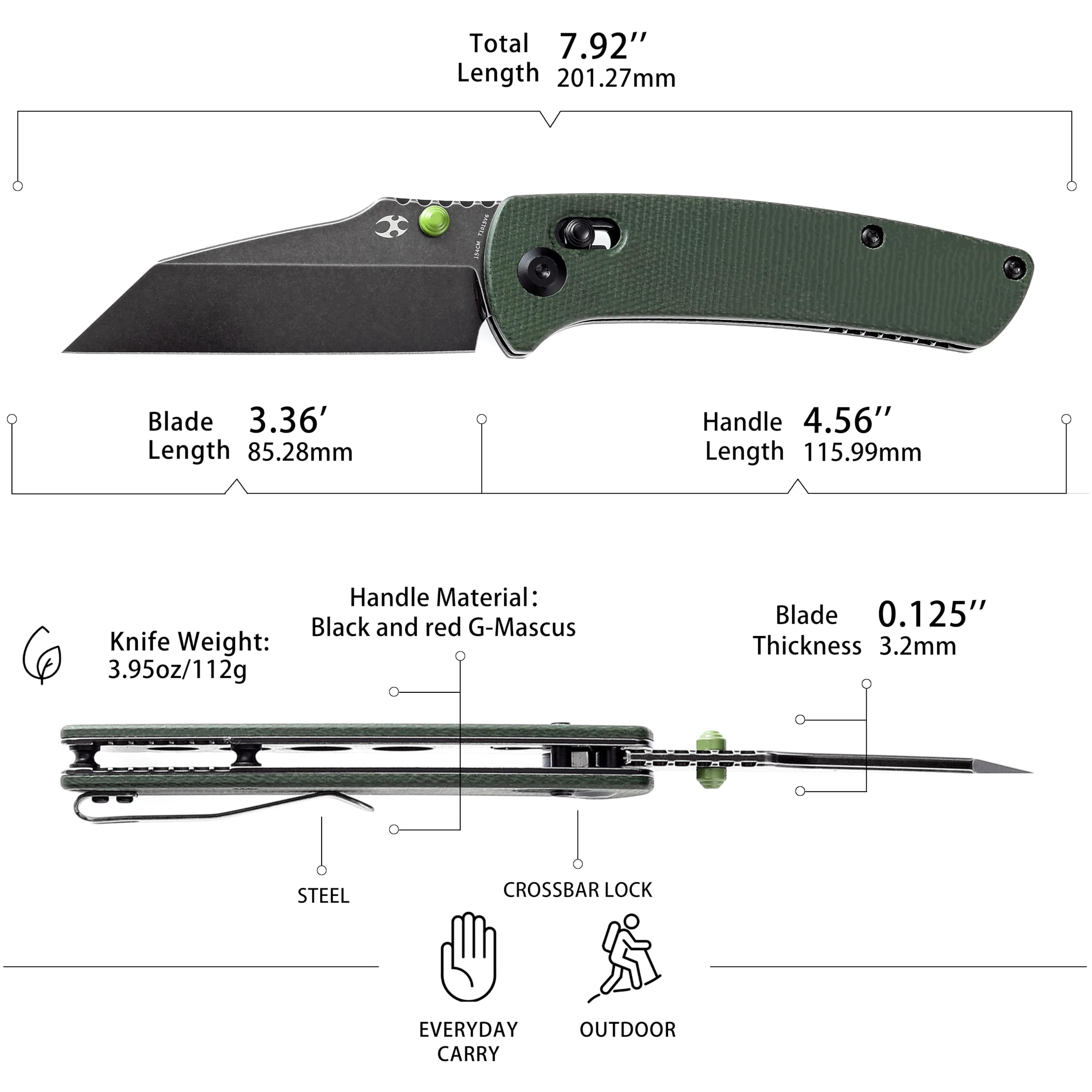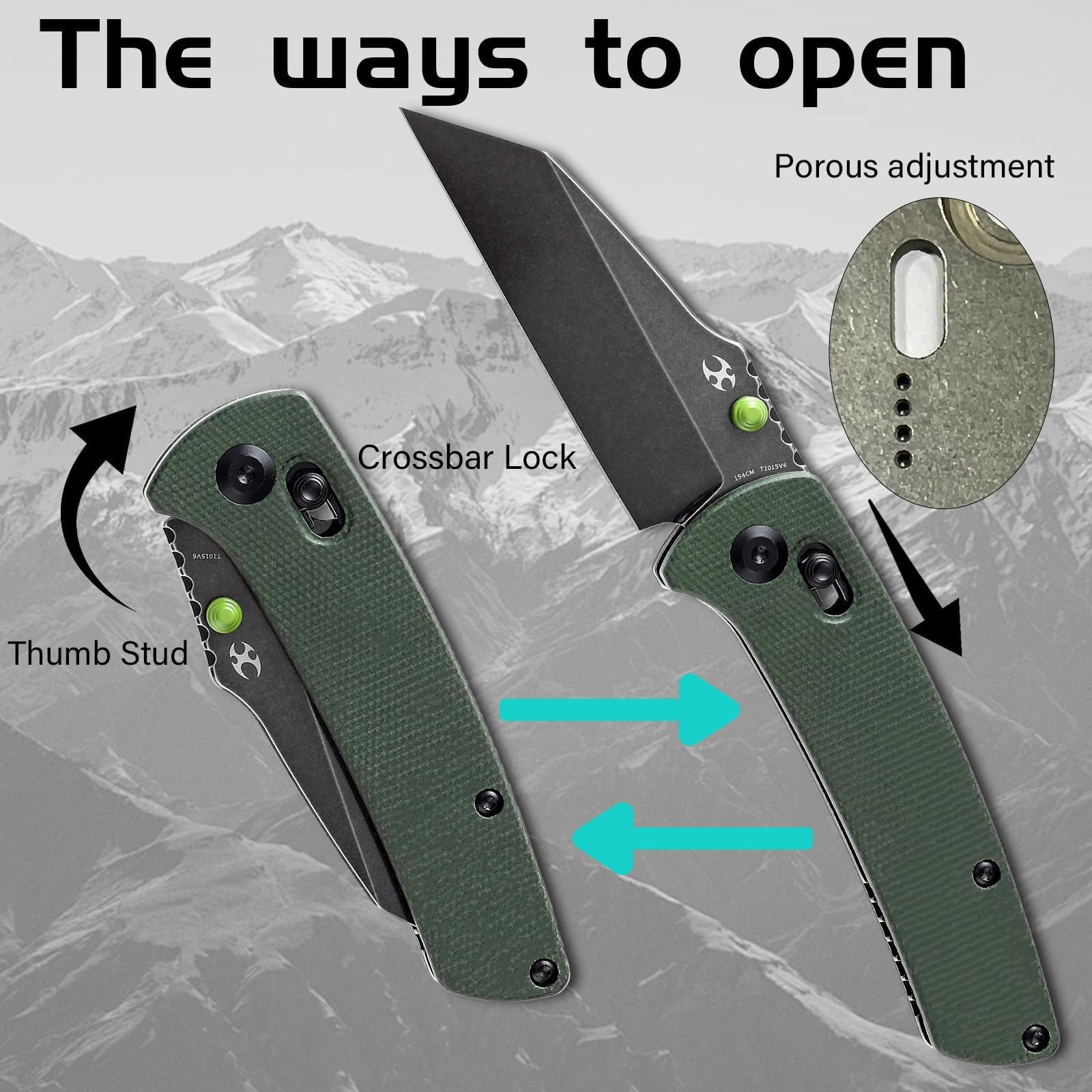 COMFORTABLE GRIP-Green Micarta handle for a smooth gripping surface that is comfortable in the pocket or hand.Meanwhile, you can easily open it with one hand.Thumb stud and Axis Lock make open and close easier.