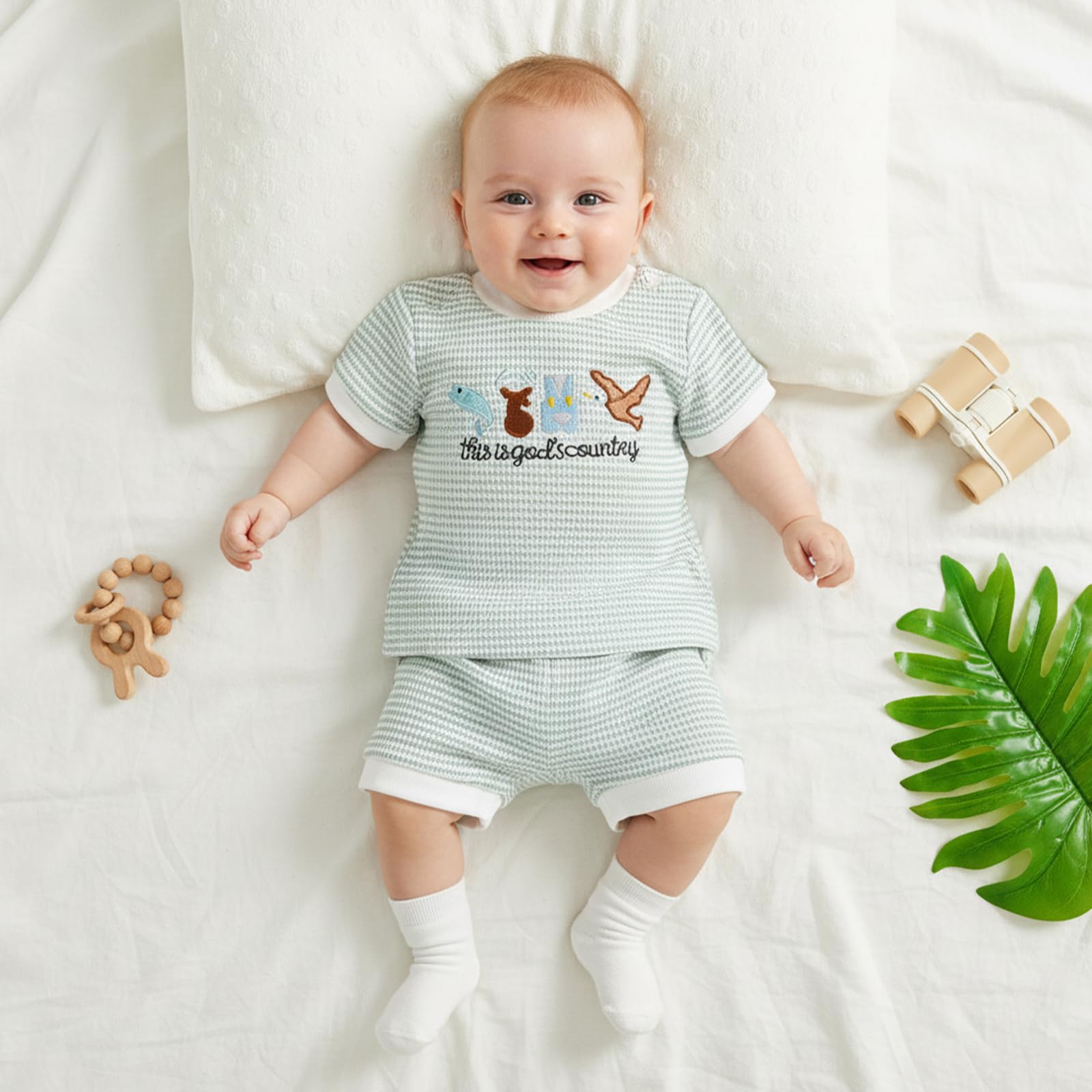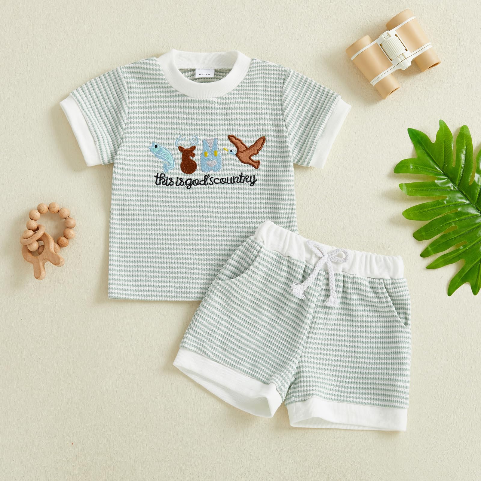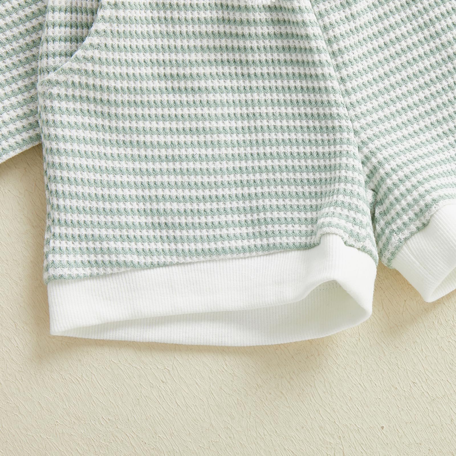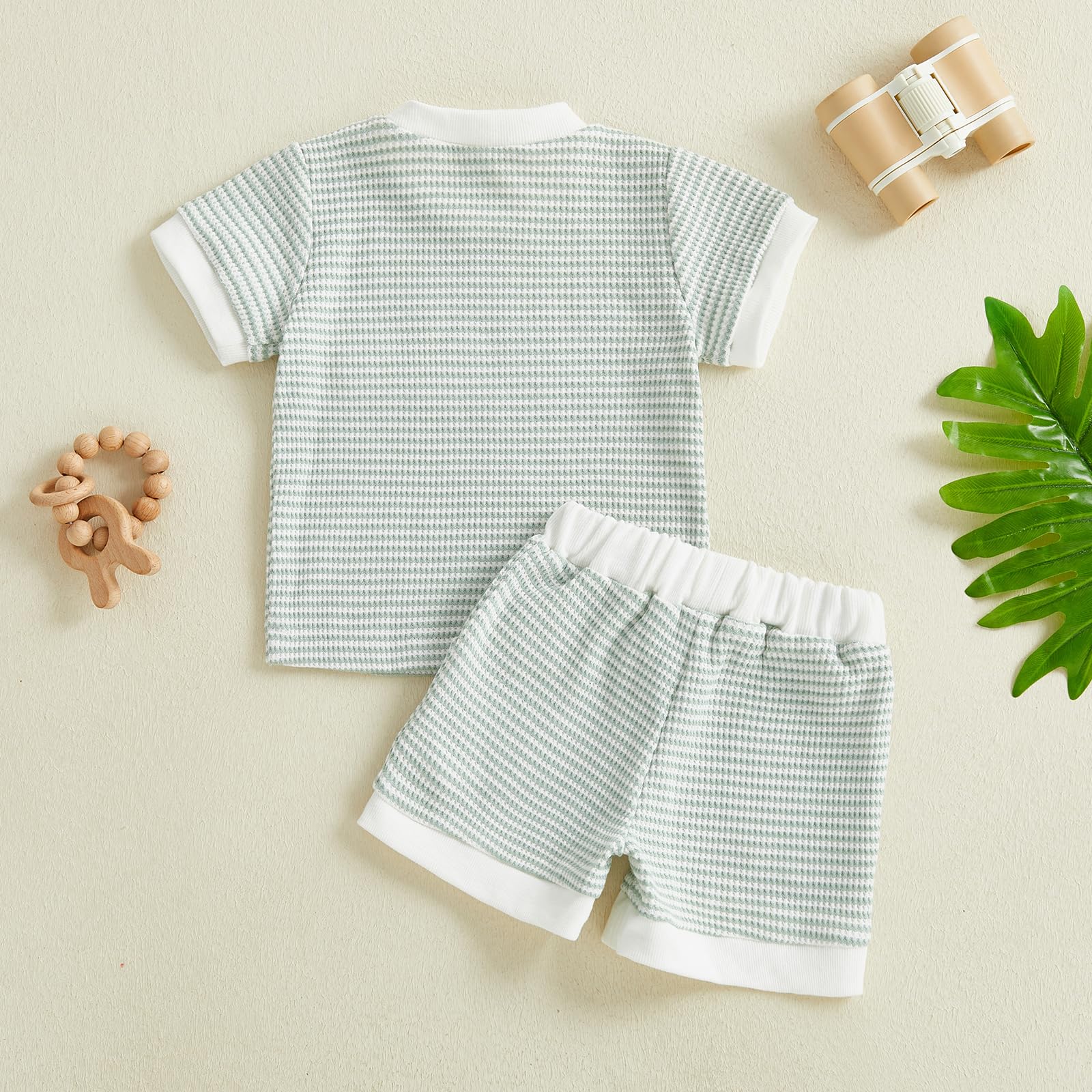 OCCASIONU: Unisex Short sleeve t-shirt top shorts set are matching waffle top, white and striped matching short pants have pocket and adjustable elastic waistband.Baby boy summer outfit, suitable for outings, play, travel, kindergarten, zoos, vacations, summer parties, photography, 4th of july, family day, and more