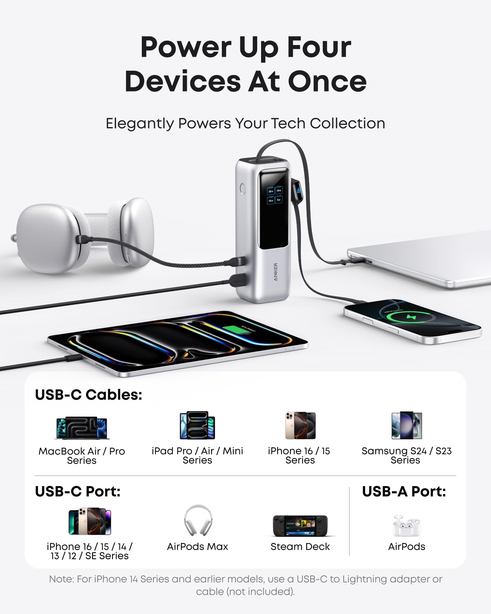 Charge 4 Devices at Once: Power up smartphones, tablets, or other USB-enabled devices thanks to dual USB-C cables, a USB-A port, and a USB-C port.