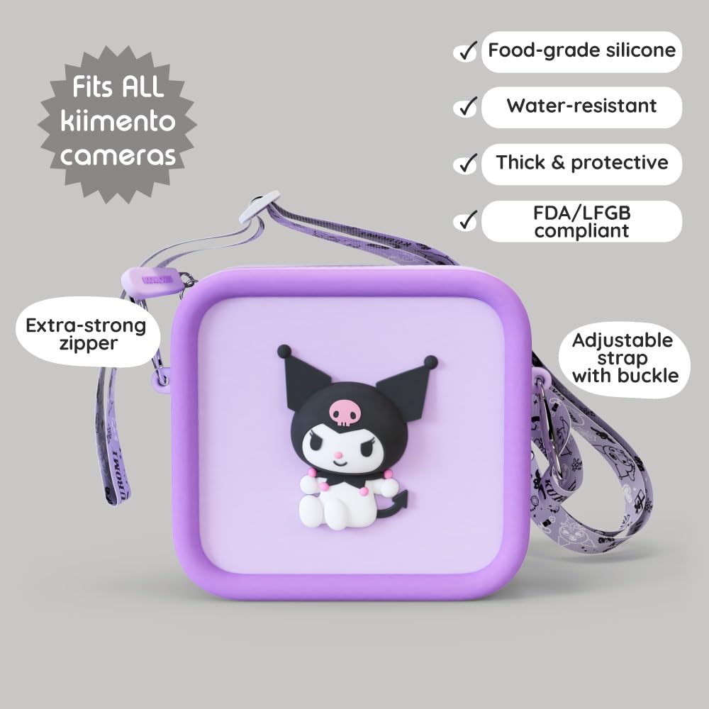 Description Introducing the Kuromi bag, a delightful blend of durability and whimsy! Crafted from clean food-grade silicone, this bag ensures safety and cleanliness for your little photographer's gear. The soft, thick and solid material is not only water-resistant but also provides reliable protection against everyday bumps. The soft and adjustable strap makes carrying a breeze for little ones, promoting comfort and independence. Our extra-strength zipper ensures secure closure, keeping the camera snugly tucked away. The super-robust swivel-eye snap metal hooks add an extra layer of durability, providing peace of mind during all their adventures. And let's not forget the adorable design that adds a touch of charm to this functional accessory. Encourage your child's creativity while keeping their camera safe and stylish with our bag - where durability meets delightful design! Note: 1. The raw material complies with FDA and LFGB requirements. 2. The bag zipper is not water-resistant.