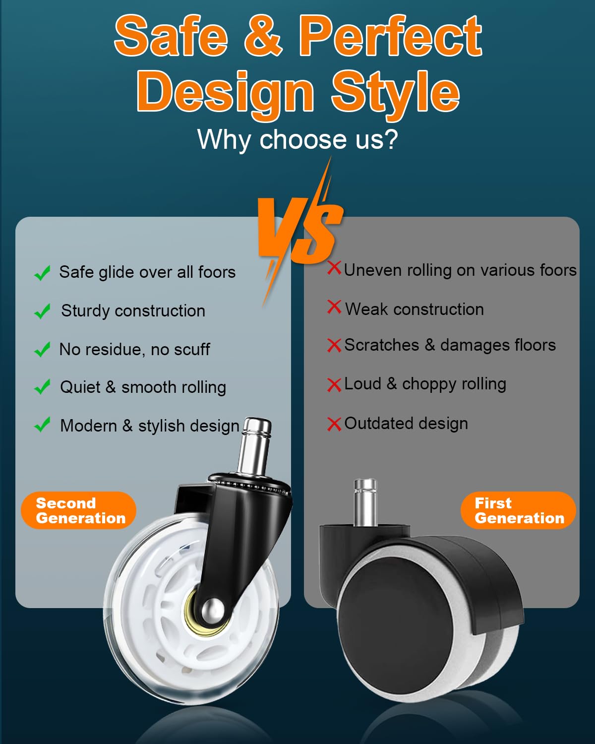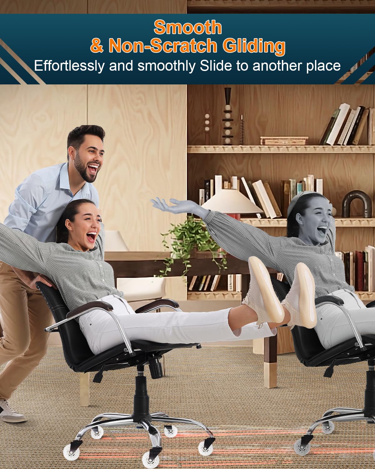 Perfect Design Style: Our office chair wheels feature an upgraded single-wheel design rather than a double-row configuration. The single-wheel design not only enhances the aesthetic appeal of the office chair but also provides a more even weight distribution on each wheel, thereby improving the chair's stability. It’s an ideal choice for office chairs