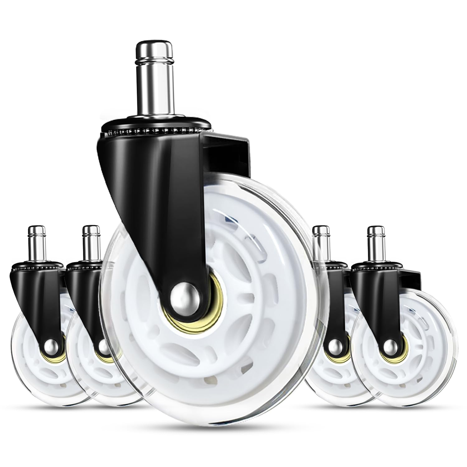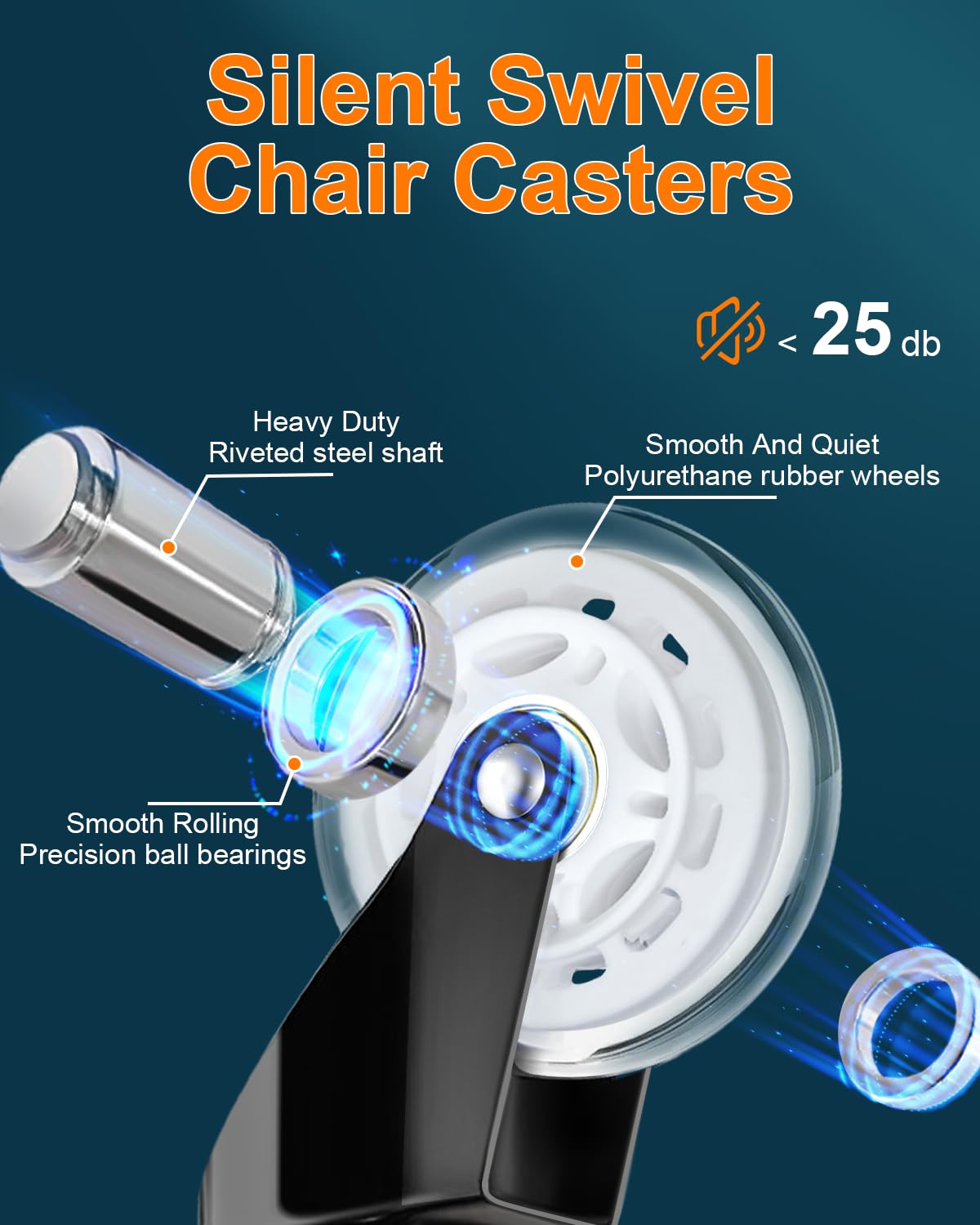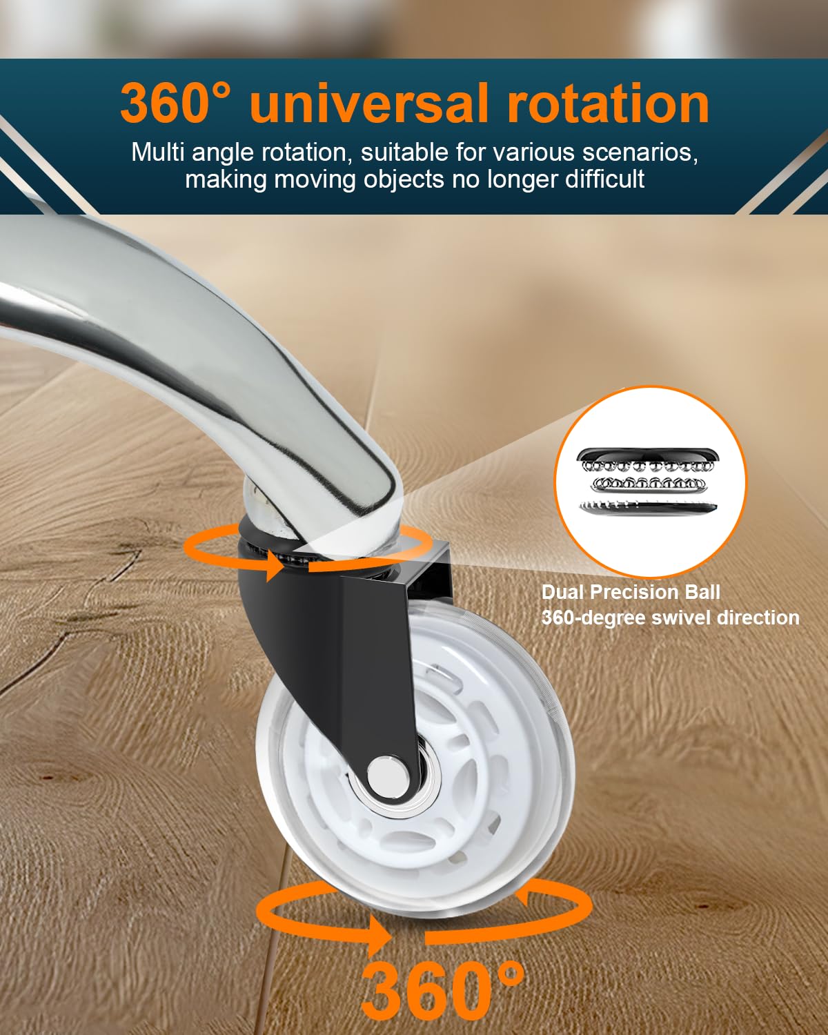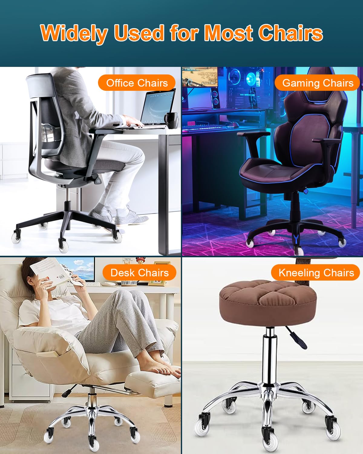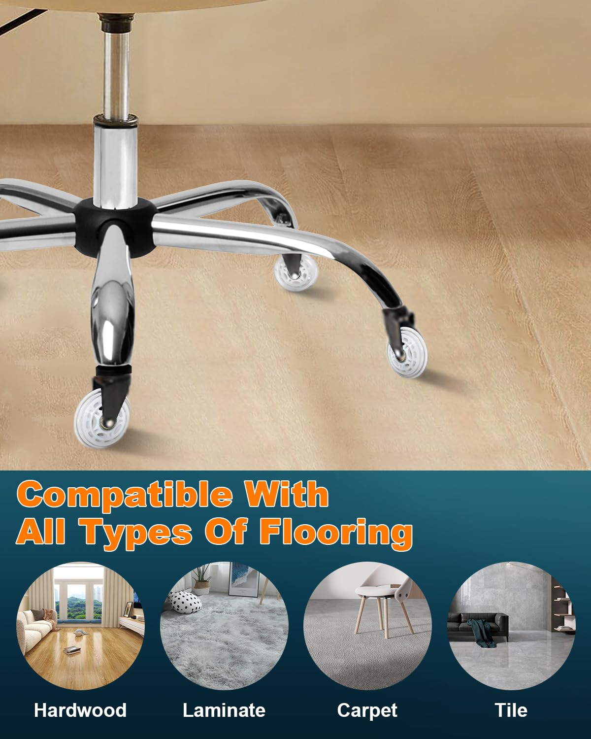 Suitable for All Floors: Our rollerblade chair wheels glide safely and effortlessly on wood floors, hardwood floors, laminate floors, vinyl floors, tile floors, and carpeted floors throughout the day. Additionally, the casters are wrapped in soft polyurethane material, ensuring they won't scratch, smudge, or damage your floors