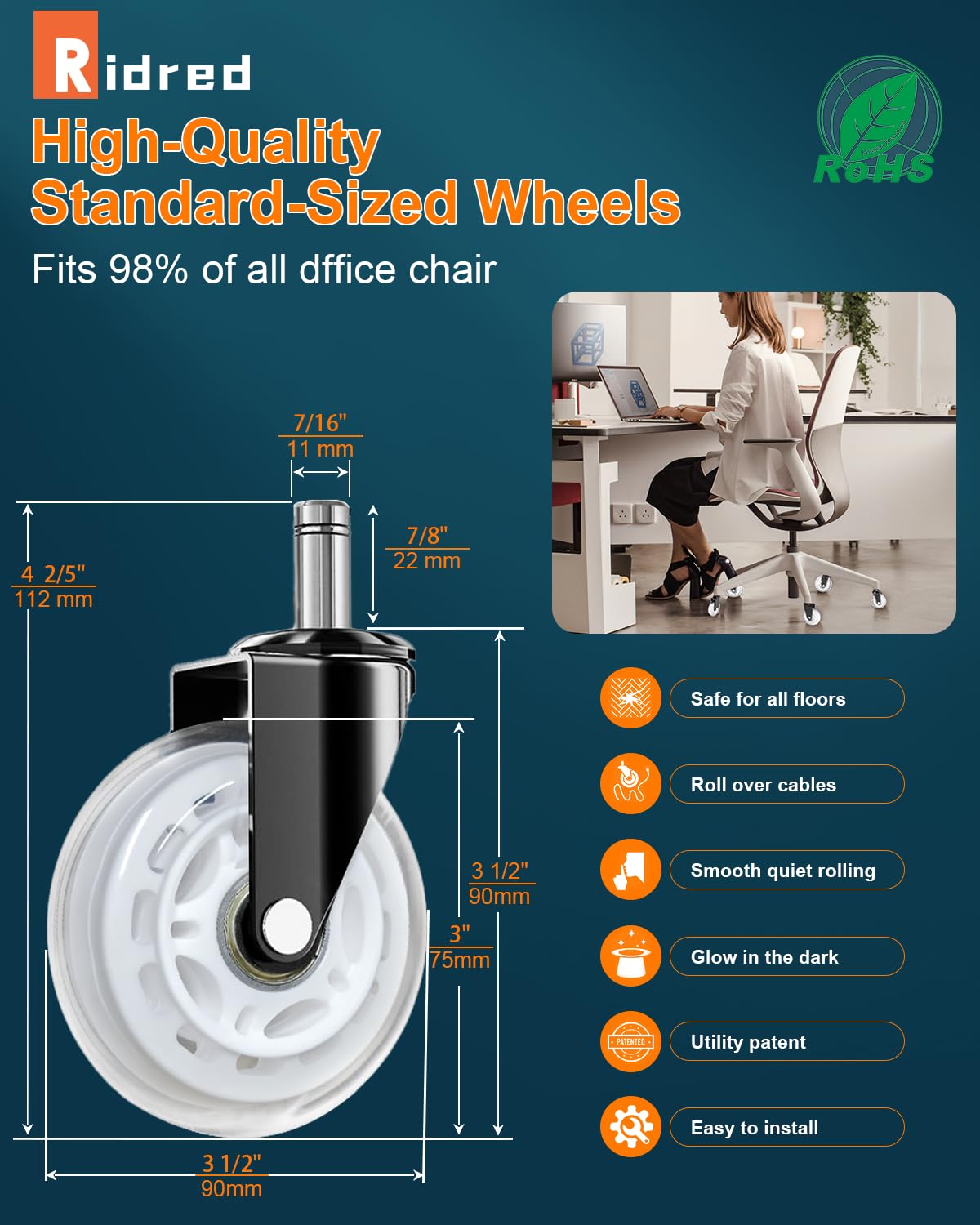Silent and Smooth Rolling: Our office chair casters are designed to be silent, eliminating friction and squeaking noises to maintain a quiet work environment and reduce noise. The smooth rolling action minimizes impact on the floor and reduces wear, preventing the chair from wobbling or swaying, which enhances user comfort. Additionally, it extends the lifespan of the wheels. RidRed wheels are your ideal choice