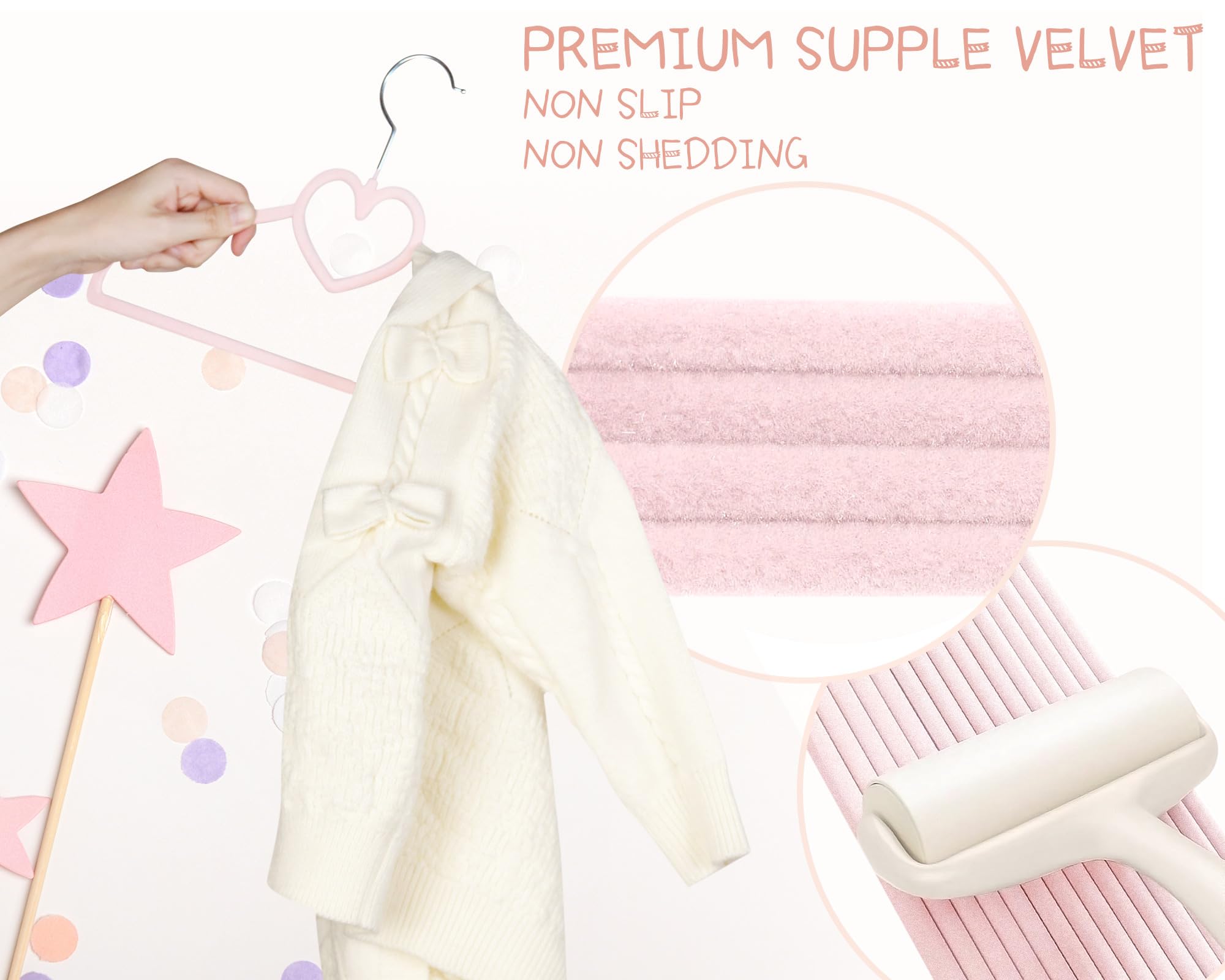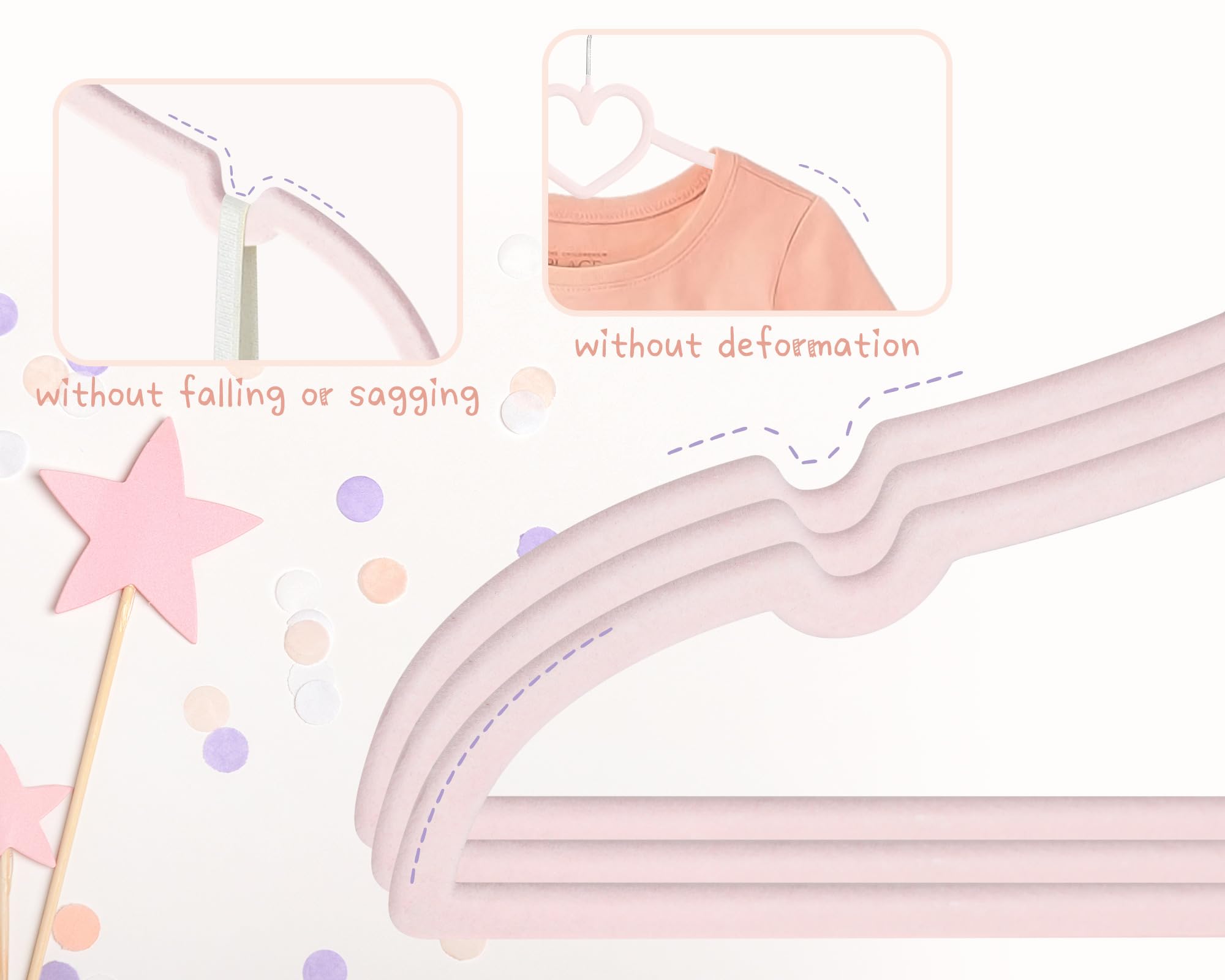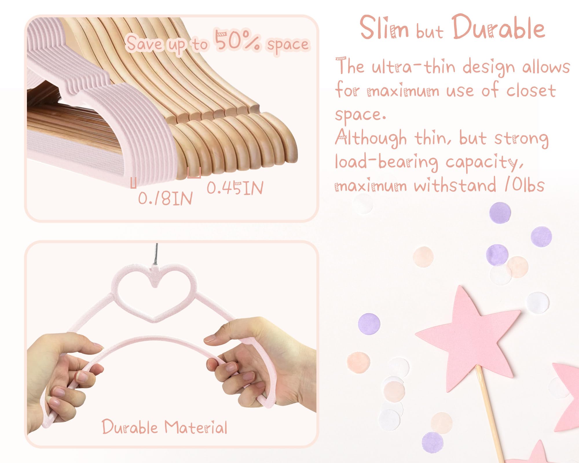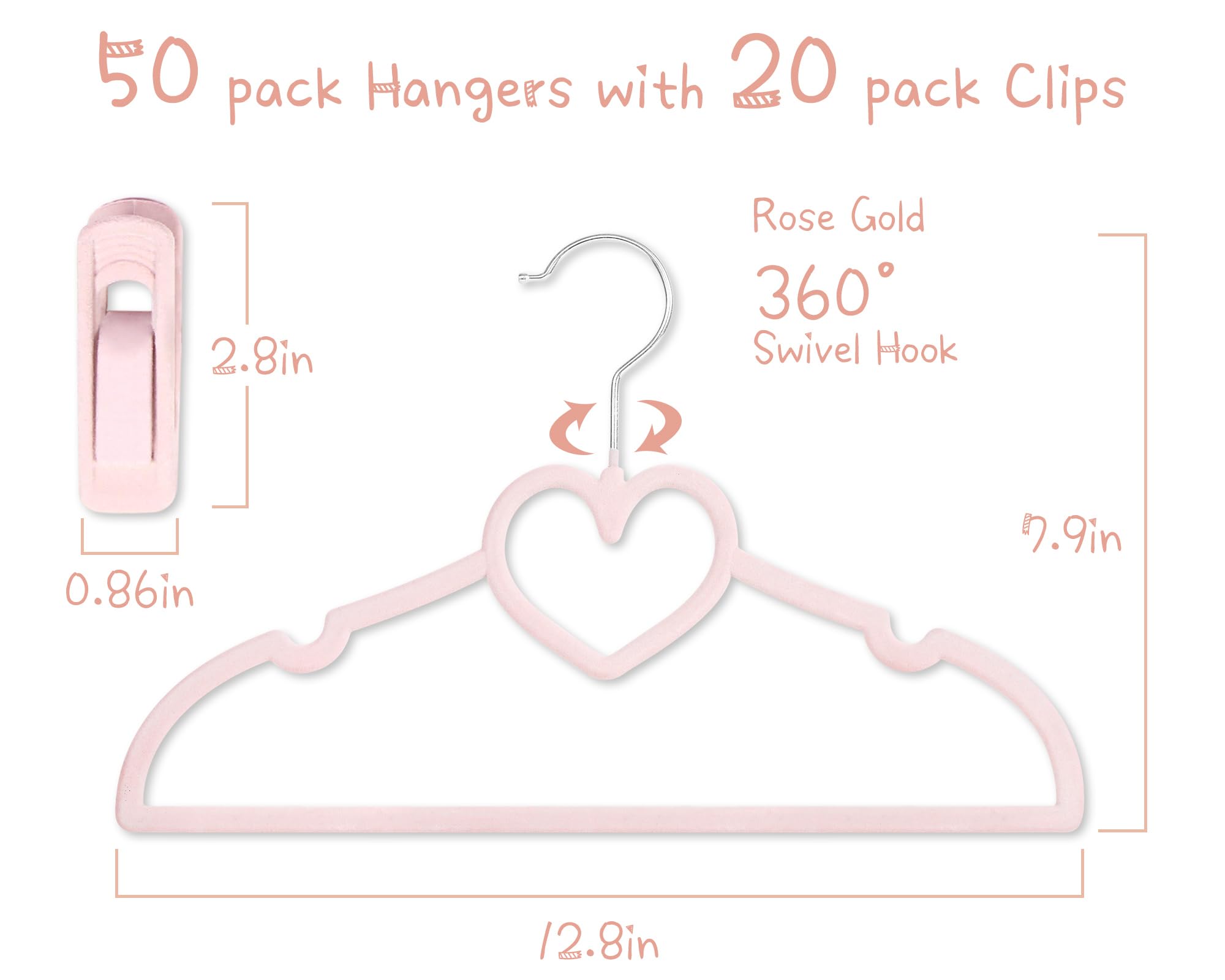 Heart Kids Hanger Size: 7.5inch*13inch*0.18inch 50pcs Pink velvet hangers and 20pcs velvet pants clips. The clothes hangers with clips use high-quality ABS material with a load capacity of 10lbs, suitable for hanging clothes all year round