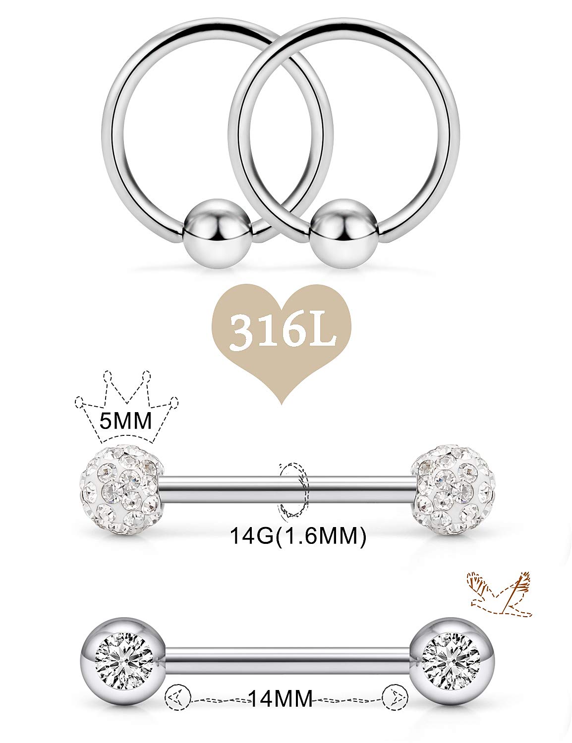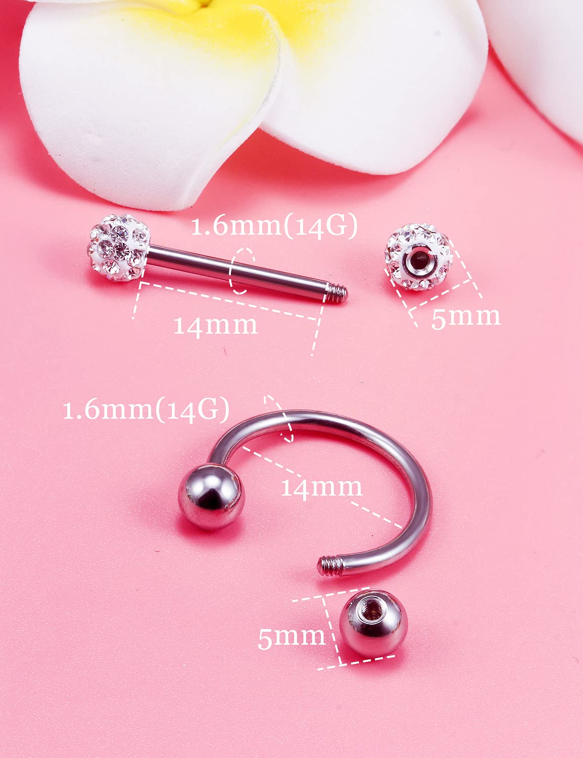 Gauge:14G(1.6mm); Bar Length and Inner Diameter:9/16 Inch(14mm); Ball Size: 5mm.