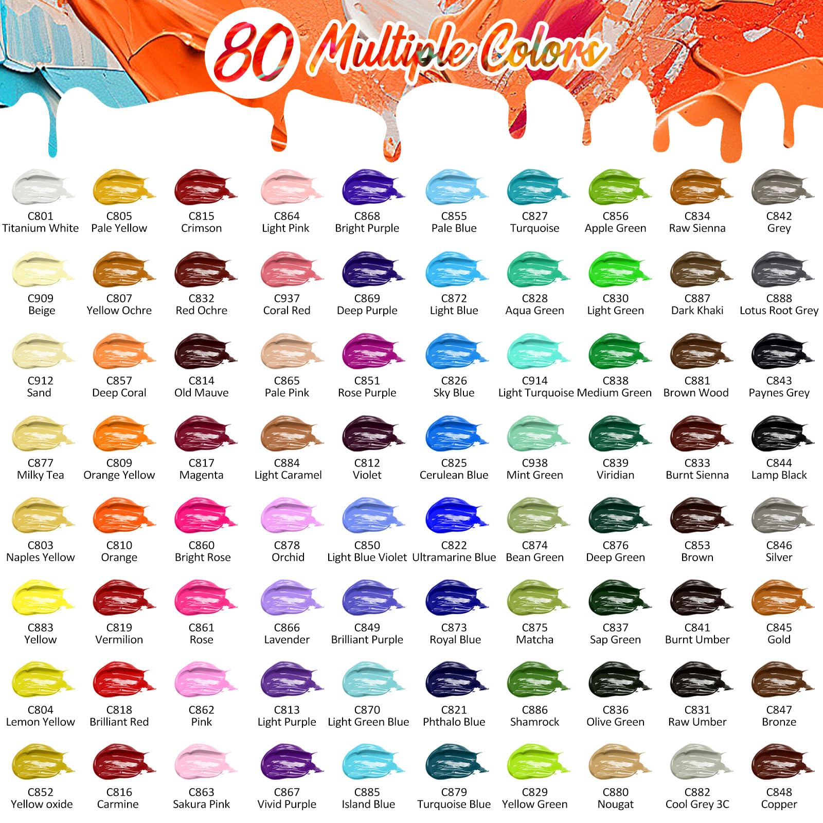 This art acrylic painting kit comes with 80-pack, 2 oz / 59ml bottles in the classic colors set fire to your imagination. Premium acrylic paint kit features smooth, highly pigmented color to produce true, consistent shades.