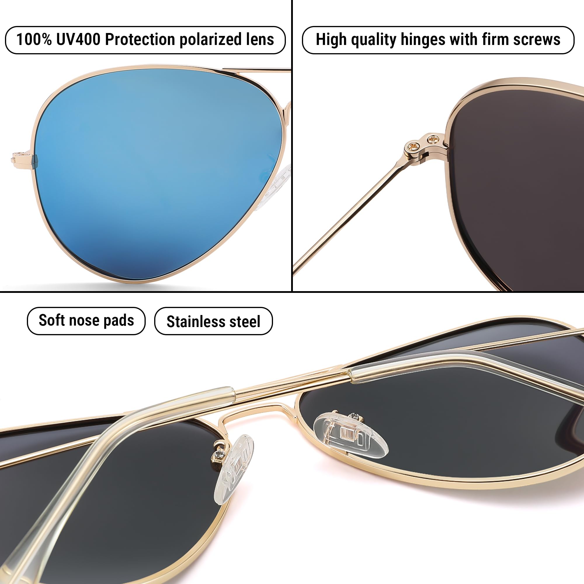 Polarized Protection: During outdoor activities, high-quality polarized glasses provide 99.9% UV400 protection and efficiently decrease glare. The classic aviator sunglasses are suitable for driving, cycling, fishing, and outdoor activities