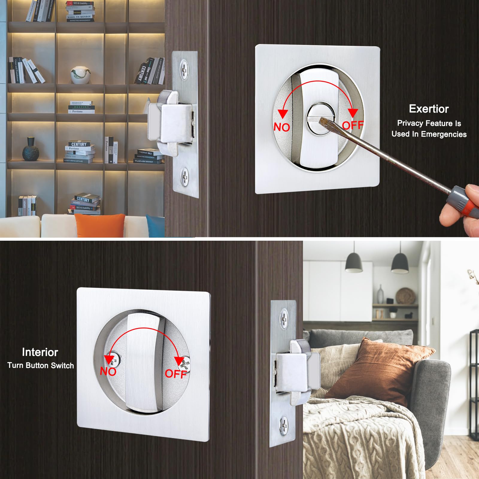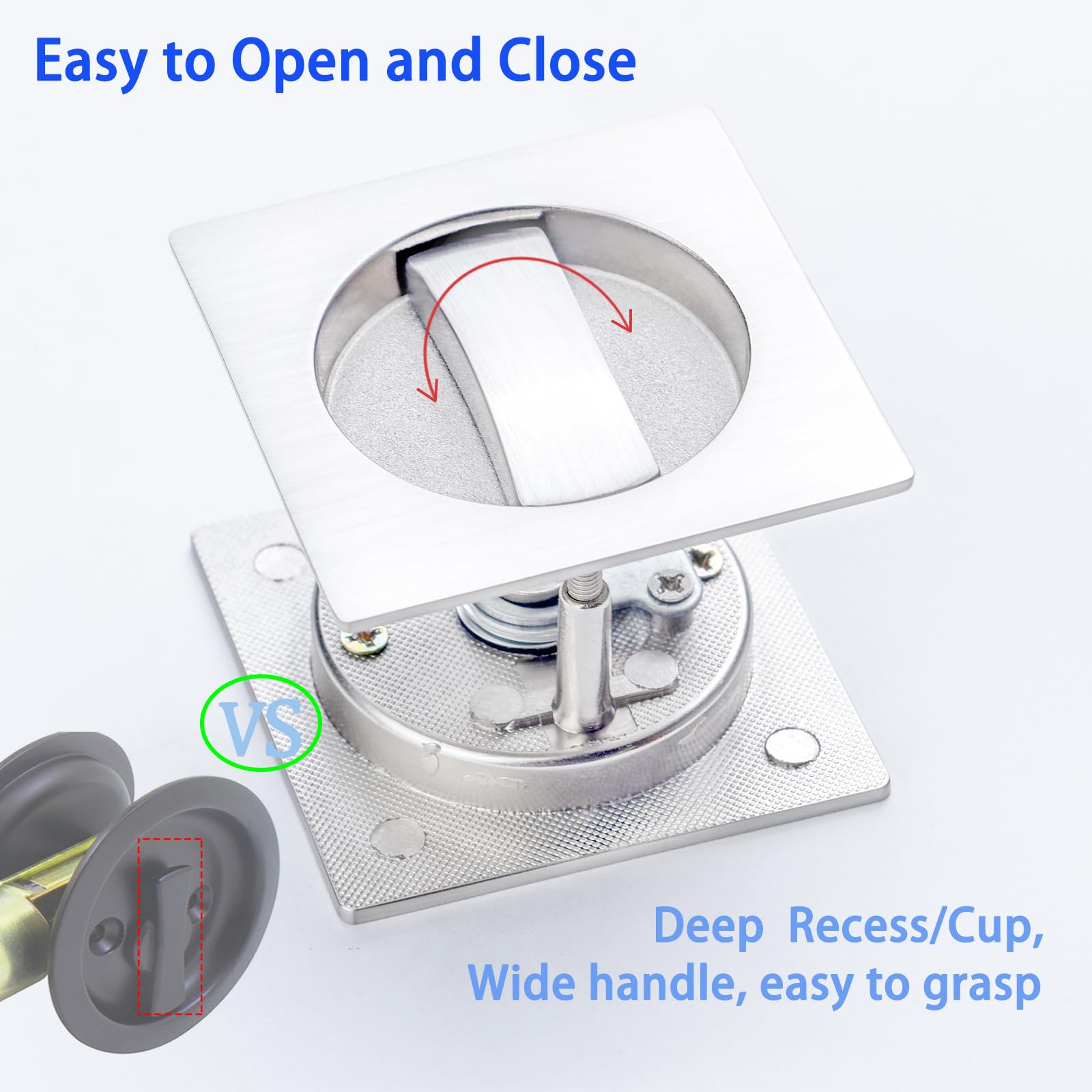 Large Locking Lever: Large locking lever make this lock user-friendly and accessible to people of all ages and abilities.This pocket door privacy lock and pull has a wide, easy grip design and is for left or right handed doors.