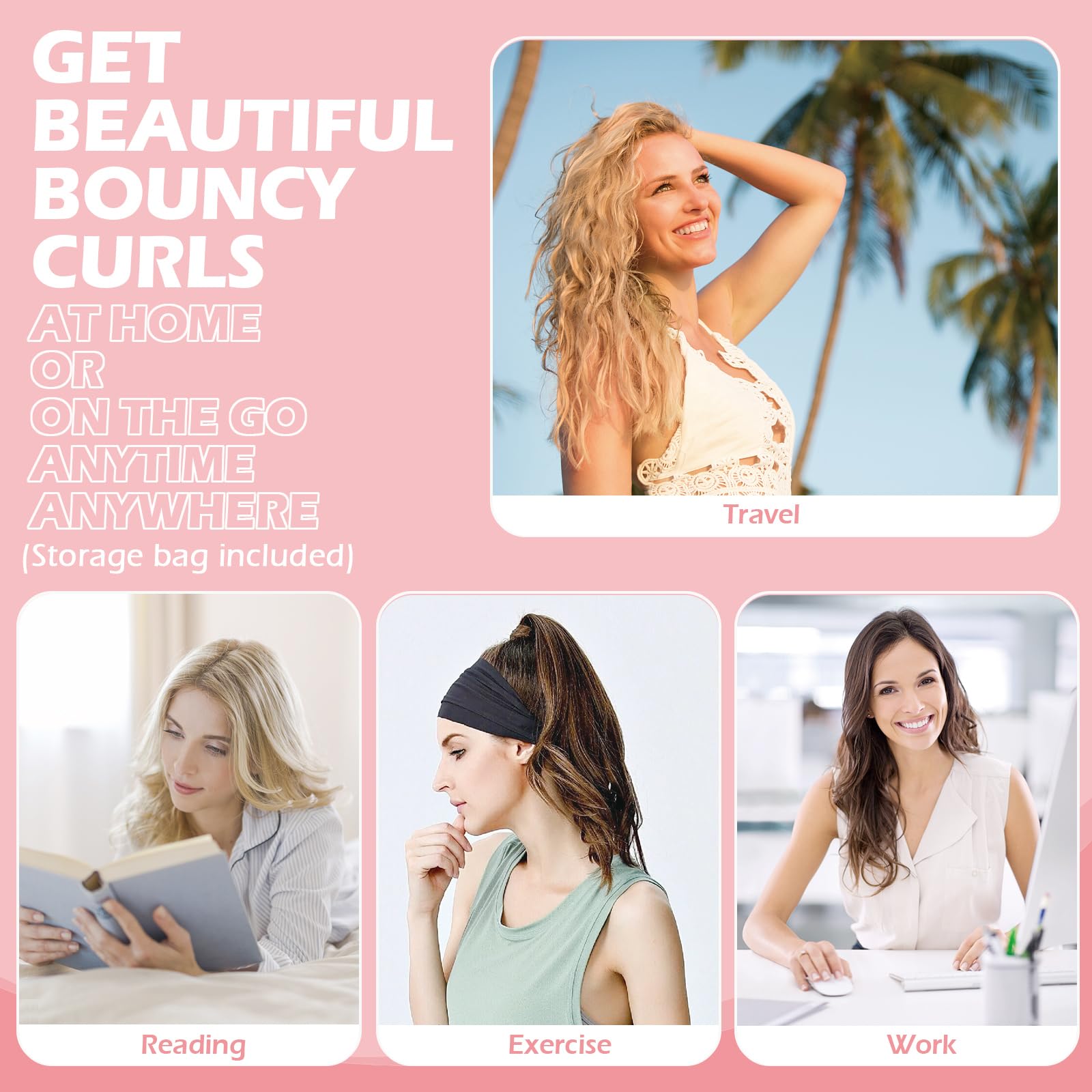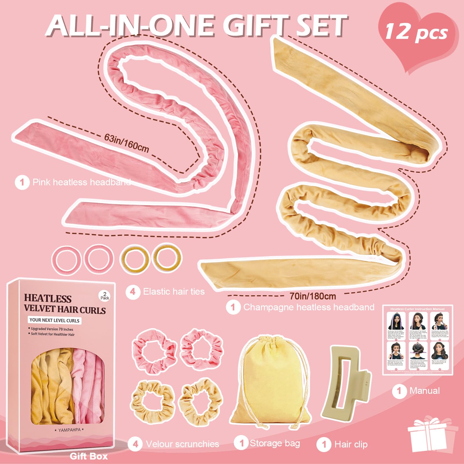 15 Pcs Hair Curlers Set: All-in-One travel hair curlers kit includes 1 x 70-inch long curling headband, 2 x velour hair ties, 4 x elastic hair ties, 1 x hair clips, 1 x rat tail comb, 1 x spray bottle, 1x yoga band, 1 x storage bag and instruction, and it's well-packed with an exquisite present box. This heatless curls headband allows you to get a beautiful wave hair any time
