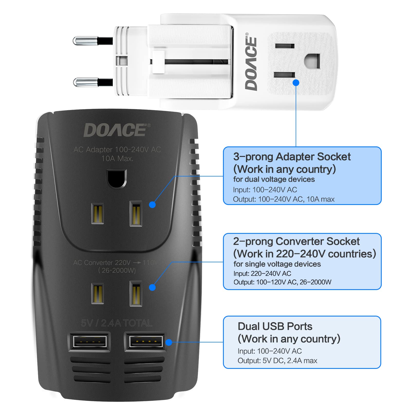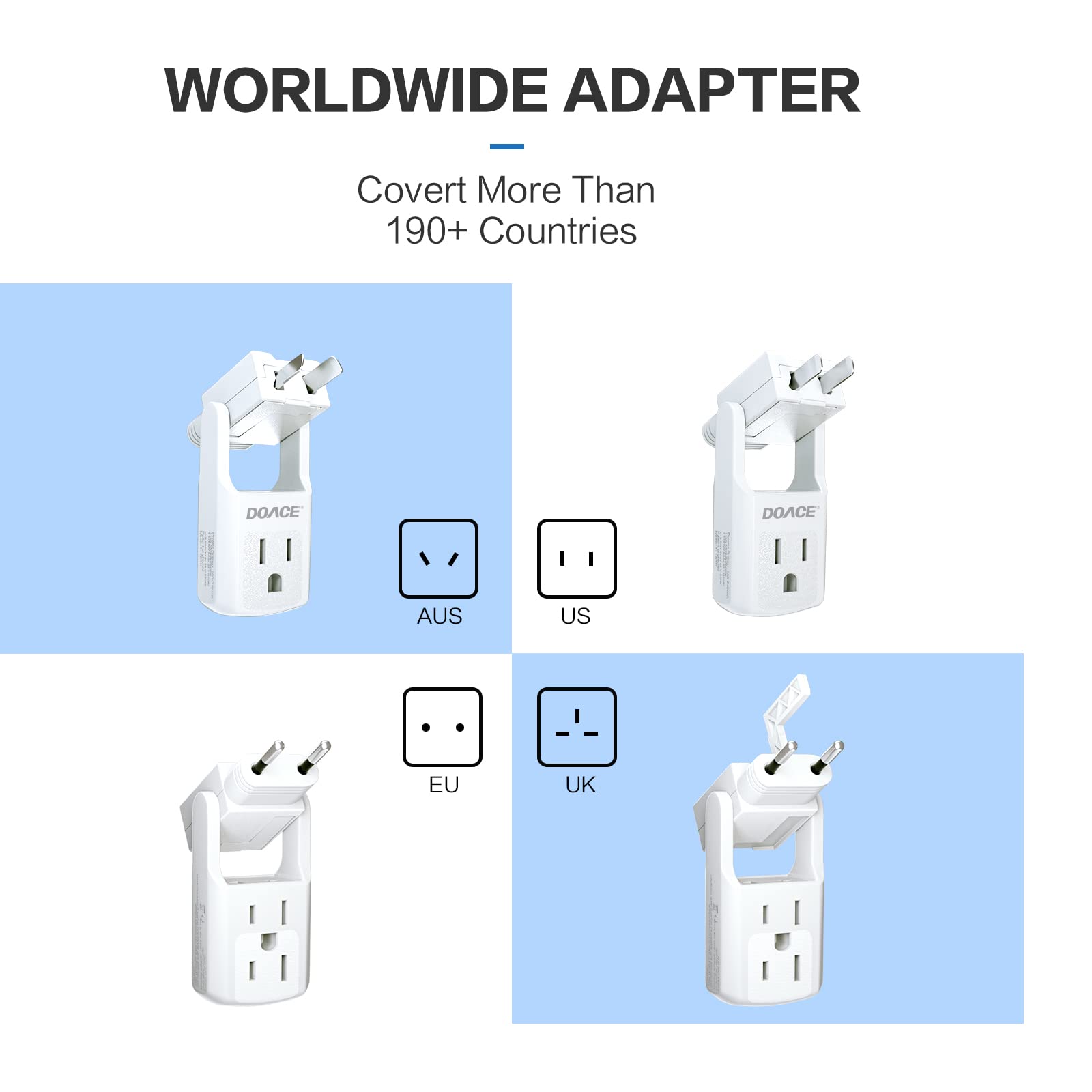 Global Compatibility: DOACE Travel Adapter Converter is built-in with a US Plug and a all-in one travel plug adapter (UK,AU,EU,US). This adapter can be used with dual voltage devices under 2000W in all countries), allowing to be used in over 190 countries, such as Ukraine, Mexico, Thailand, Vietnam, Bali, Cambodia, Germany, Japan, China,Korea,India,Italy,Brazil,Europe, Asia, the Middle East, Etc.