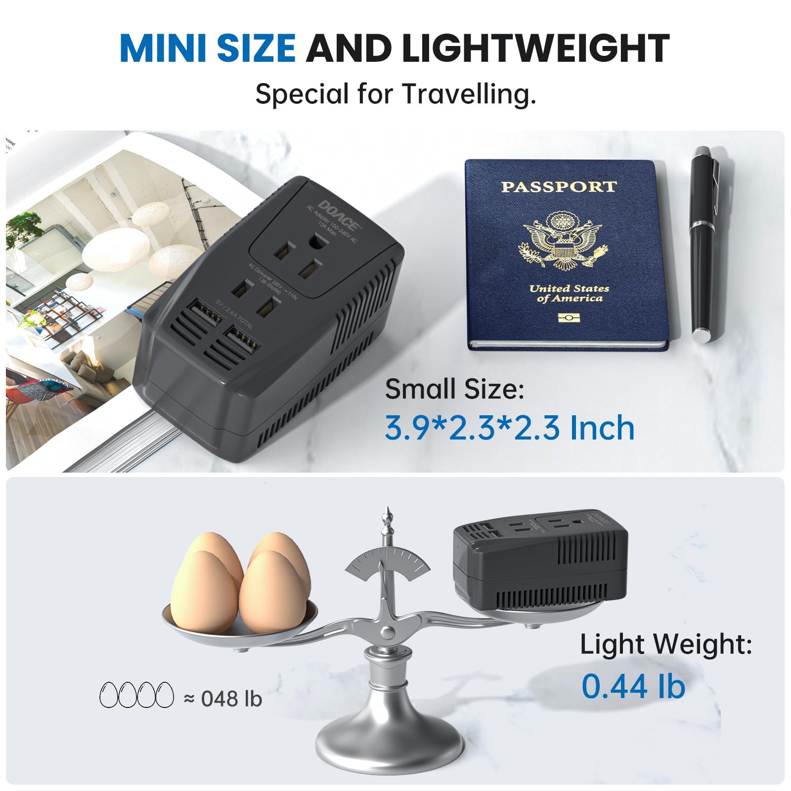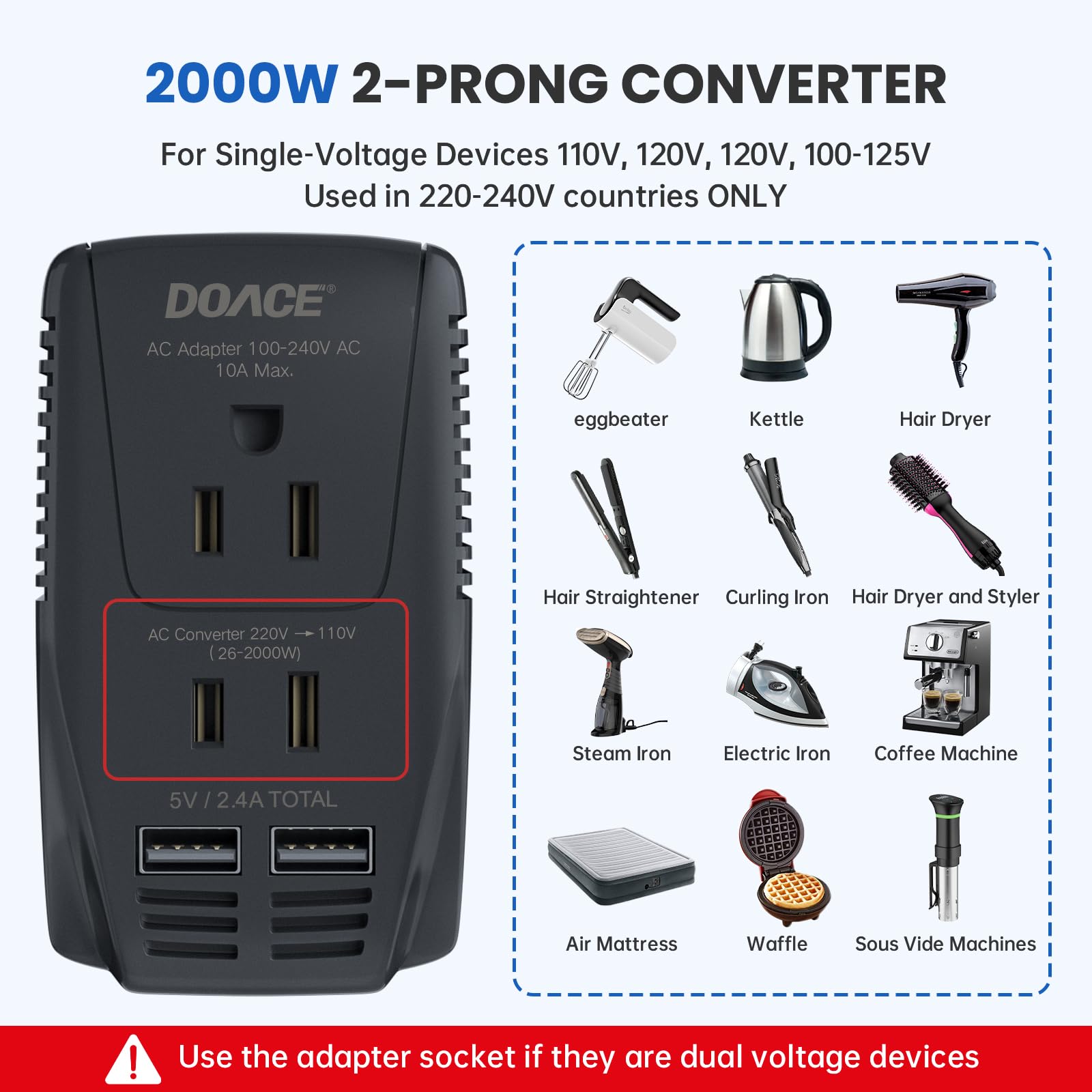 Upgraded 2000W Converter for 110V Devices: 2-prong AC converter socket can step down foreign voltage from 220-240V to 110V, designed for US standard devices when Americans travel to 220-240V countries, such as Conair/ babylisspro/ Revlon hair styling tools (hair straightener, flat iron, curling iron) and hair dryers, steam irons, electric kettle etc.