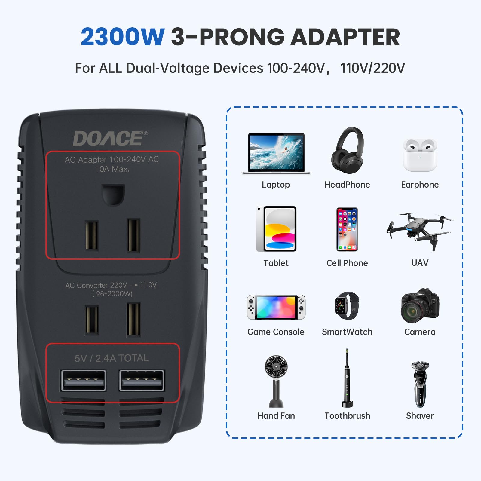 2300W Adapter for Dual Voltage Devices: 3-prong adapter socket can work with dual voltage (100-240V) devices in every country, such as cell phone, camera, iPad, laptop, Dual voltage hair tools (hair dryer, straightener, flat iron, curling iron, hair Clipper, electric shaver), Dual voltage (CPAP, electric toothbrush) and other Dual voltage devices.