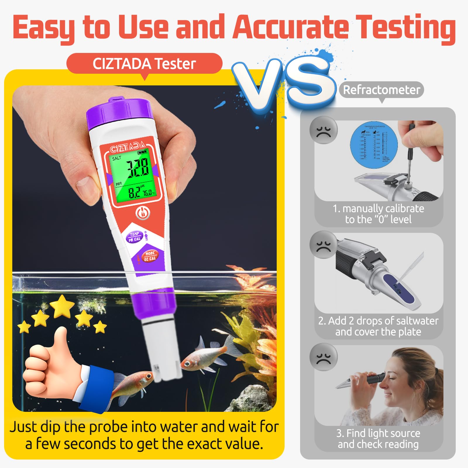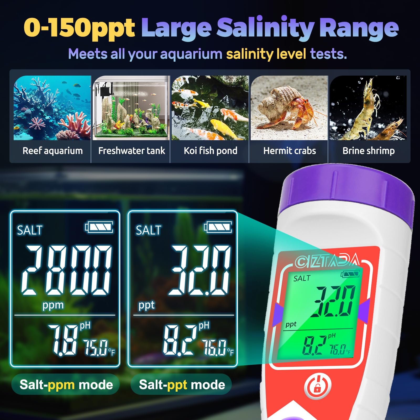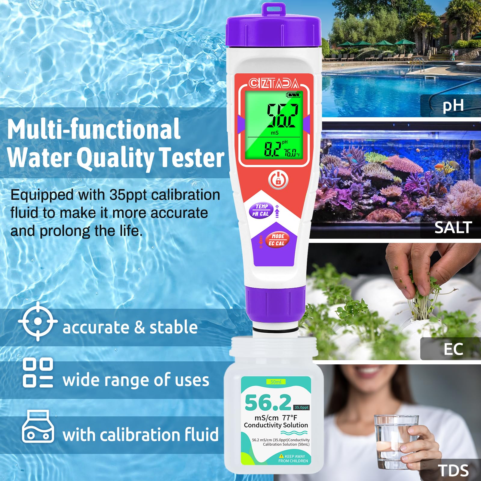 Complete Calibration Kit for Accurate Salinity Testing: This Salinity Tester for pool comes ready to use, including a 50ml bottle of 35 ppt calibration solution for keeping accuracy. The simple one-touch operation provides precise salinity and pH readings in seconds, whether you're balancing your backyard pool or spot-checking your reef aquarium or koi pond water conditions.