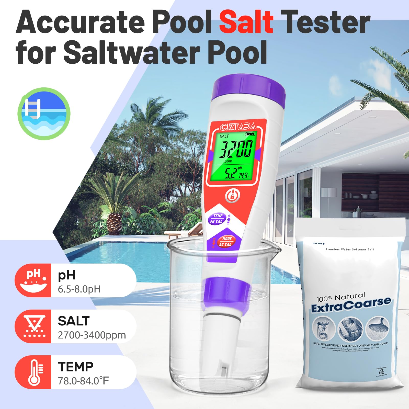 Precision Pool Salt Tester for Swimmg Pools: This advanced Pool Salt Tester features a wide salinity range of 0-9990 ppm, specifically calibrated for saltwater pools to ensure your chlorine generator operates at peak efficiency by maintaining ideal 2400-3700 ppm levels.