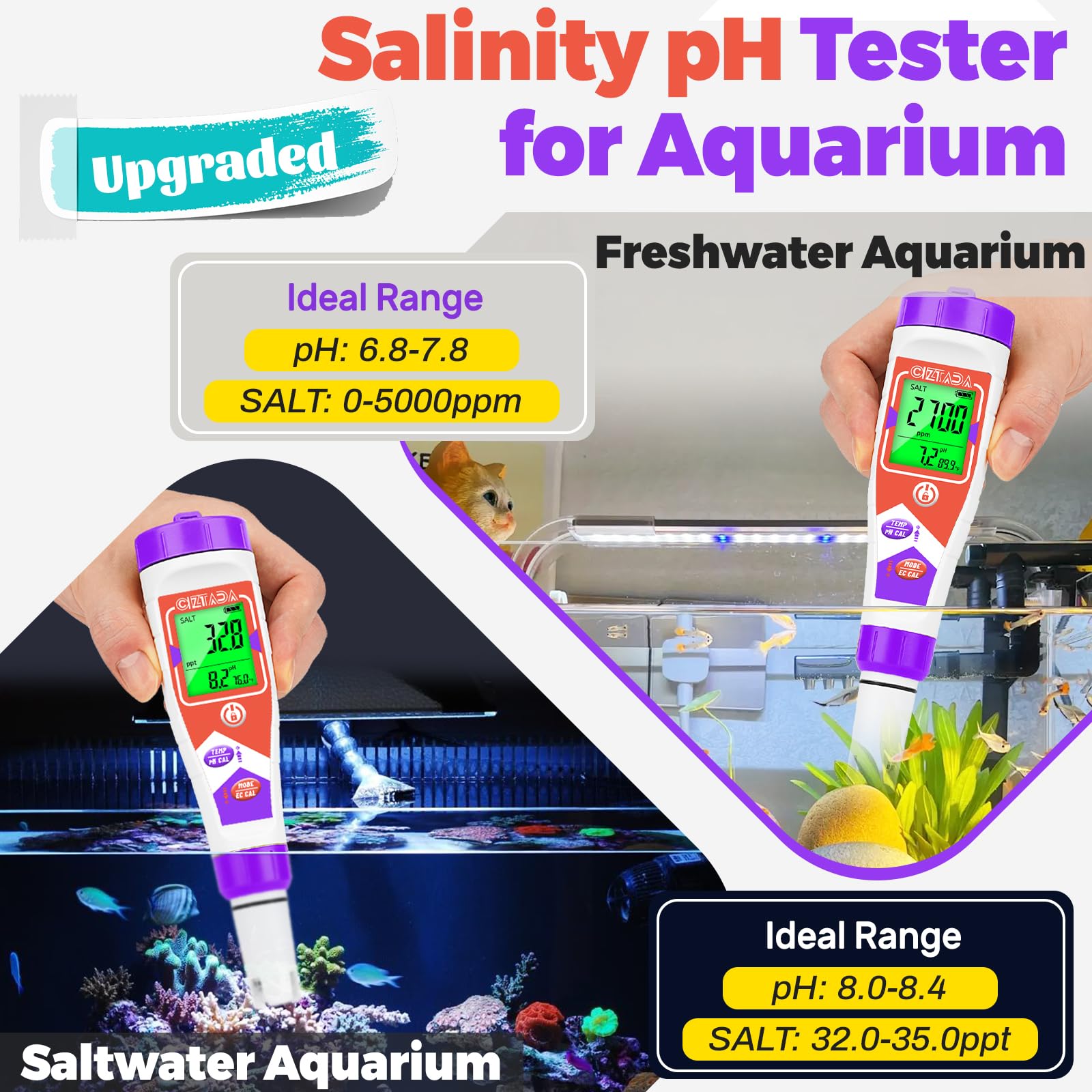 Simultaneous Salinity and pH Display for Effortless Pool Care: Specifically engineered as a Salinity pH meter for saltwater pool and hot tub systems, it uniquely displays both salinity and pH readings simultaneously, allowing you to monitor the critical balance for your chlorine generator at a glance. Perfect for swimming pools, with the versatility for koi ponds and aquariums.