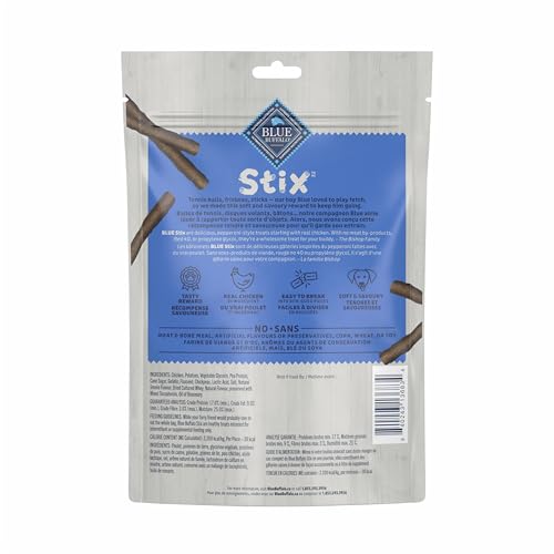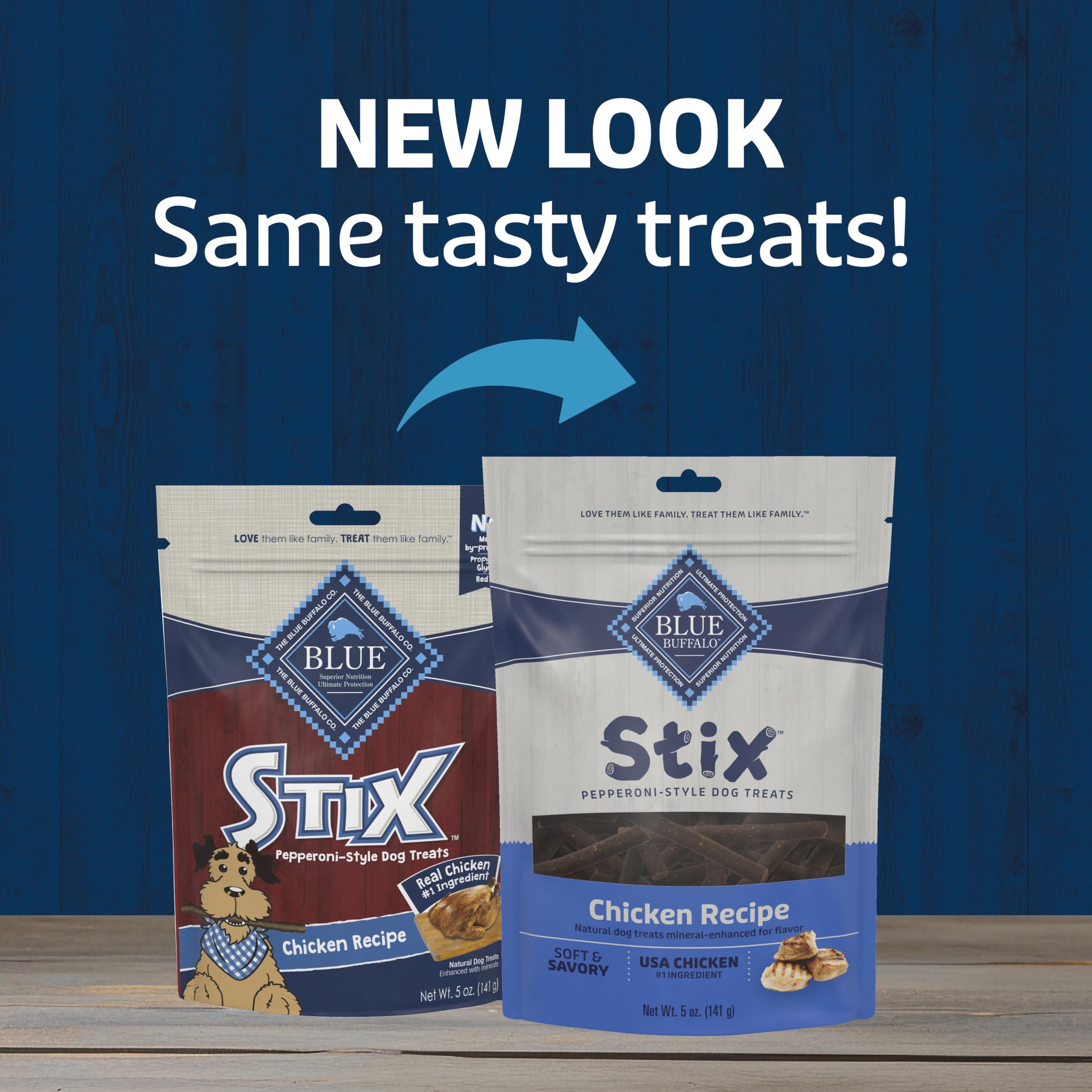Contains (1) 6-oz bag of BLUE Stix Natural Soft-Moist Dog Treats Chicken Recipe