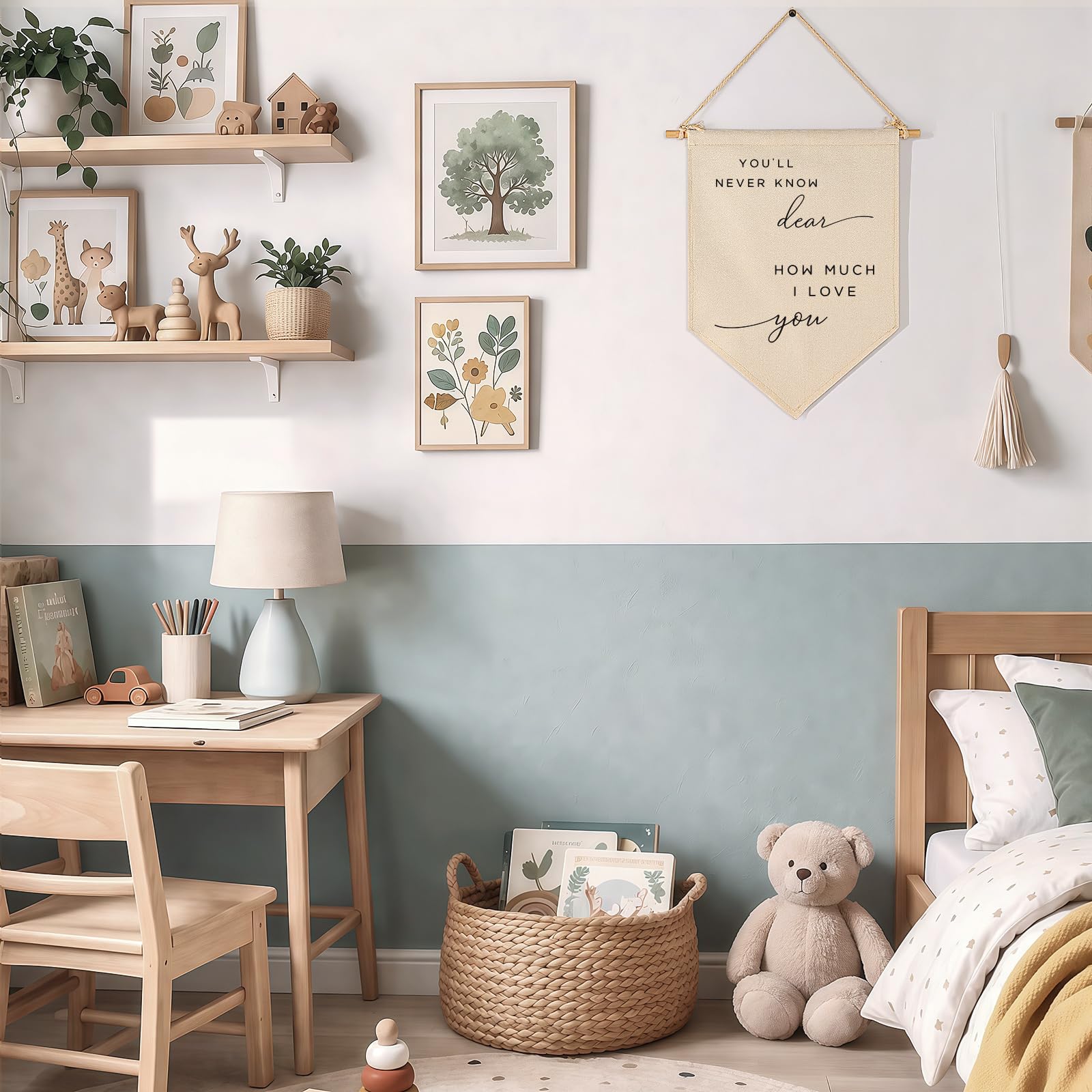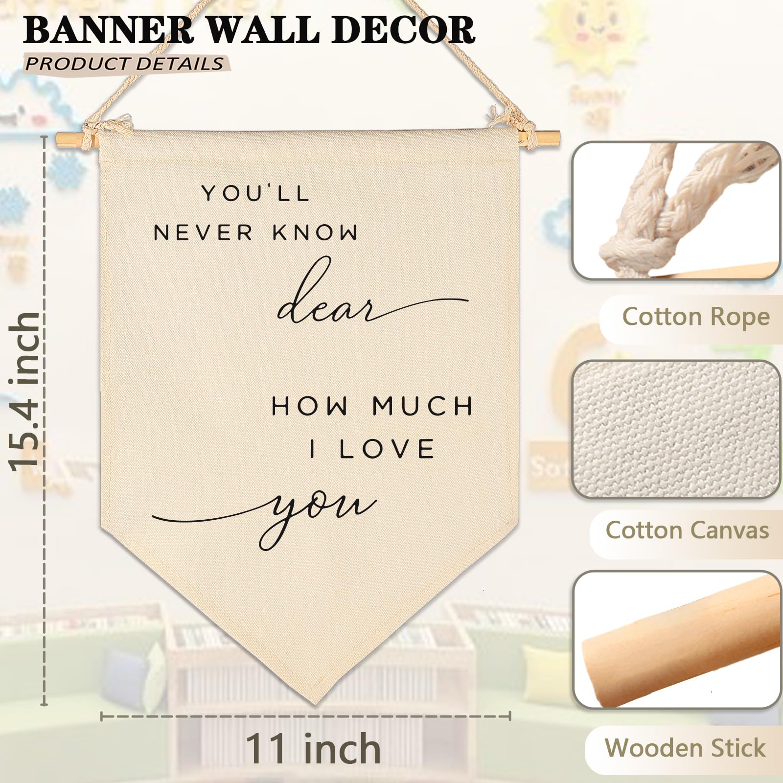 Crafted from natural cotton canvas, this 15.4 x 11 inch nursery wall banner brings a soft and calming touch to baby room, above crib or toddler space. The durable fabric keeps its shape with a natural texture, while the clear print stays bright with everyday use. Lightweight and easy to hang, it comes with a wooden dowel and pre-tied twine for quick setup on walls, doors or shelves. The versatile size fits small spaces without feeling crowded, making it perfect for creating a cozy nursery atmosphere. A thoughtful gift for baby showers, newborn arrival or first birthday.