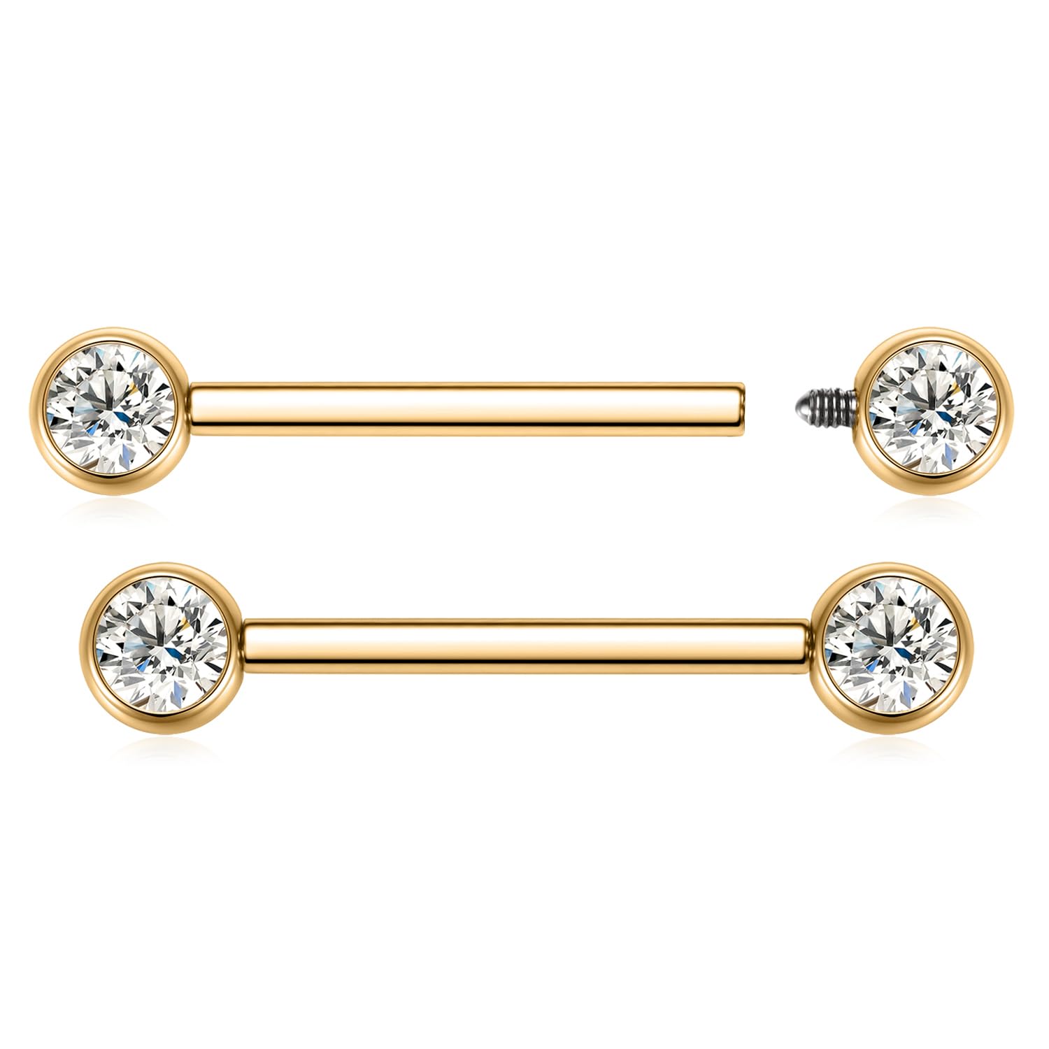 Size and Color: Gauge: 16 G=1.4 mm, Nipple Barbell Length: 11/16"(18mm). CZ Size: 5mm. Color: Gold+Clear CZ