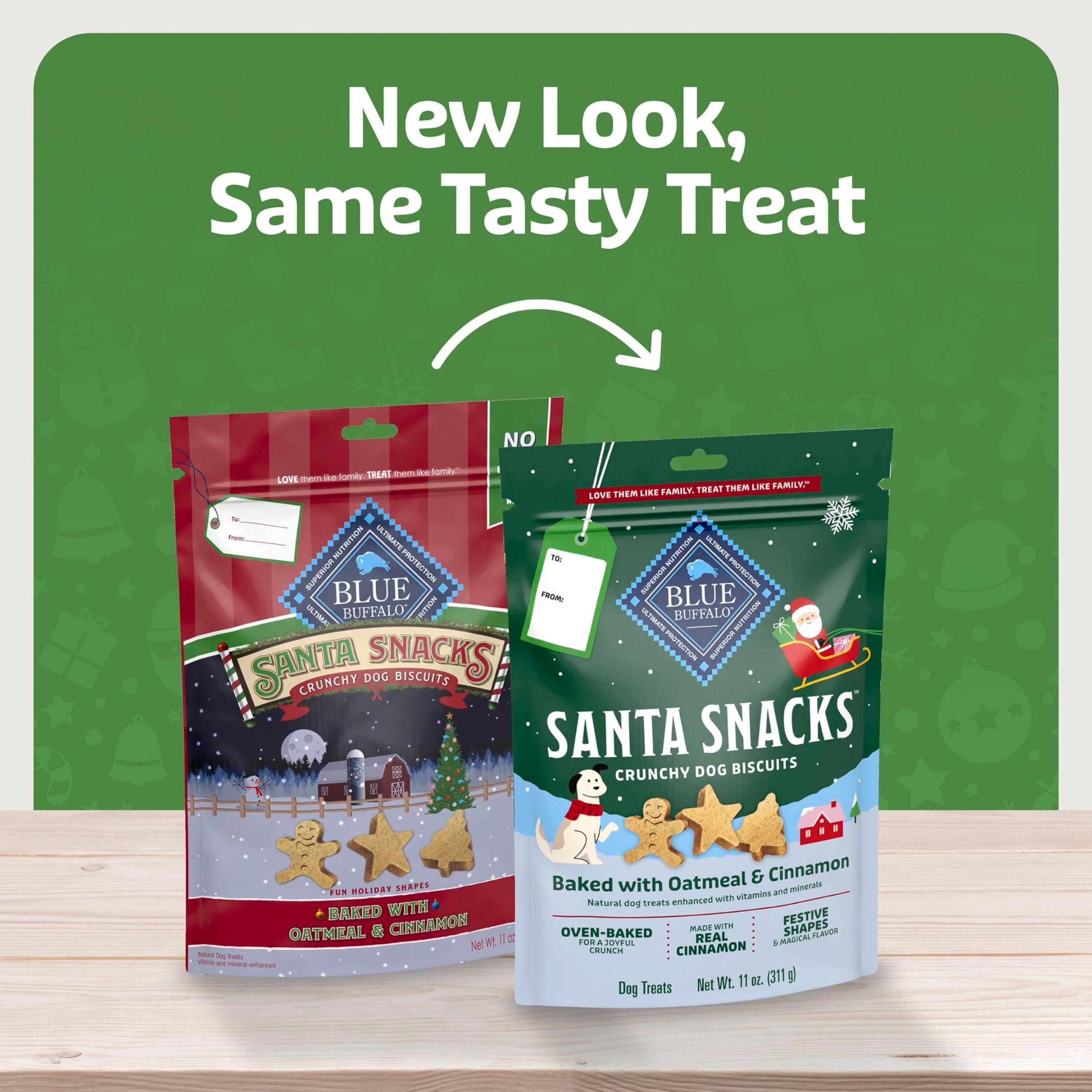 Contains: One (1) 11-oz bag of BLUE Santa Snacks Natural Crunchy Dog Treats Biscuits, Oatmeal & Cinnamon