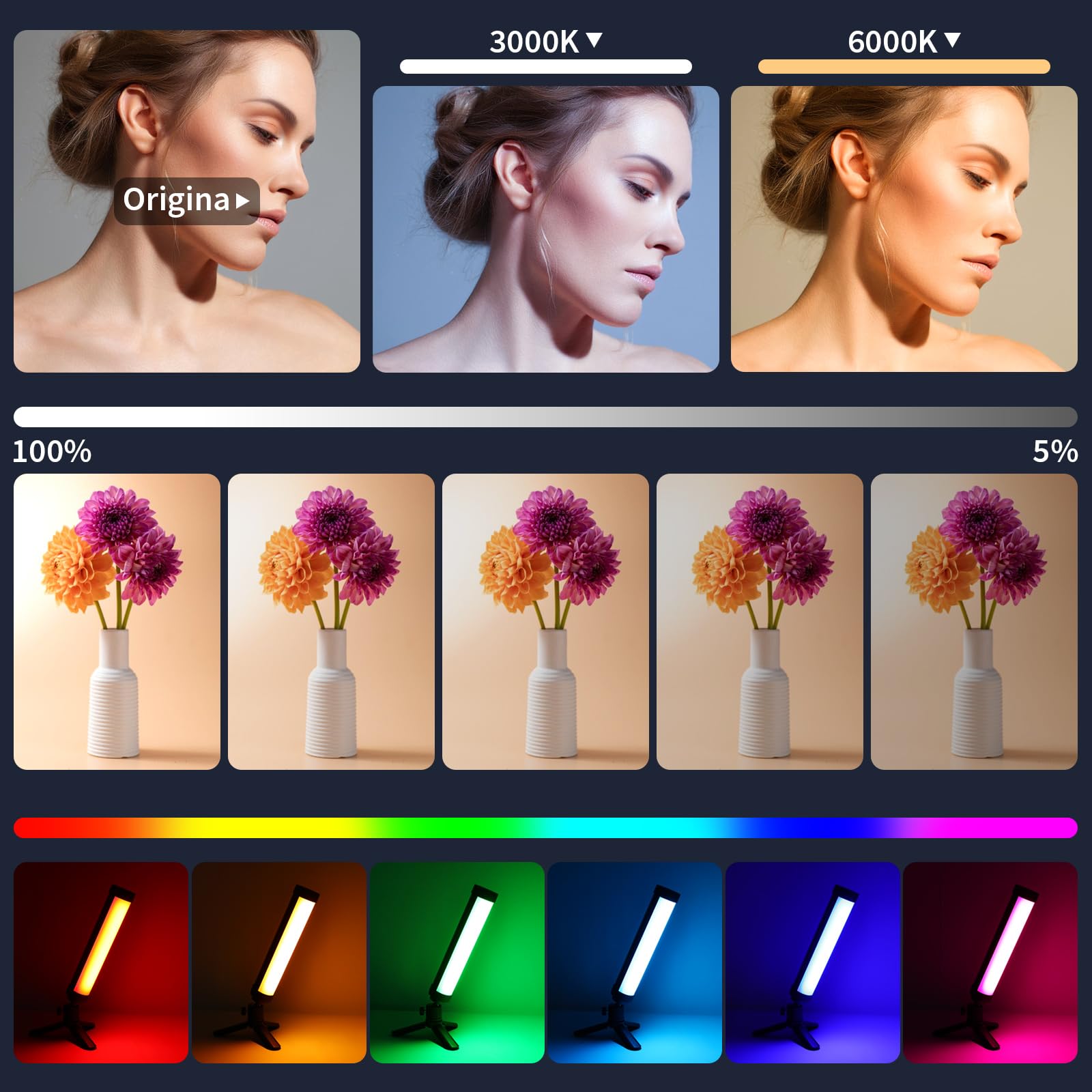 👍【RGB + Bi-color Light】 Handheld Light wand is adopted 60 high color rendering led beads and the brightness can reach 300lumen. High CRI>95+, means it can illuminate the closest color of sunlight and ensure its light is natural lifelike. Bright and Soft. Support CCT mode, brightness, color adjustment and 4 scene light effects. No flickering